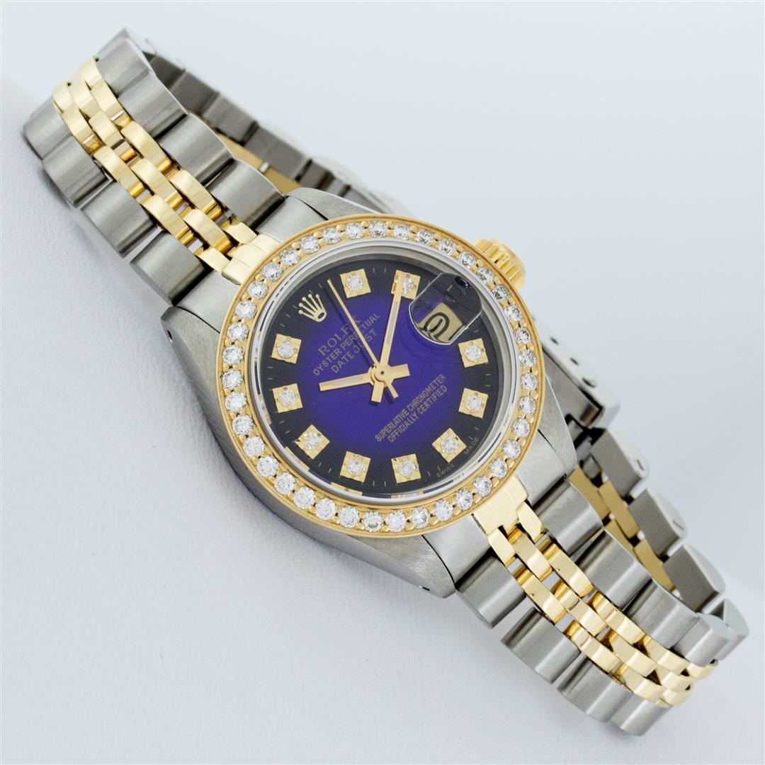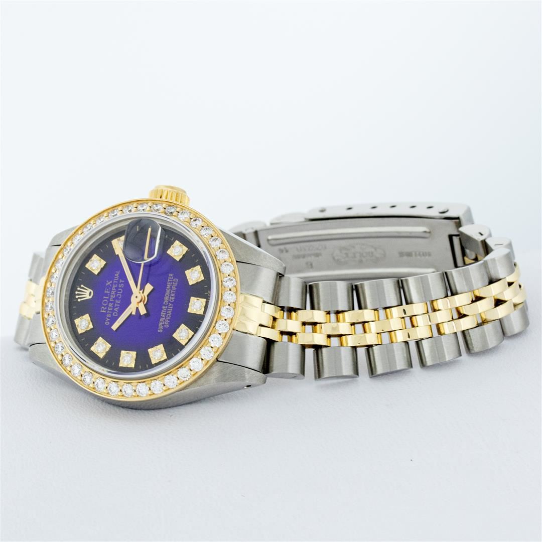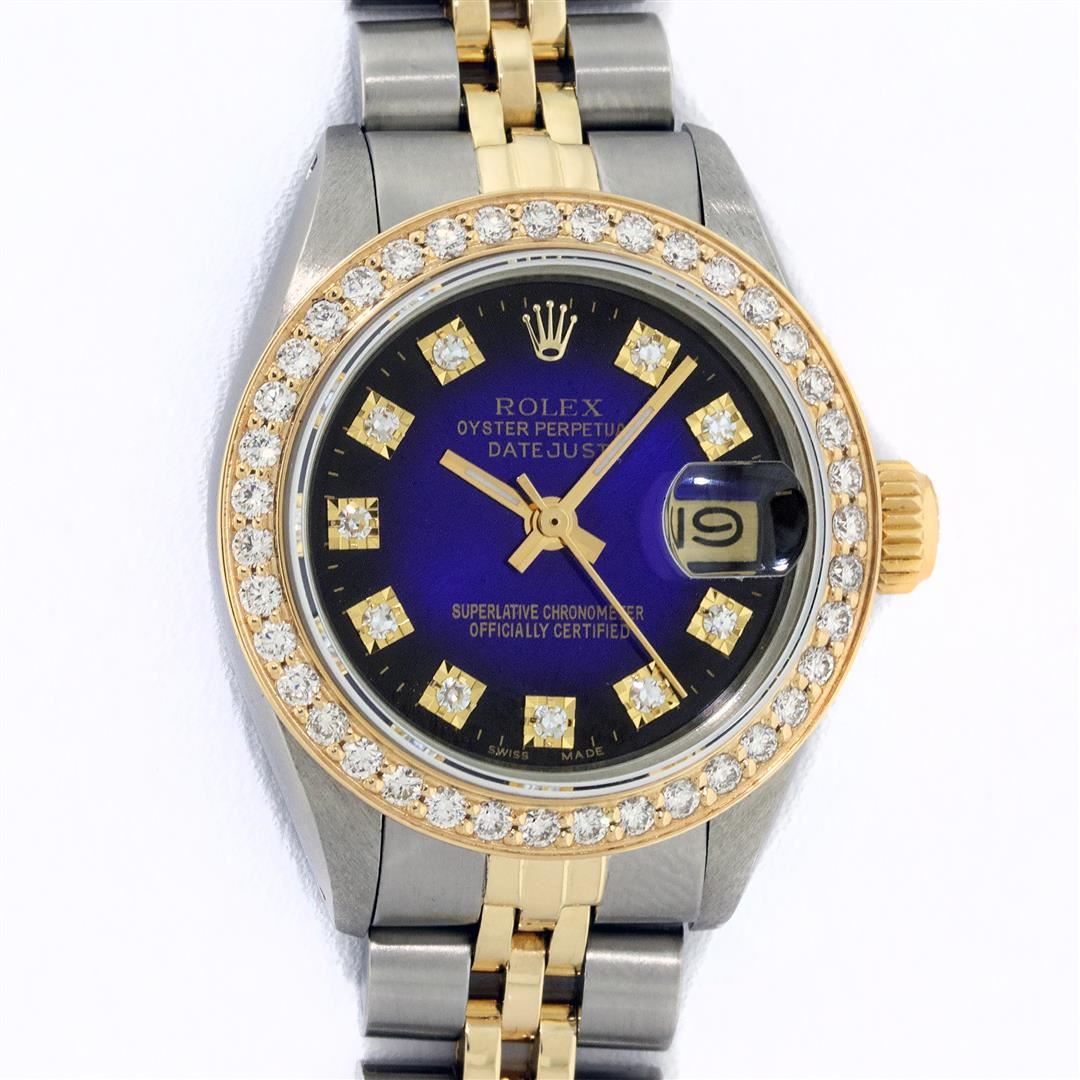 One Ladies Two Tone Rolex Datejust Polished, Serviced & Electronically Tested, Yellow Gold & Stainless Steel Case: 26mm, Yellow Gold Crown, Custom Bezel: New 18K 1ctw Yellow Gold Beadset Diamond Bezel, Diamond Count: 42 Diamonds, Total Weight 1.00 Carat, Clarity: SI-VS, Color: G to H. Custom Crystal: New Synthetic Sapphire Cyclops Lens. Custom Hands: New Luminescent Hands. Movement: Automatic Winding Movement. Custom Dial: Blue Vignette VS Diamond Dial, Diamond Count: 10 Single Cut Diamonds in Dial, G To H In Color, VS Clarity. Date Window: 3 O'Clock Position Date Display, Model: Datejust, Condition: G-6 Extra Fine. Bracelet: Two Tone Yellow Gold & Stainless Steel Jubilee. Bright Polish. 6.0 Inch Length, Adjustable. Standard Clasp, With Rolex Logo. This Watch Has Been Serviced Time Tested And Is In Excellent Condition It Is Free Of All Scratches And Dents.