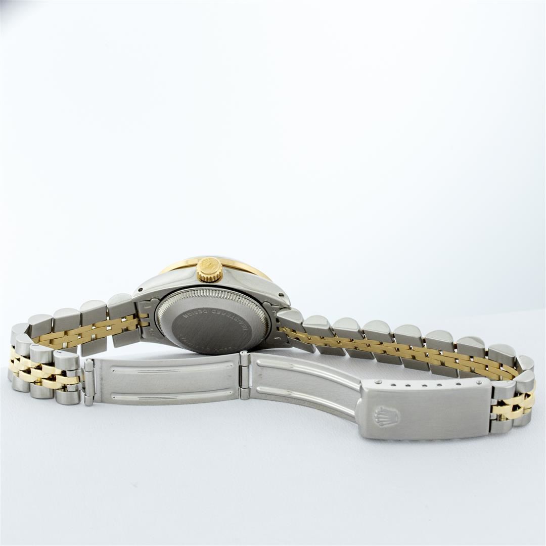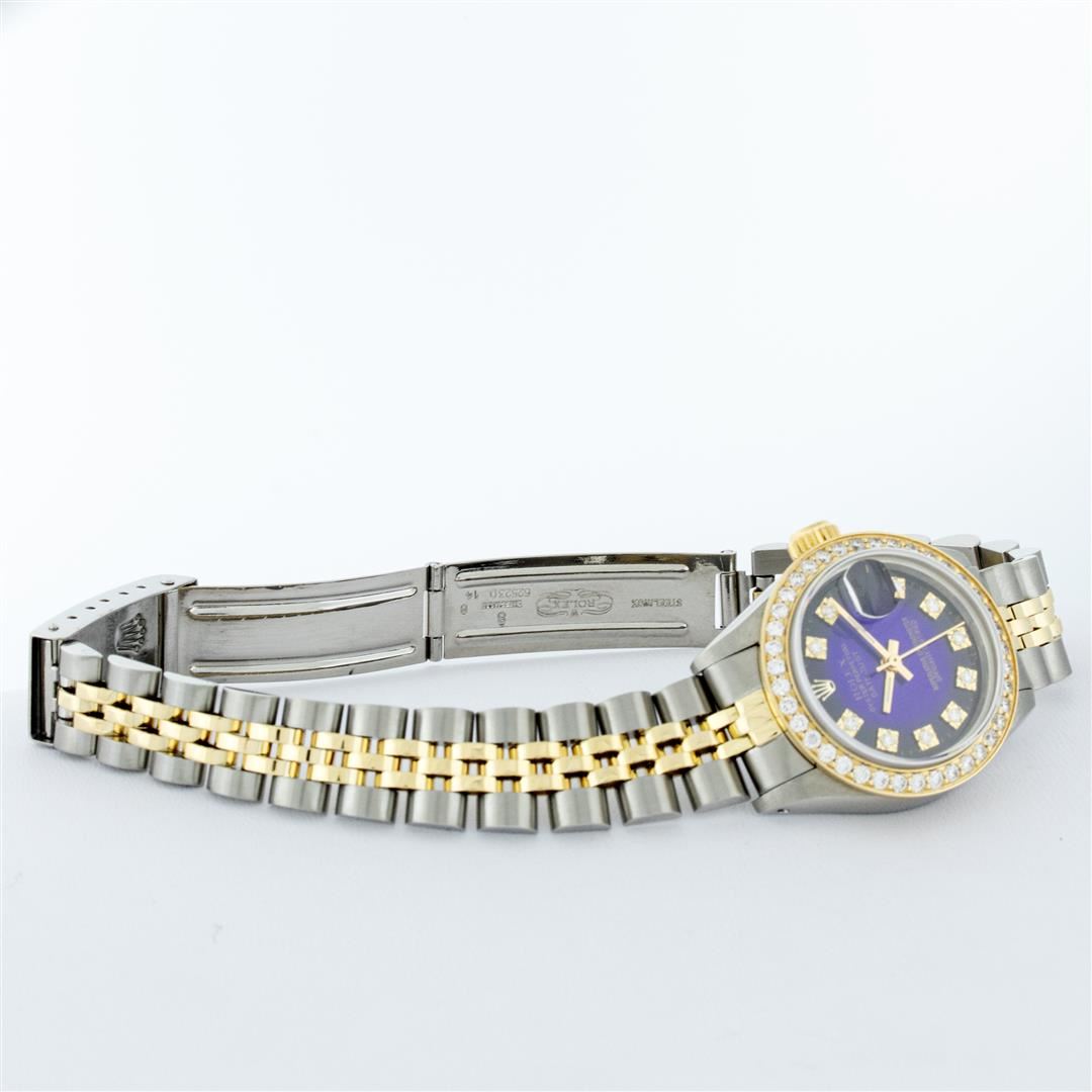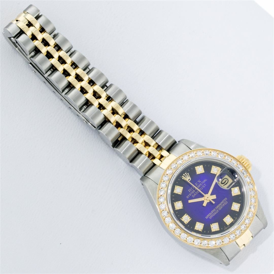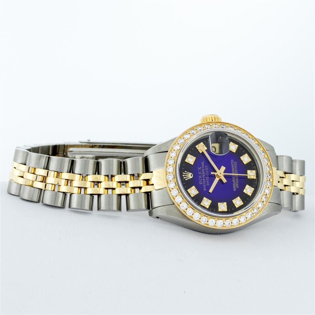 One Ladies Two Tone Rolex Datejust Polished, Serviced & Electronically Tested, Yellow Gold & Stainless Steel Case: 26mm, Yellow Gold Crown, Custom Bezel: New 18K 1ctw Yellow Gold Beadset Diamond Bezel, Diamond Count: 42 Diamonds, Total Weight 1.00 Carat, Clarity: SI-VS, Color: G to H. Custom Crystal: New Synthetic Sapphire Cyclops Lens. Custom Hands: New Luminescent Hands. Movement: Automatic Winding Movement. Custom Dial: Blue Vignette VS Diamond Dial, Diamond Count: 10 Single Cut Diamonds in Dial, G To H In Color, VS Clarity. Date Window: 3 O'Clock Position Date Display, Model: Datejust, Condition: G-6 Extra Fine. Bracelet: Two Tone Yellow Gold & Stainless Steel Jubilee. Bright Polish. 6.0 Inch Length, Adjustable. Standard Clasp, With Rolex Logo. This Watch Has Been Serviced Time Tested And Is In Excellent Condition It Is Free Of All Scratches And Dents.