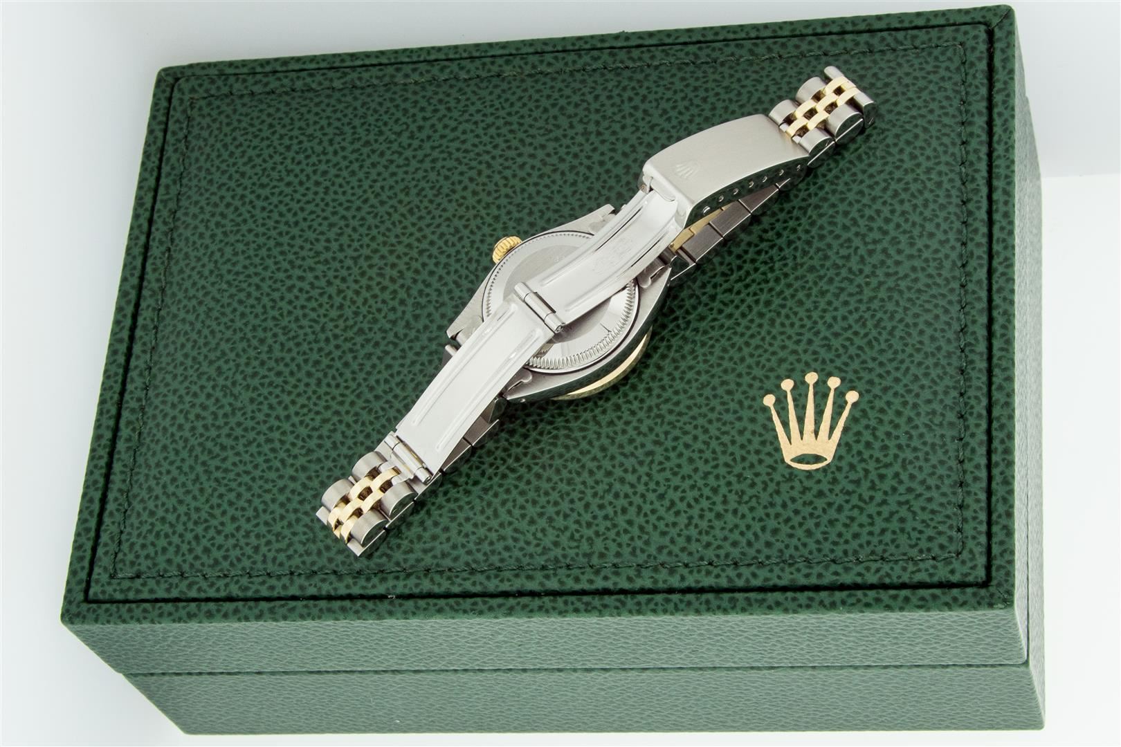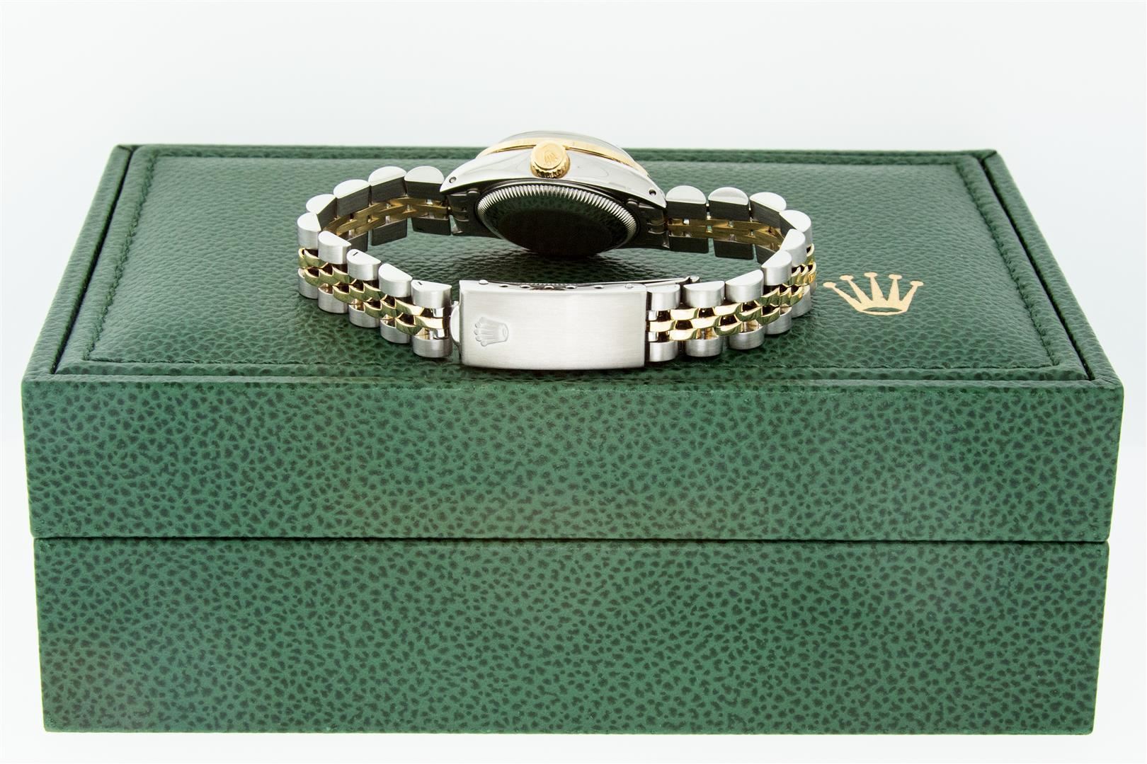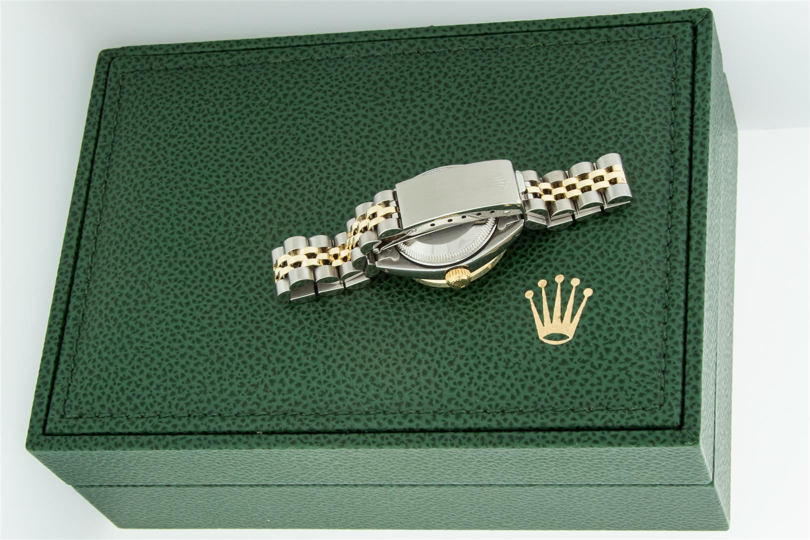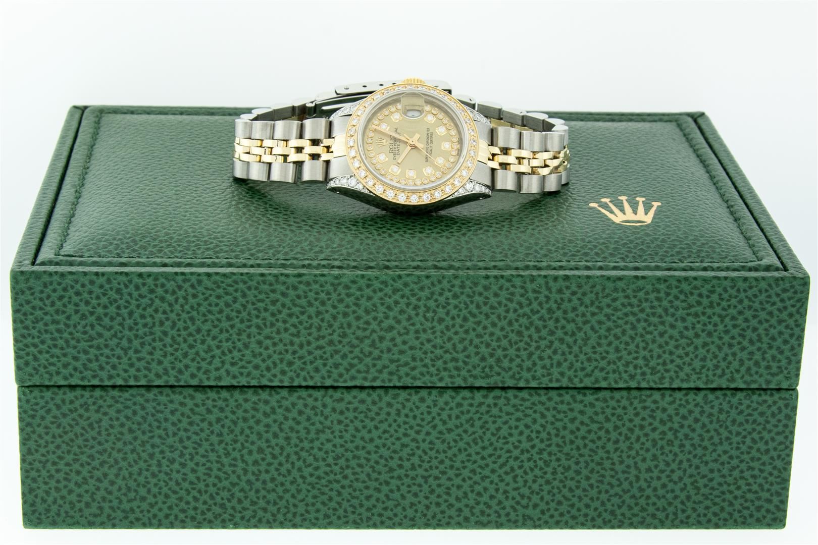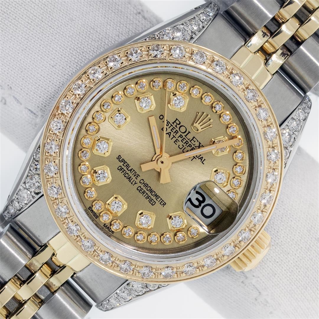 One Ladies Two Tone Rolex Datejust Polished, Serviced & Electronically Tested, Yellow Gold & Stainless Steel Case: 26mm, Yellow Gold Crown, Diamond Lugs: 24 Diamonds On Lugs, Clarity: SI-VS, Color: G to H, Clarity SI-VS. Custom Bezel: New 18K Yellow Gold Beadset Diamond Bezel, Diamond Count: 32 Diamonds, Total Weight .70 Carat, Clarity: SI-VS, Color: G to H. Custom Crystal: New Synthetic Sapphire Cyclops Lens. Custom Hands: New Luminescent Hands. Movement: Automatic Winding Movement. Custom Dial: Champagne With Diamond Hour Markers, Diamond Count: 43 Diamonds In Dial, Clarity: SI-VS, Color: G to H. Date Window: 3 O'Clock Position Date Display, Model: Datejust. Condition: G-6 Extra Fine. Bracelet: Two Tone Yellow Gold & Stainless Steel Jubilee. Bright Polish. 6.0 Inch Length, Adjustable. Standard Clasp, With Rolex Logo. This Watch Has Been Serviced Time Tested And Is In Excellent Condition It Is Free Of All Scratches And Dents. This Watch Comes With A Rolex Box.