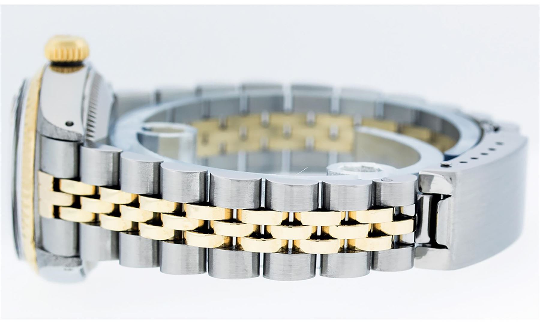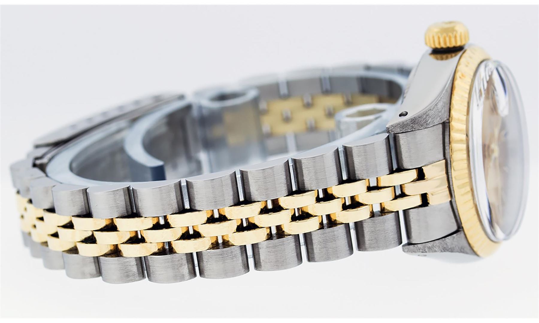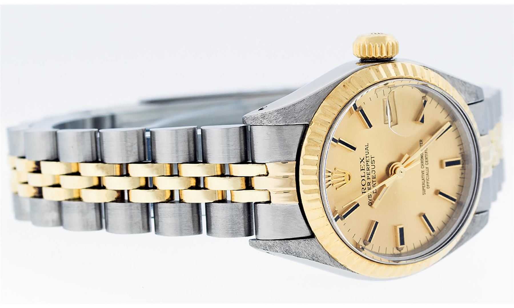 One Ladies Two Tone Rolex Datejust Polished, Serviced & Electronically Tested, Yellow Gold & Stainless Steel Case: 26mm, Yellow Gold Crown, Bezel: Yellow Gold Fluted Bezel. Custom Crystal: New Acrylic Cyclops Lens. Custom Hands: New Luminescent Hands. Movement: Automatic Winding Movement. Dial: Champagne Index With Dash Track & Lumi Dots. Date Window: 3 O'Clock Position Date Display, Model: Datejust. Condition: G-6 Extra Fine. Bracelet: Two Tone Yellow Gold & Stainless Steel Jubilee Band. Bright Polish. 6.0 Inch Length, Adjustable. Standard Clasp, With Rolex Logo. This Watch Has Been Serviced Time Tested And Is In Excellent Condition It Is Free Of All Scratches And Dents. This Watch Comes With A Rolex Box
