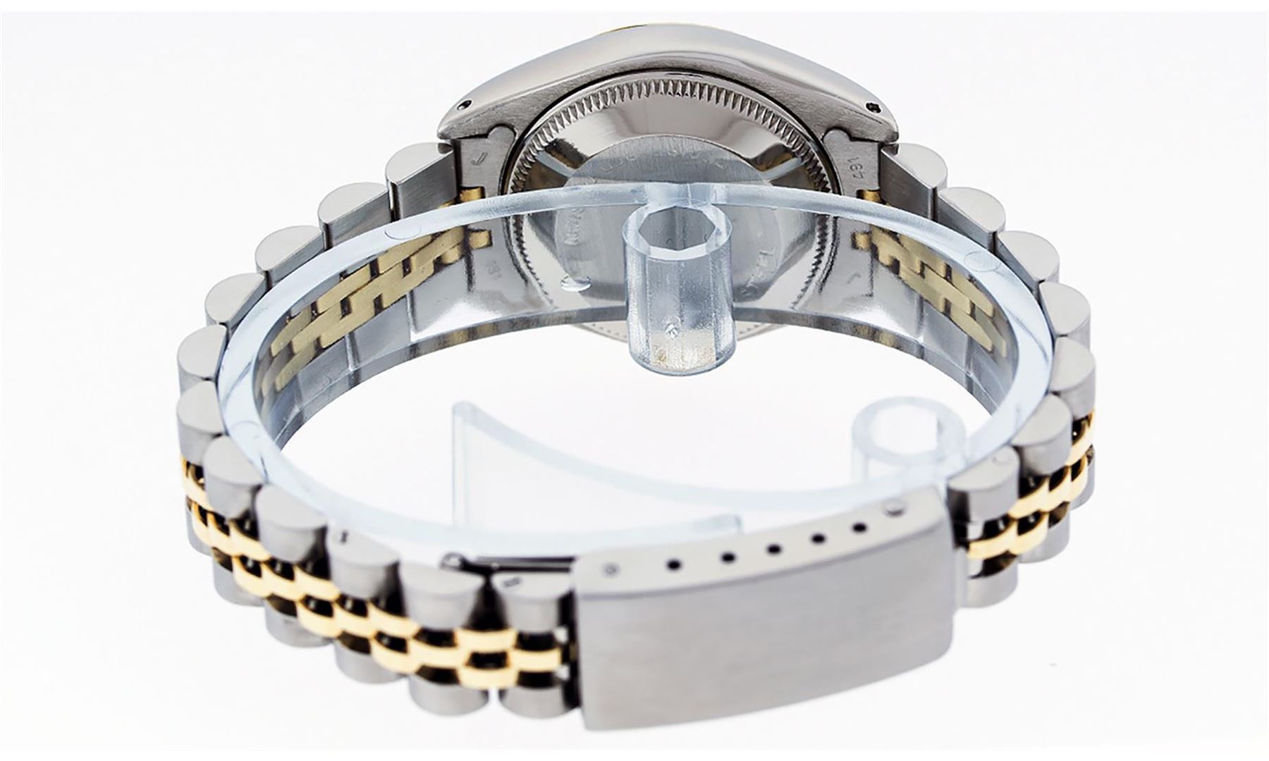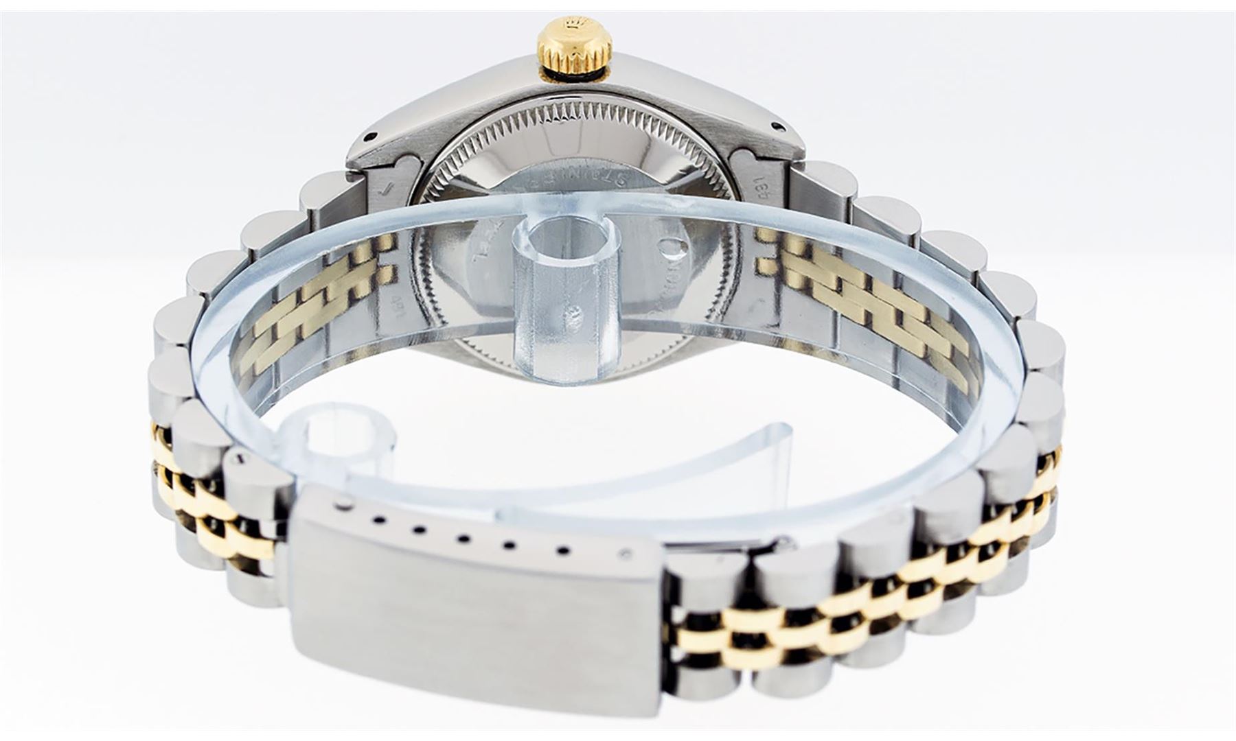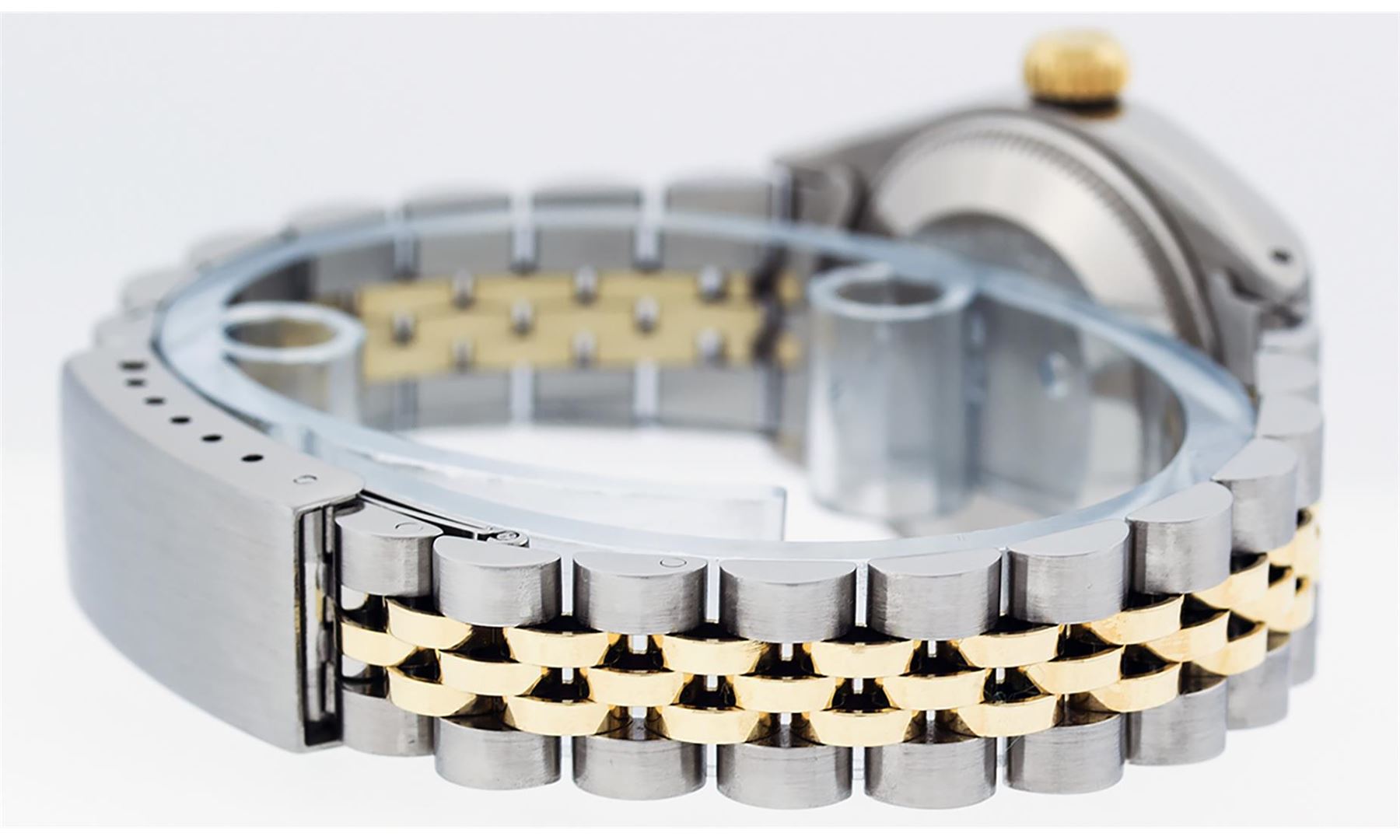 One Ladies Two Tone Rolex Datejust Polished, Serviced & Electronically Tested, Yellow Gold & Stainless Steel Case: 26mm, Yellow Gold Crown, Bezel: Yellow Gold Fluted Bezel. Custom Crystal: New Acrylic Cyclops Lens. Custom Hands: New Luminescent Hands. Movement: Automatic Winding Movement. Dial: Champagne Index With Dash Track & Lumi Dots. Date Window: 3 O'Clock Position Date Display, Model: Datejust. Condition: G-6 Extra Fine. Bracelet: Two Tone Yellow Gold & Stainless Steel Jubilee Band. Bright Polish. 6.0 Inch Length, Adjustable. Standard Clasp, With Rolex Logo. This Watch Has Been Serviced Time Tested And Is In Excellent Condition It Is Free Of All Scratches And Dents. This Watch Comes With A Rolex Box