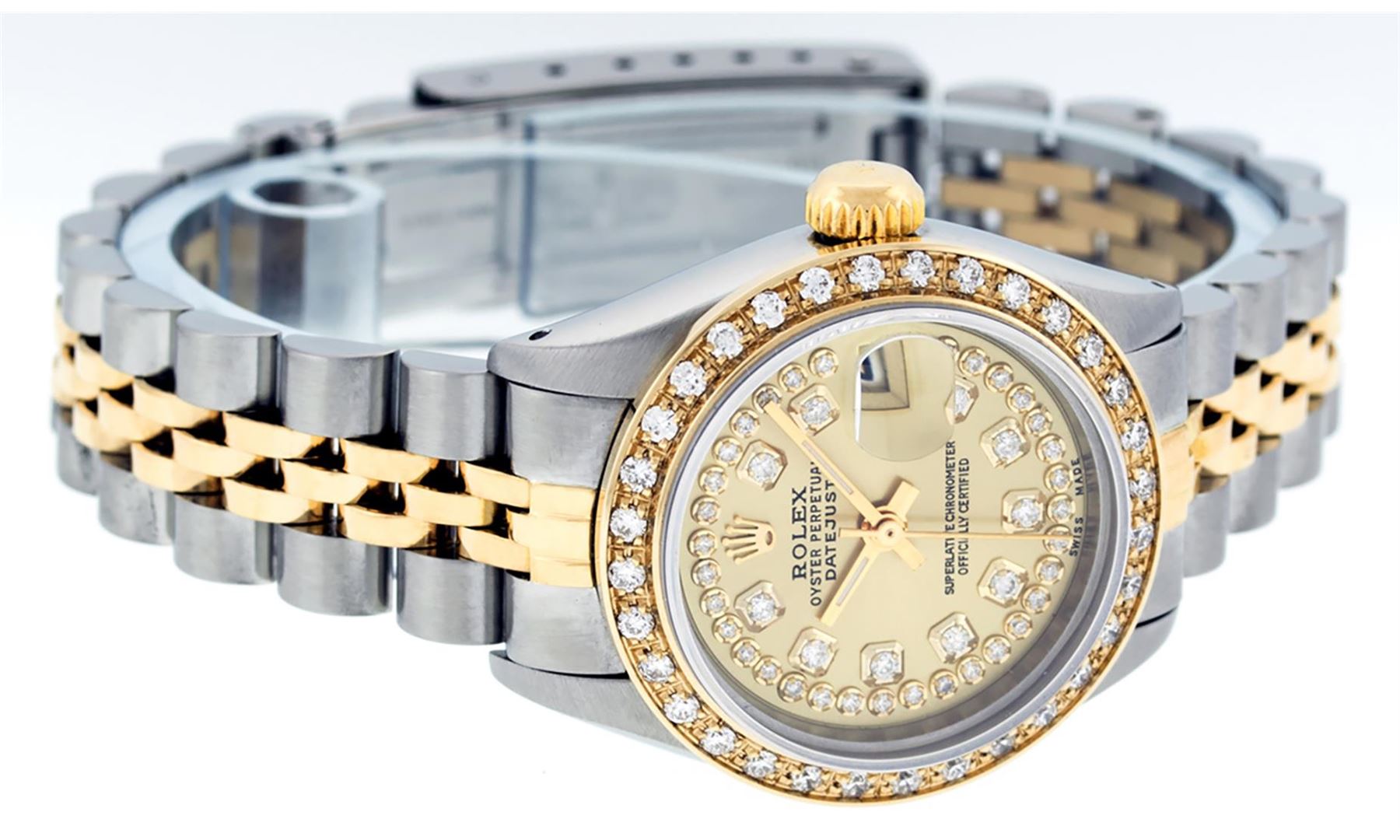 One Ladies Two Tone Rolex Datejust Polished, Serviced & Electronically Tested, Yellow Gold & Stainless Steel Case: 26mm, Yellow Gold Crown, Custom Bezel: New 18K Yellow Gold Beadset Diamond Bezel, Diamond Count: 32 Diamonds Total Weight .70 Carat, Clarity: SI-VS, Color: G to H. Custom Crystal: New Synthetic Sapphire Cyclops Lens. Custom Hands: New Luminescent Hands. Movement: Automatic Winding Movement. Custom Dial: Champagne String Diamond Dial, Diamond Count: 43 Diamonds, Clarity: SI-VS, Color: G to H. Date Window: 3 O'Clock Position Date Display, Model: Datejust. Condition: G-6 Extra Fine. Bracelet:Two Tone Yellow Gold & Stainless Steel Jubilee. Bright Polish. 6.0 Inch Length, Adjustable. Standard Clasp, With Rolex Logo. This Watch Has Been Serviced Time Tested And Is In Excellent Condition It Is Free Of All Scratches And Dents.