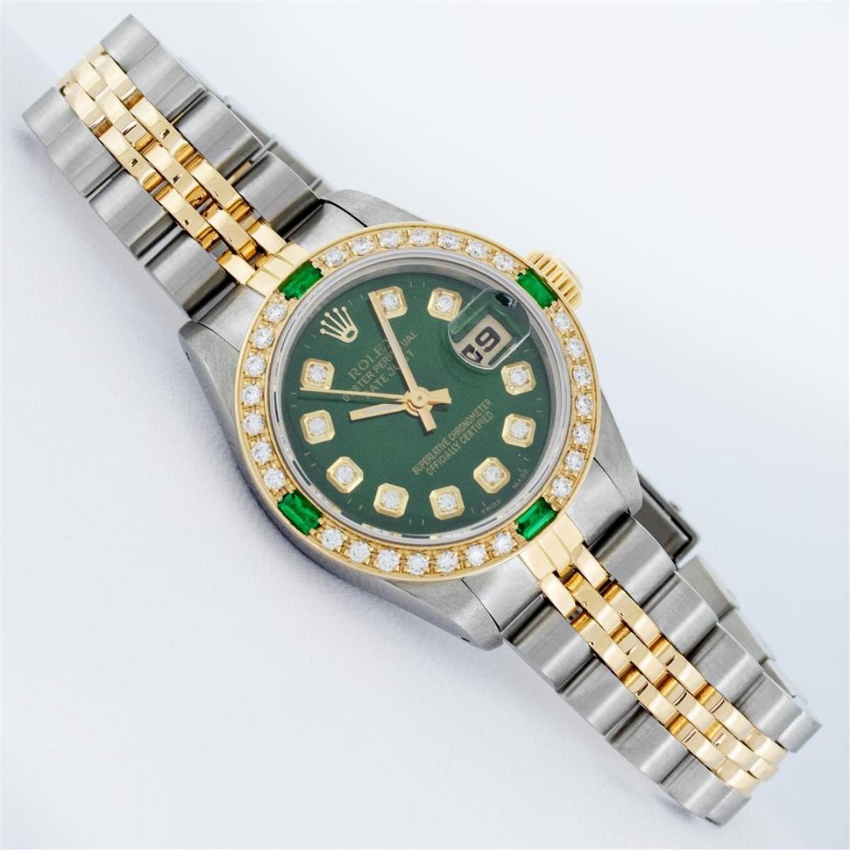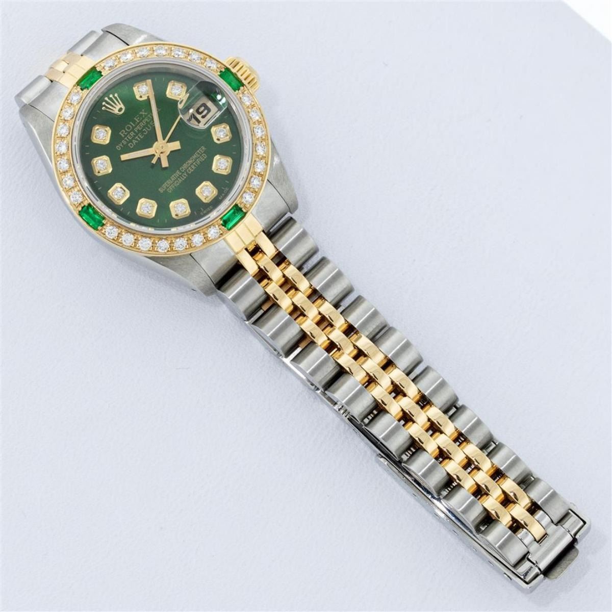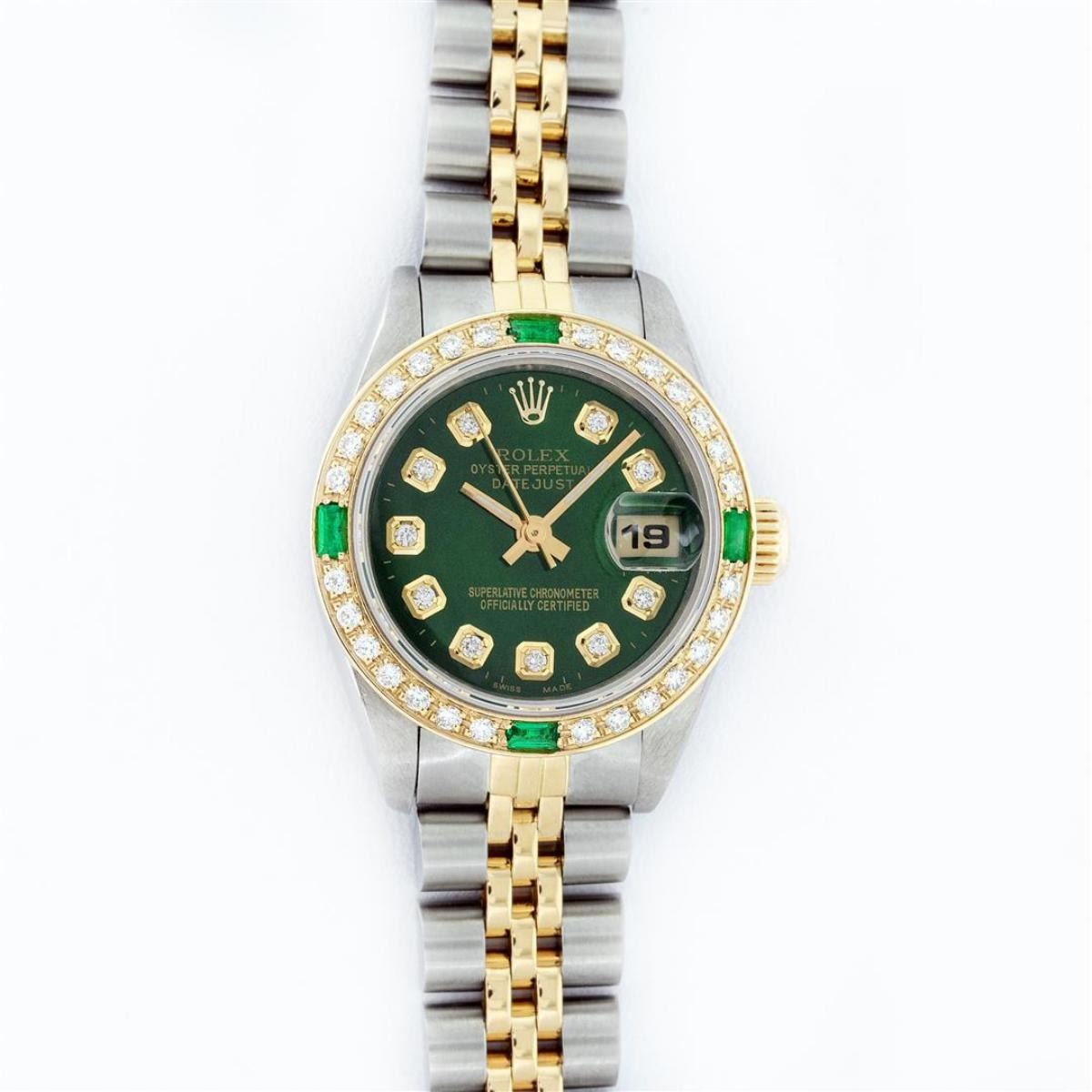One Ladies 14K Two Tone Rolex Datejust Polished, Serviced & Electronically Tested, 14K Yellow Gold & Stainless Steel Case: 26mm, 14K Yellow Gold Crown, Custom Bezel: New 18K Yellow Gold Emerald Beadset Diamond Bezel, Diamond + Gem Count: 28 Diamonds + 4 Emeralds Total Weight .70 Carat, Clarity: SI-VS, Color: G to H. Custom Crystal: New Scratch Resistant Synthetic Sapphire Cyclops Lens. Custom Hands: New Luminescent Hands. Movement: Automatic Winding Movement Caliber 2030. Custom Dial: Green Dial Set With Diamond Hour Markers & Dash Track, Diamond Count: 10 Diamonds in Dial, G To H In Color, SI-VS Clarity. Date Window: 3 O'Clock Position Date Display, Model: Datejust, Condition: G-6 Extra Fine. Bracelet: Two Tone 14K Yellow Gold & Stainless Steel Jubilee. Bright Polish. 6.0 Inch Length, Adjustable. Standard Clasp, With Rolex Logo. This Watch Has Been Serviced Time Tested And Is In Excellent Condition It Is Free Of All Scratches And Dents.