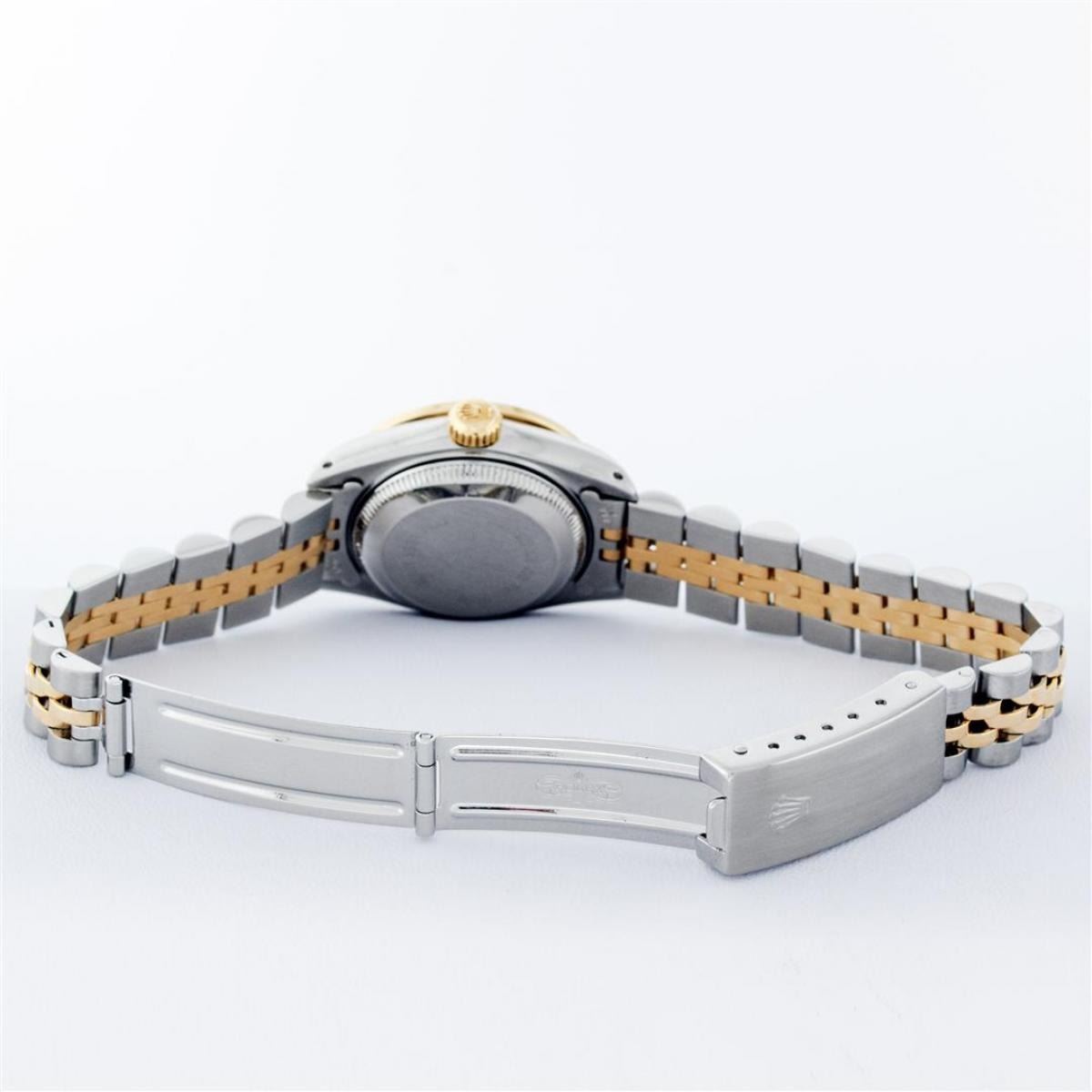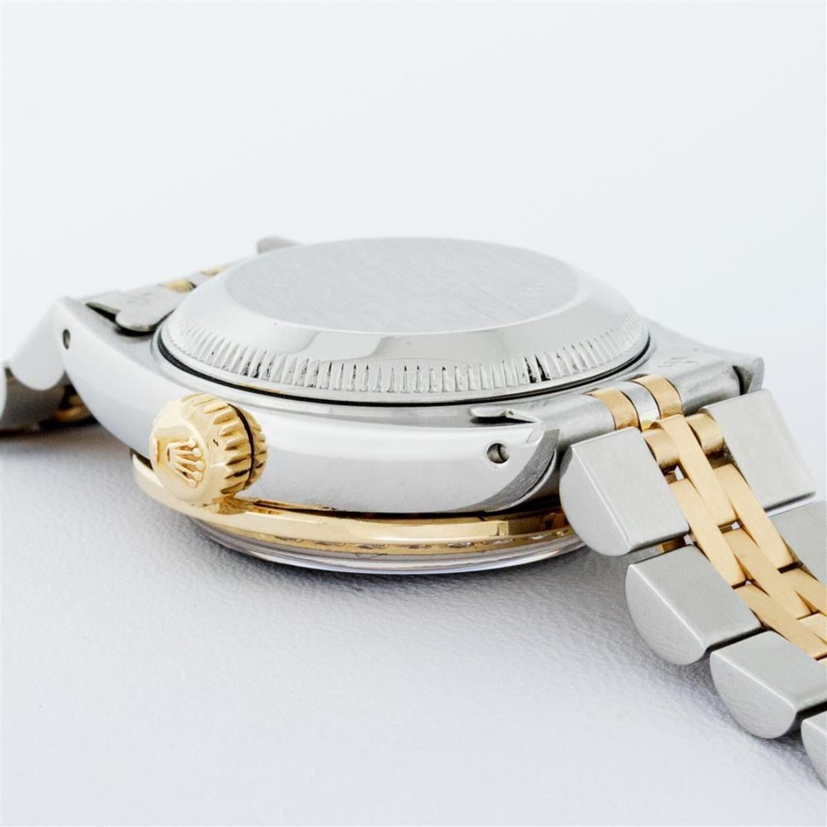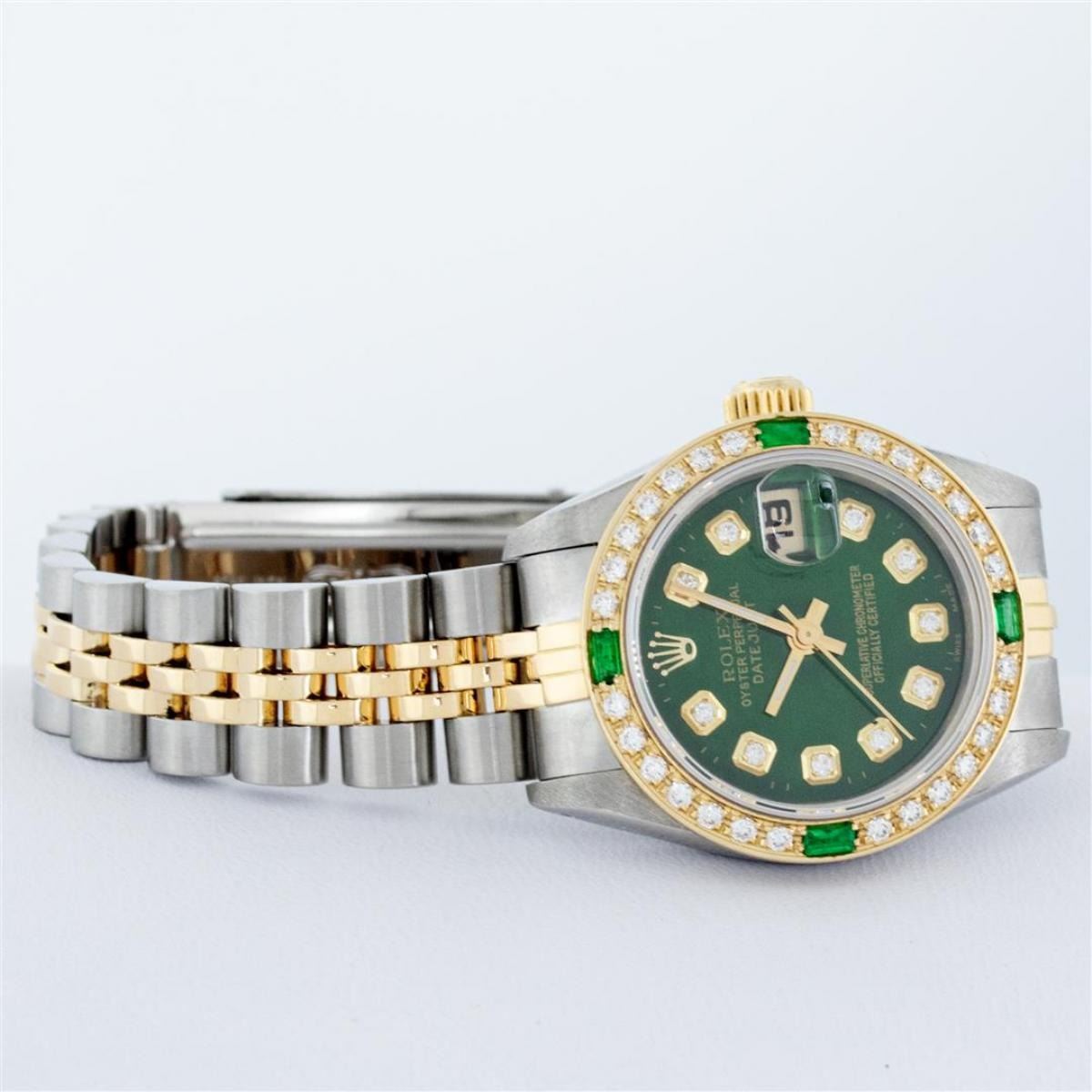 One Ladies 14K Two Tone Rolex Datejust Polished, Serviced & Electronically Tested, 14K Yellow Gold & Stainless Steel Case: 26mm, 14K Yellow Gold Crown, Custom Bezel: New 18K Yellow Gold Emerald Beadset Diamond Bezel, Diamond + Gem Count: 28 Diamonds + 4 Emeralds Total Weight .70 Carat, Clarity: SI-VS, Color: G to H. Custom Crystal: New Scratch Resistant Synthetic Sapphire Cyclops Lens. Custom Hands: New Luminescent Hands. Movement: Automatic Winding Movement Caliber 2030. Custom Dial: Green Dial Set With Diamond Hour Markers & Dash Track, Diamond Count: 10 Diamonds in Dial, G To H In Color, SI-VS Clarity. Date Window: 3 O'Clock Position Date Display, Model: Datejust, Condition: G-6 Extra Fine. Bracelet: Two Tone 14K Yellow Gold & Stainless Steel Jubilee. Bright Polish. 6.0 Inch Length, Adjustable. Standard Clasp, With Rolex Logo. This Watch Has Been Serviced Time Tested And Is In Excellent Condition It Is Free Of All Scratches And Dents.