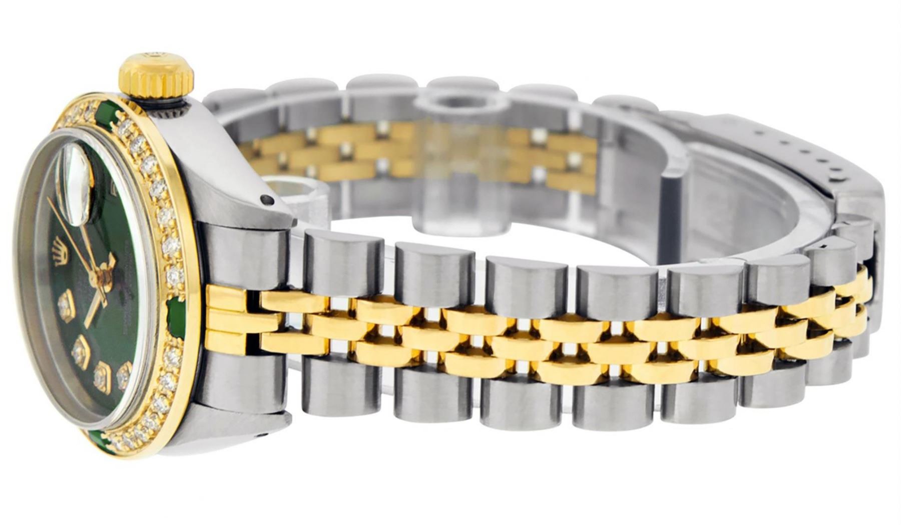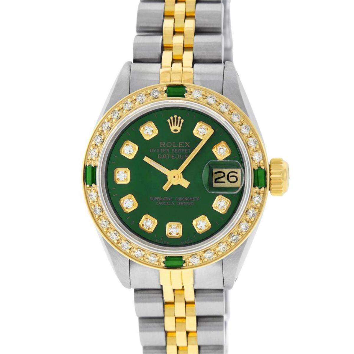 One Ladies Two Tone Rolex Datejust Polished, Serviced & Electronically Tested, Yellow Gold & Stainless Steel Case: 26mm, Yellow Gold Crown, Custom Bezel: New 18K Yellow Gold Emerald Beadset Diamond Bezel, Diamond + Gem Count: 28 Diamonds + 4 Emeralds Total Weight .70 Carat, Clarity: SI-VS, Color: G to H. Custom Crystal: New Scratch Resistant Synthetic Sapphire Cyclops Lens. Custom Hands: New Luminescent Hands. Movement: Automatic Winding Movement. Custom Dial: Green Dial Set With Diamond Hour Markers & Dash Track, Diamond Count: 10 Diamonds in Dial, G To H In Color, SI-VS Clarity. Date Window: 3 O'Clock Position Date Display, Model: Datejust, Condition: G-6 Extra Fine. Bracelet: Two Tone Yellow Gold & Stainless Steel Jubilee. Bright Polish. 6.0 Inch Length, Adjustable. Standard Clasp, With Rolex Logo. This Watch Has Been Serviced Time Tested And Is In Excellent Condition It Is Free Of All Scratches And Dents.