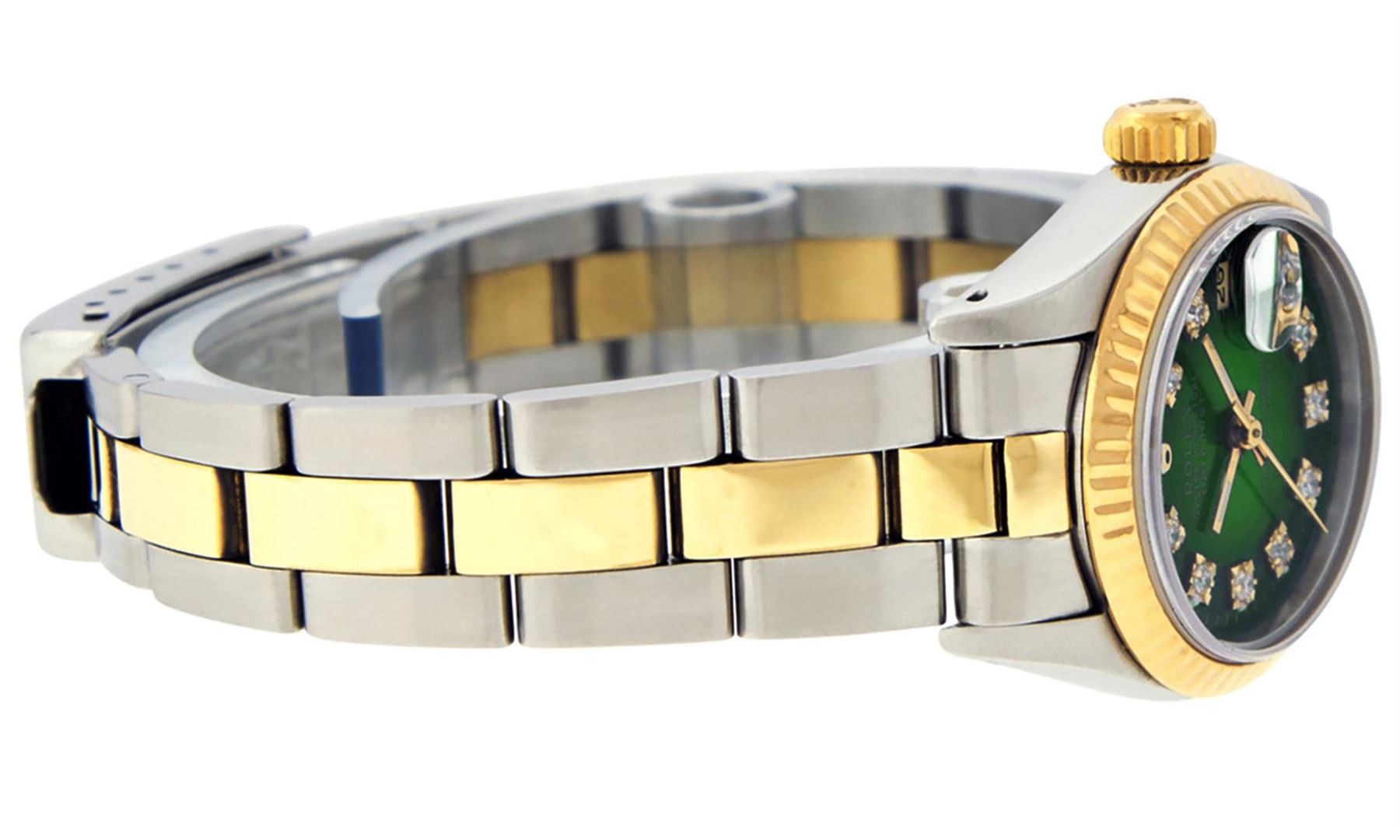 One Ladies Two Tone Rolex Datejust Polished, Serviced & Electronically Tested, Yellow Gold & Stainless Steel Case: 26mm, Yellow Gold Crown, Bezel: Yellow Gold Fluted Bezel. Custom Crystal: New Acrylic Cyclops Lens. Custom Hands: New Luminescent Hands. Movement: Automatic Winding Movement. Custom Dial: Green Vignette With Diamond Hour Markers Dash Track & Lumi Dots, Diamond Count: 10 Single Cut Diamonds, Color: G to H, Clarity: VS. Date Window: 3 O'Clock Position Date Display, Model: Datejust. Condition: G-6 Extra Fine. Bracelet: Two Tone Yellow Gold & Stainless Steel Oyster Band. Bright Polish. 6.0 Inch Length, Adjustable. Standard Clasp, With Rolex Logo. This Watch Has Been Serviced Time Tested And Is In Excellent Condition It Is Free Of All Scratches And Dents.