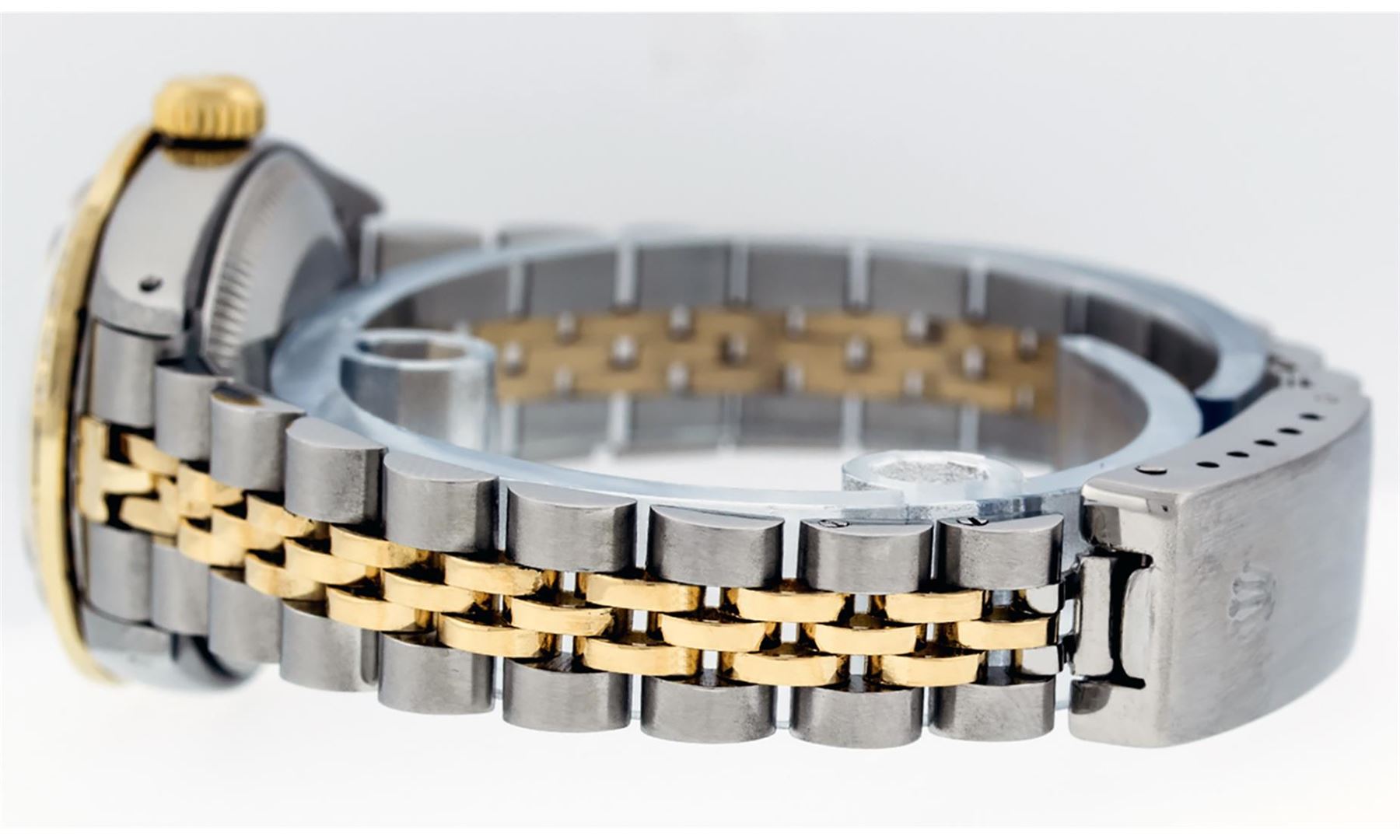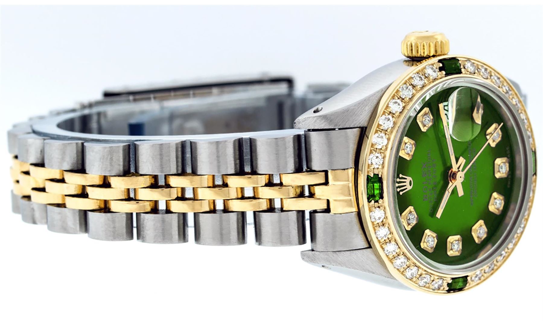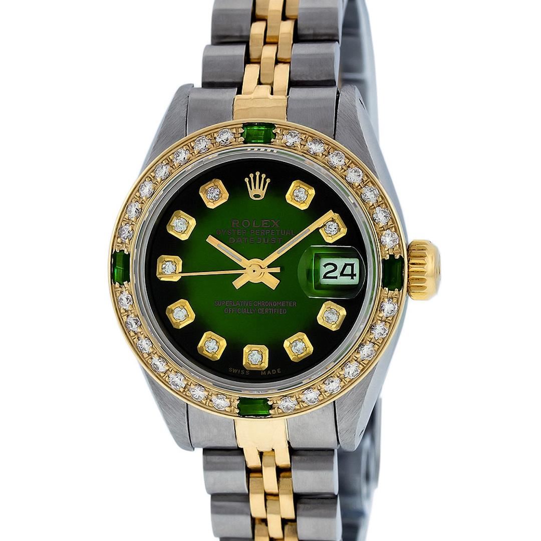 One Ladies Two Tone Rolex Datejust Polished, Serviced & Electronically Tested, Yellow Gold & Stainless Steel Case: 26mm, Yellow Gold Crown, Custom Bezel: New 18K Yellow Gold Synthetic Emerald Beadset Diamond Bezel, Diamond + Gem Count: 28 Diamonds + 4 Emeralds, Total Weight .70 Carat, Clarity: SI-VS, Color: G to H. Custom Crystal: New Synthetic Sapphire Cyclops Lens. Custom Hands: New Luminescent Hands. Movement: Automatic Winding Movement. Custom Dial: Green Vignette Dial Set With Diamond Hour Markers, Diamond Count: 10 Diamond in Dial, G To H In Color, SI-VS Clarity. Date Window: 3 O'Clock Position Date Display, Model: Datejust, Condition: G-6 Extra Fine. Bracelet: Two Tone Yellow Gold & Stainless Steel Jubilee. Bright Polish. 6.0 Inch Length, Adjustable. Standard Clasp, With Rolex Logo. This Watch Has Been Serviced Time Tested And Is In Excellent Condition It Is Free Of All Scratches And Dents.