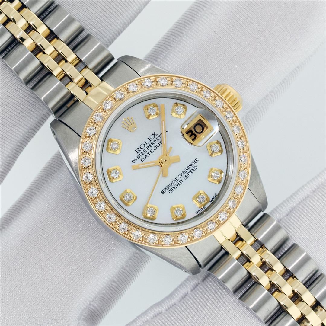 One Ladies Two Tone Rolex Datejust Polished, Serviced & Electronically Tested, Yellow Gold & Stainless Steel Case: 26mm, Yellow Gold Crown, Custom Bezel: 18K Yellow Gold Beadset Diamond Bezel, Diamond Count: 32 Diamonds Total Weight .70 Carat, Clarity: Si-VS, Color: G to H. Custom Crystal: Synthetic Sapphire Cyclops Lens. Custom Hands: New Luminescent Hands. Movement: Automatic Winding Movement Caliber. Custom Dial: Mother Of Pearl Dial Set With Diamond Hour Markers, 10 Diamond in Dial G To H In Color, SI-VS Clarity. Date Window: 3 O'Clock Position Date Display, Model: Datejust. Condition: G-6 Extra Fine. Bracelet: Two Tone Yellow Gold & Stainless Steel Jubilee. Bright Polish. 6.0 Inch Length, Adjustable. Standard Clasp, With Rolex Logo. This Watch Has Been Serviced Time Tested And Is In Excellent Condition It Is Free Of All Scratches And Dents. This Watch Comes With A Rolex Box.