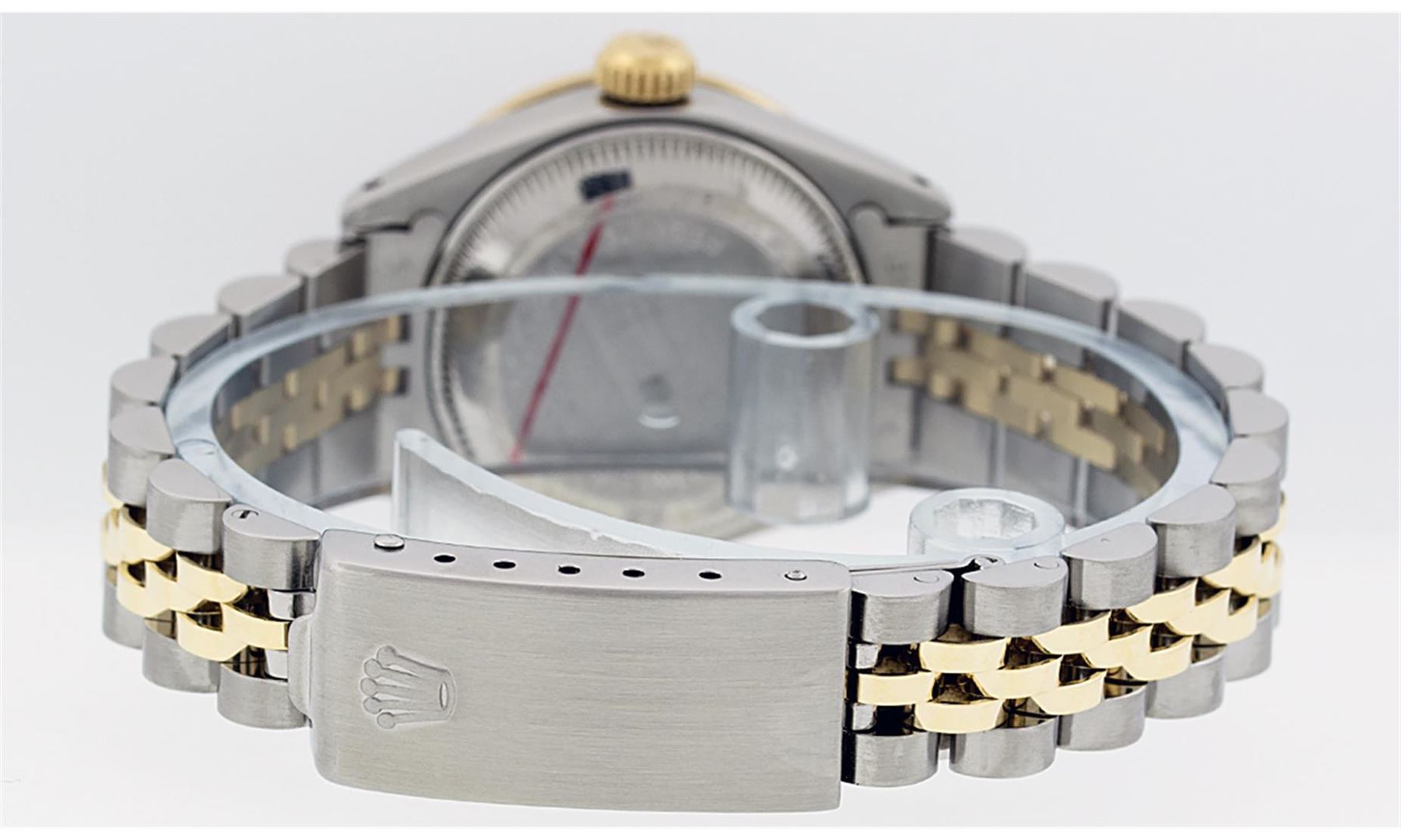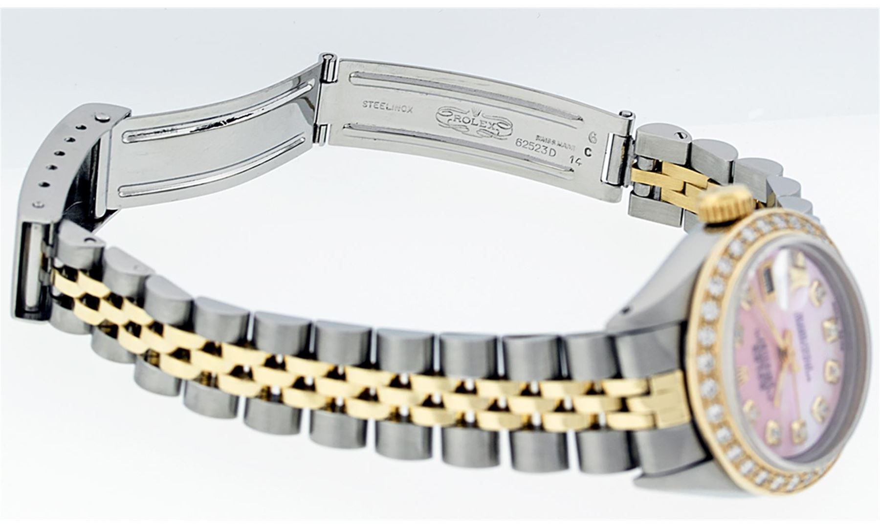 One Ladies Two Tone Rolex Datejust Polished, Serviced & Electronically Tested, Yellow Gold & Stainless Steel Case: 26mm, Yellow Gold Crown, Custom Bezel: 18K Yellow Gold Beadset Diamond Bezel, Diamond Count: 32 Diamonds Total Weight .70 Carat, Clarity: Si-VS, Color: G to H. Custom Crystal: Synthetic Sapphire Cyclops Lens. Custom Hands: New Luminescent Hands. Movement: Automatic Winding Movement Caliber. Custom Dial: Mother Of Pearl Dial Set With Diamond Hour Markers, 10 Diamond in Dial G To H In Color, SI-VS Clarity. Date Window: 3 O'Clock Position Date Display, Model: Datejust. Condition: G-6 Extra Fine. Bracelet: Two Tone Yellow Gold & Stainless Steel Jubilee. Bright Polish. 6.0 Inch Length, Adjustable. Standard Clasp, With Rolex Logo. This Watch Has Been Serviced Time Tested And Is In Excellent Condition It Is Free Of All Scratches And Dents.