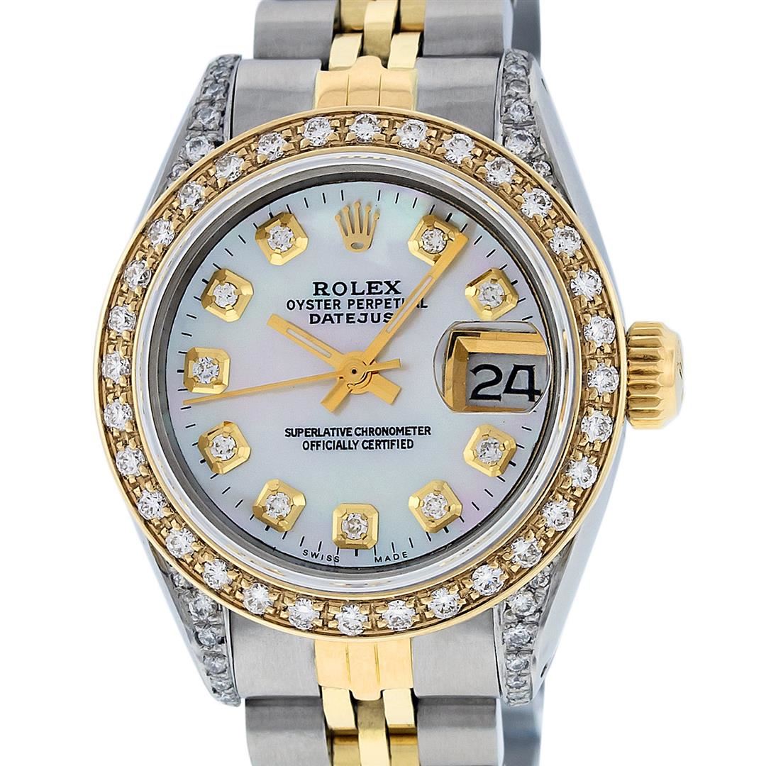 One Ladies Two Tone Rolex Datejust Polished, Serviced & Electronically Tested, Yellow Gold & Stainless Steel Case: 26mm, Yellow Gold Crown, Diamond Lugs: 24 Diamonds On Lugs, Clarity: SI-VS, Color: G to H, Clarity SI-VS. Custom Bezel: New 18K Yellow Gold Beadset Diamond Bezel, Diamond Count: 32 Diamonds, Total Weight .70 Carat, Clarity: SI-VS, Color: G to H. Custom Crystal: New Synthetic Sapphire Cyclops Lens. Custom Hands: New Luminescent Hands. Movement: Automatic Winding Movement. Custom Dial: Mother Of Pearl With Diamond Hour Markers and Dash Track, Diamond Count: 10 Diamonds, Clarity: SI-VS, Color: G to H. Date Window: 3 O'Clock Position Date Display, Model: Datejust. Condition: G-6 Extra Fine. Bracelet: Two Tone Yellow Gold & Stainless Steel Jubilee. Bright Polish. 6.0 Inch Length, Adjustable. Standard Clasp, With Rolex Logo. This Watch Has Been Serviced Time Tested And Is In Excellent Condition It Is Free Of All Scratches And Dents.