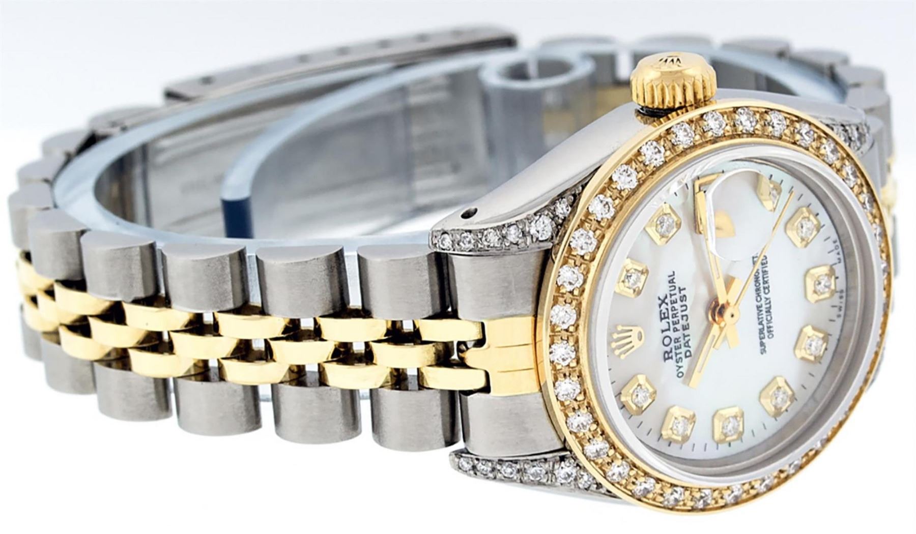 One Ladies Two Tone Rolex Datejust Polished, Serviced & Electronically Tested, Yellow Gold & Stainless Steel Case: 26mm, Yellow Gold Crown, Diamond Lugs: 24 Diamonds On Lugs, Clarity: SI-VS, Color: G to H, Clarity SI-VS. Custom Bezel: New 18K Yellow Gold Beadset Diamond Bezel, Diamond Count: 32 Diamonds, Total Weight .70 Carat, Clarity: SI-VS, Color: G to H. Custom Crystal: New Synthetic Sapphire Cyclops Lens. Custom Hands: New Luminescent Hands. Movement: Automatic Winding Movement. Custom Dial: Mother Of Pearl With Diamond Hour Markers and Dash Track, Diamond Count: 10 Diamonds, Clarity: SI-VS, Color: G to H. Date Window: 3 O'Clock Position Date Display, Model: Datejust. Condition: G-6 Extra Fine. Bracelet: Two Tone Yellow Gold & Stainless Steel Jubilee. Bright Polish. 6.0 Inch Length, Adjustable. Standard Clasp, With Rolex Logo. This Watch Has Been Serviced Time Tested And Is In Excellent Condition It Is Free Of All Scratches And Dents.