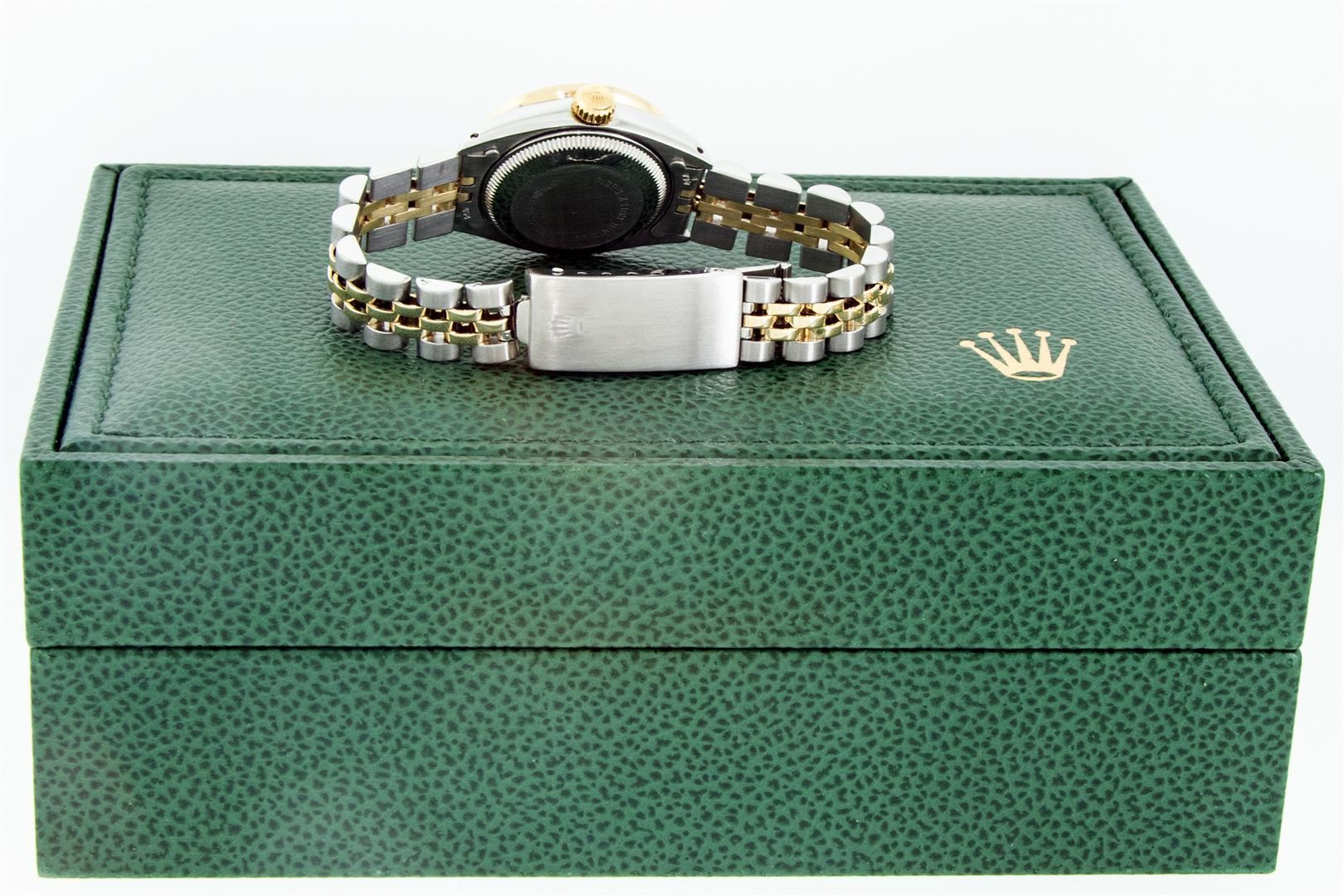 One Ladies Two Tone Rolex Datejust Polished, Serviced & Electronically Tested, Yellow Gold & Stainless Steel Case: 26mm, Yellow Gold Crown, Diamond Lugs: 24 Diamonds On Lugs, Clarity: SI-VS, Color: G to H, Clarity SI-VS. Custom Bezel: New 18K Yellow Gold Pyramid Diamond Bezel, Diamond Count: 24 Diamonds, Total Weight .50 Carat, Clarity: SI-VS, Color: G to H. Custom Crystal: New Synthetic Scratch Resistant Sapphire Cyclops Lens. Custom Hands: New Luminescent Hands. Movement: Automatic Winding Movement. Custom Dial: Mother Of Pearl With Ruby Hour Markers, Stone Count: 10 Rubies + 33 Diamonds In Dial, Clarity: SI-VS, Color: G to H. Date Window: 3 O'Clock Position Date Display, Model: Datejust. Condition: G-6 Extra Fine. Bracelet: Two Tone Yellow Gold & Stainless Steel Jubilee. Bright Polish. 6.0 Inch Length, Adjustable. Standard Clasp, With Rolex Logo. This Watch Has Been Serviced Time Tested And Is In Excellent Condition It Is Free Of All Scratches And Dents.This Watch Comes With A Rolex Box.