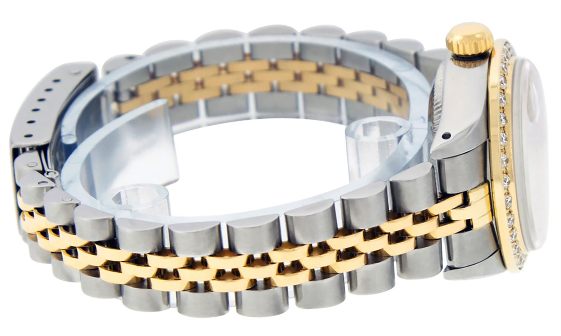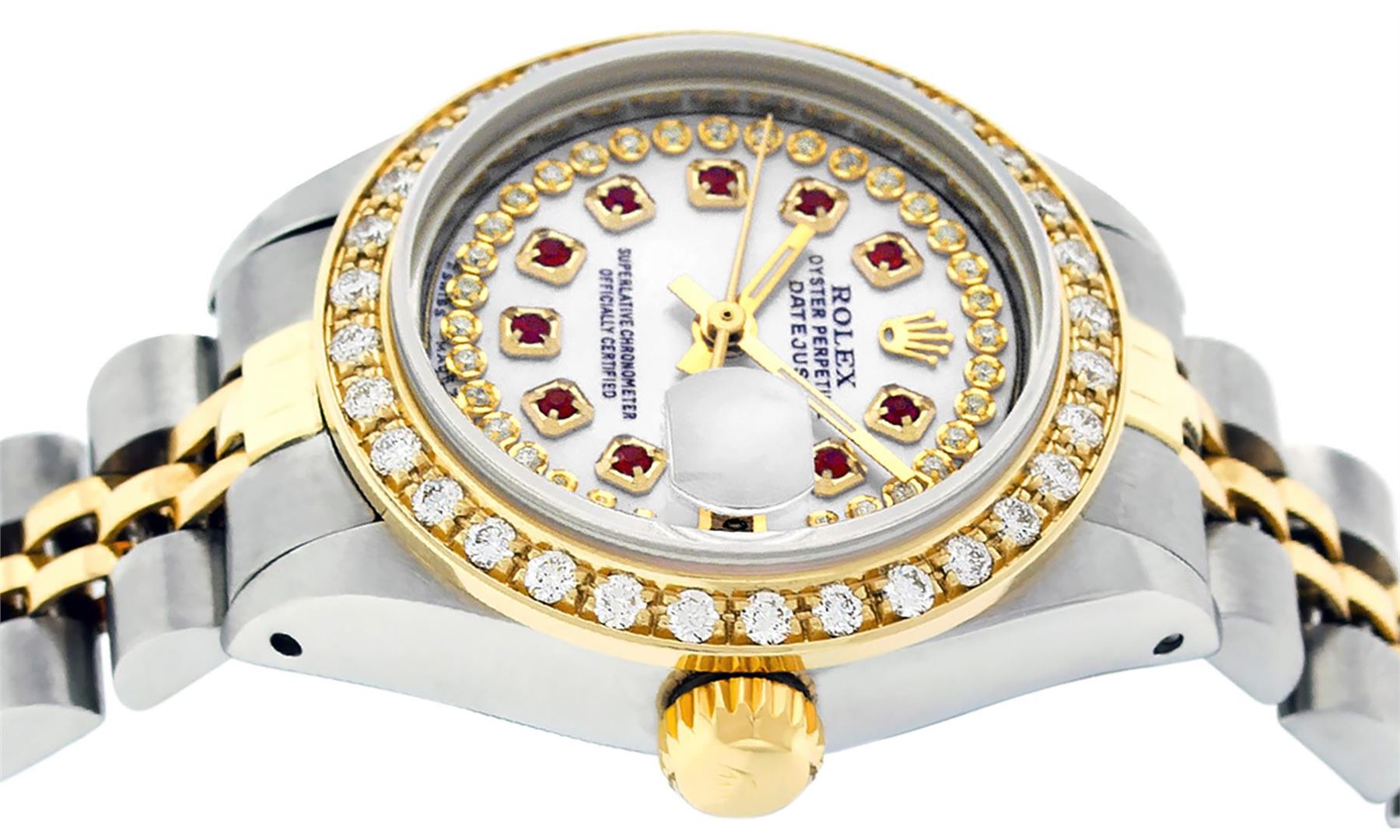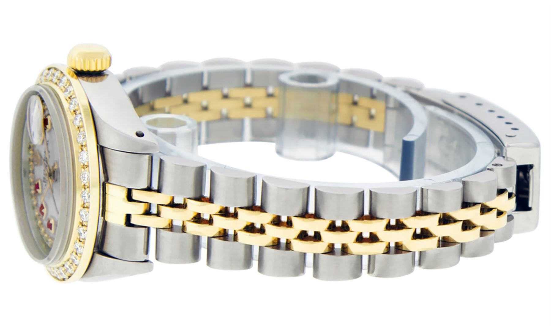 One Ladies Two Tone Rolex Datejust Polished, Serviced & Electronically Tested, Yellow Gold & Stainless Steel Case: 26mm, Yellow Gold Crown, Custom Bezel: New 18K Yellow Gold Beadset Diamond Bezel, Diamond Count: 32 Diamonds In Bezel, Total Weight .70 Carat, Clarity: SI-VS, Color: G to H. Custom Crystal: New Synthetic Sapphire Cyclops Lens. Custom Hands: New Luminescent Hands. Movement: Automatic Winding Movement. Custom Dial: Mother Of Pearl Ruby String Diamond Dial, Stone Count: 10 Rubies + 33 Diamonds In Dial. Clarity: SI-VS, Color: G to H. Date Window: 3 O'Clock Position Date Display, Model: Datejust. Condition: G-6 Extra Fine. Bracelet: Two Tone Yellow Gold & Stainless Steel Jubilee. Bright Polish. 6.0 Inch Length, Adjustable. Standard Clasp, With Rolex Logo. This Watch Has Been Serviced Time Tested And Is In Excellent Condition It Is Free Of All Scratches And Dents.