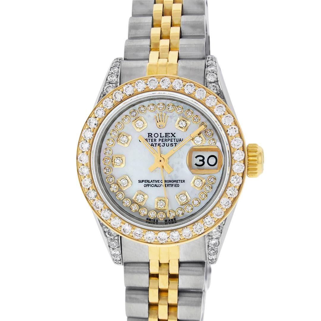 One Ladies Two Tone Rolex Datejust Polished, Serviced & Electronically Tested, Yellow Gold & Stainless Steel Case: 26mm, Yellow Gold Crown, Diamond Lugs: 24 Diamonds On Lugs, Clarity: SI-VS, Color: G to H. Custom Bezel: New 1ctw 18K Yellow Gold Beadset Diamond Bezel, Diamond Count: 42 Diamonds In Bezel, Total Weight 1.00 Carat, Clarity: SI-VS, Color: G to H. Custom Crystal: New Scratch Resistant Synthetic Sapphire Cyclops Lens. Custom Hands: New Luminescent Hands. Movement: Automatic Winding Movement. Custom Dial: Mother Of Pearl String Diamond Dial, Diamond Count: 43 Diamonds In Dial, Clarity: SI-VS, Color: G to H. Date Window: 3 O'Clock Position Date Display, Model: Datejust. Condition: G-6 Extra Fine. Bracelet: Two Tone Yellow Gold & Stainless Steel Jubilee Band. Bright Polish. 6.0 Inch Length, Adjustable. Standard Clasp, With Rolex Logo. This Watch Has Been Serviced Time Tested And Is In Excellent Condition It Is Free Of All Scratches And Dents.