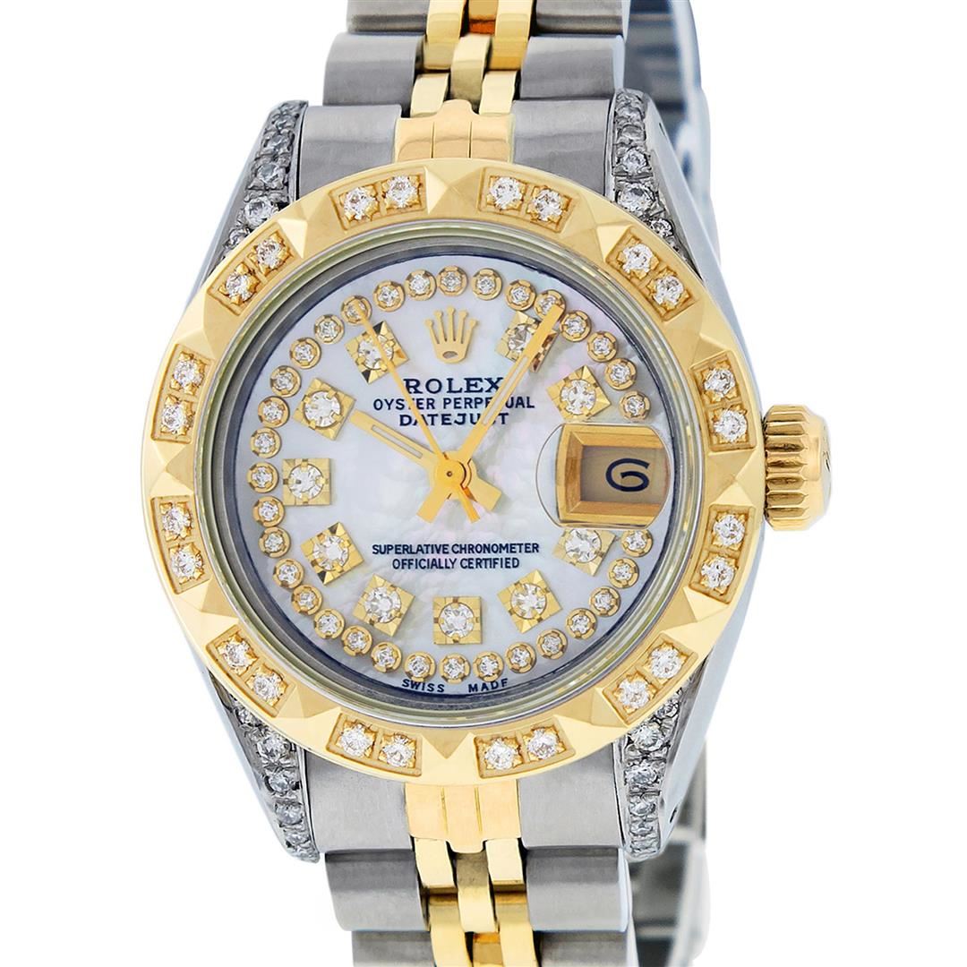 One Ladies Two Tone Rolex Datejust Polished, Serviced & Electronically Tested, Yellow Gold & Stainless Steel Case: 26mm, Yellow Gold Crown, Diamond Lugs: 24 Diamonds On Lugs, Clarity: SI-VS, Color: G to H. Custom Bezel: New 18K Yellow Gold Pyramid Diamond Bezel, Diamond Count: 24 Diamonds On Bezel, Total Weight .50 Carat, Clarity: SI-VS, Color: G to H. Custom Crystal: New Synthetic Scratch Resistant Sapphire Cyclops Lens. Custom Hands: New Luminescent Hands. Movement: Automatic Winding Movement. Custom Dial: Mother Of Pearl With String Single Cut Diamond Hour Markers, Diamond Count: 43 Diamonds On Dial, Clarity: SI-VS, Color: G to H. Date Window: 3 O'Clock Position Date Display, Model: Datejust. Condition: G-6 Extra Fine. Bracelet: Two Tone Yellow Gold & Stainless Steel Jubilee Band. Bright Polish. 6.0 Inch Length, Adjustable. Standard Clasp, With Rolex Logo. This Watch Has Been Serviced Time Tested And Is In Excellent Condition It Is Free Of All Scratches And Dents.