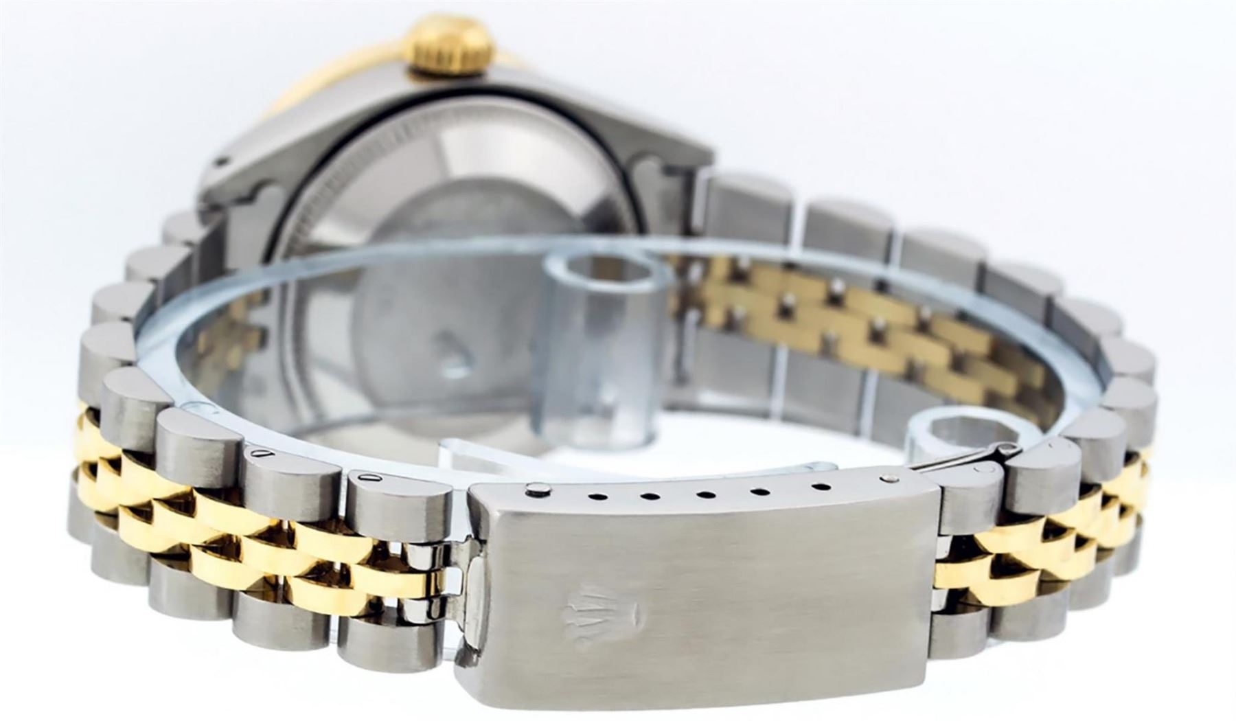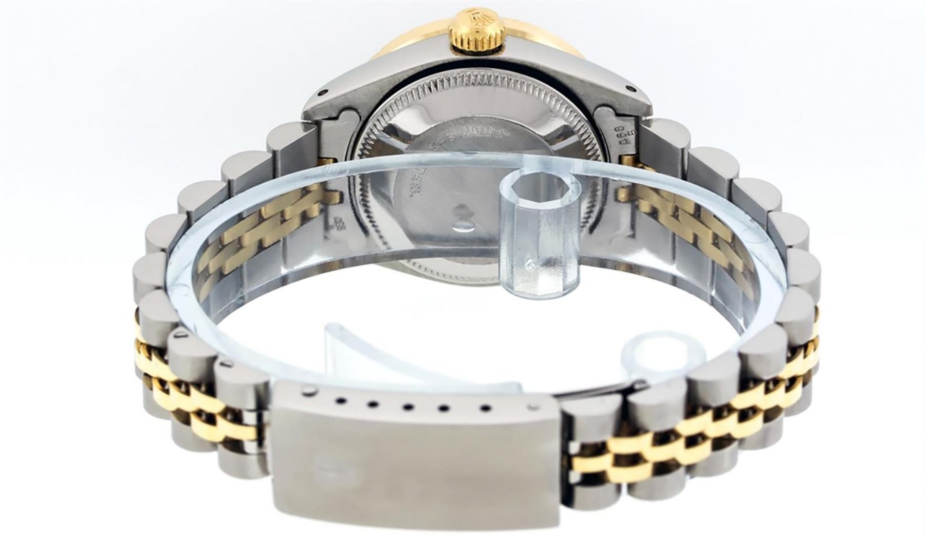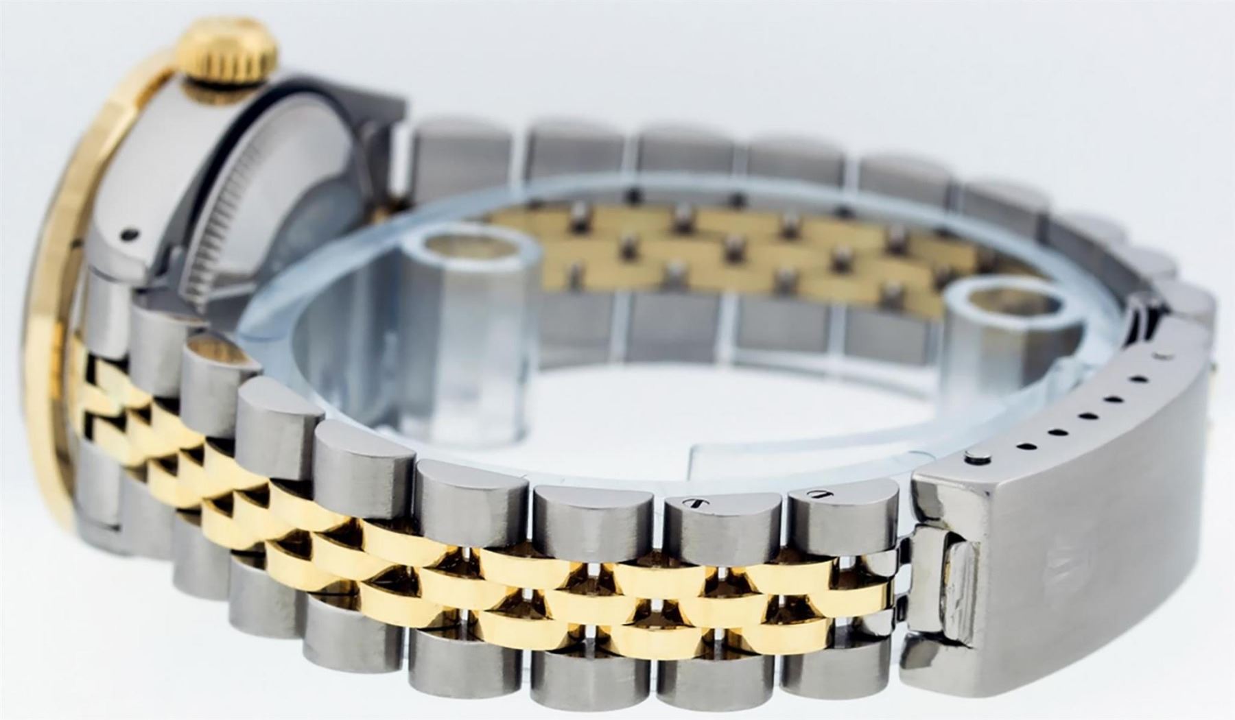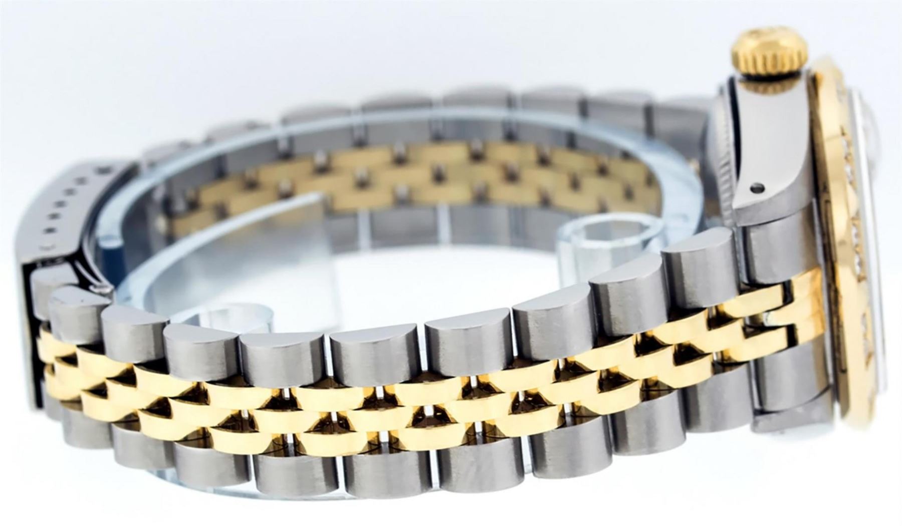 One Ladies Two Tone Rolex Datejust Polished, Serviced & Electronically Tested, Yellow Gold & Stainless Steel Case: 26mm, Yellow Gold Crown, Custom Bezel: New 18K Yellow Gold Pyramid Diamond Bezel, Diamond Count: 24 Diamonds On Bezel, Total Weight .50 Carat, Clarity: Si-VS, Color: G to H. Custom Crystal: New Scratch Resistant Synthetic Sapphire Cyclops Lens. Custom Hands: New Luminescent Hands. Movement: Automatic Winding Movement. Custom Dial: Mother Of Pearl String Diamond Dial. Diamond Count: 43 Diamonds On Dial, Clarity: SI-VS, Color: G to H. Date Window: 3 O'Clock Position Date Display, Model: Datejust. Condition: G-6 Extra Fine. Bracelet: Two Tone Yellow Gold & Stainless Steel Jubilee. Bright Polish. 6.0 Inch Length, Adjustable. Standard Clasp, With Rolex Logo. This Watch Has Been Serviced Time Tested And Is In Excellent Condition It Is Free Of All Scratches And Dents.