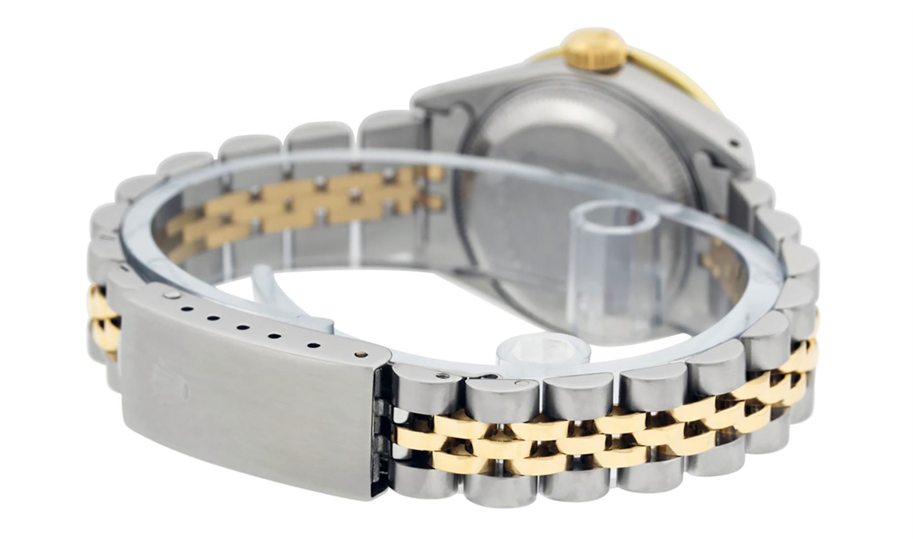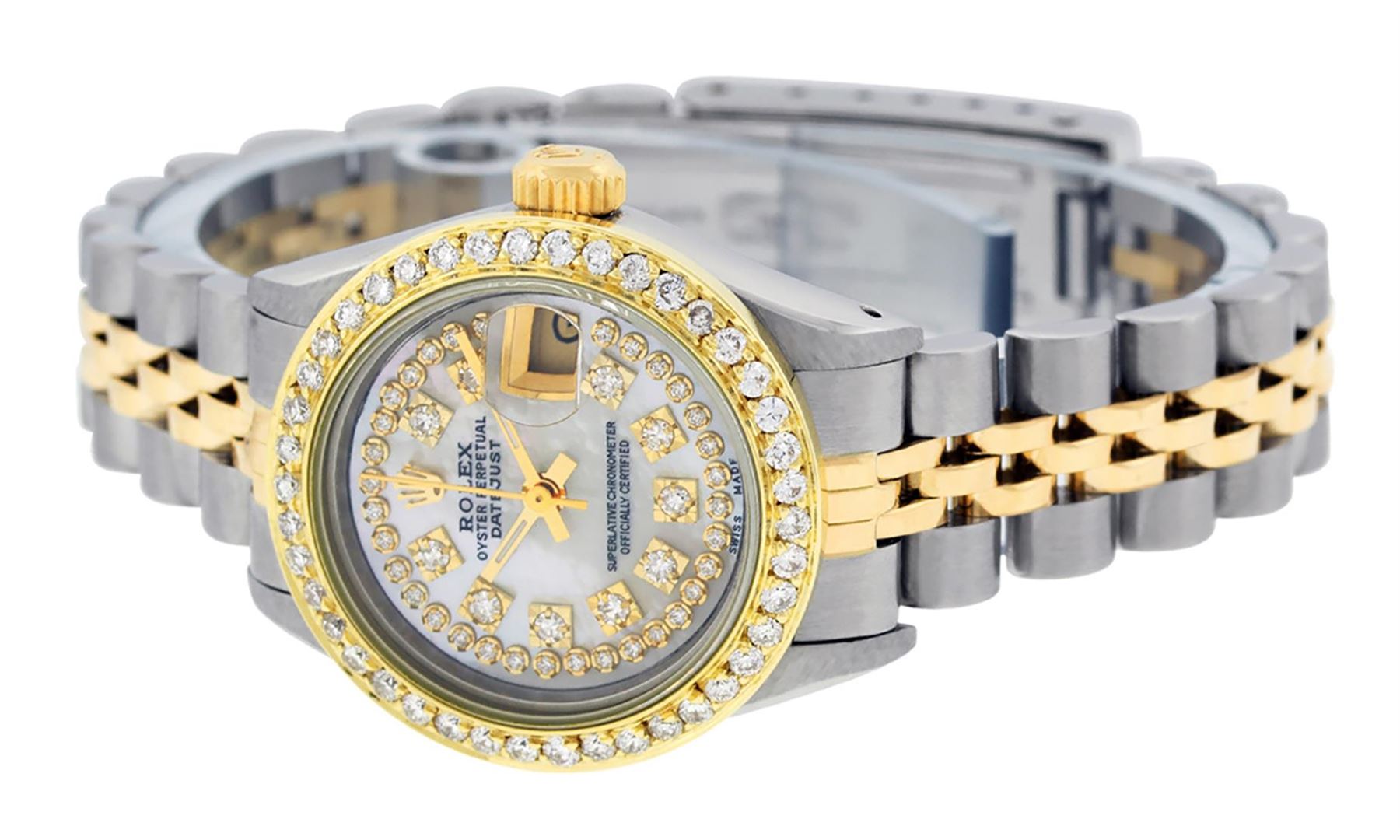 One Ladies Two Tone Rolex Datejust Polished, Serviced & Electronically Tested, Yellow Gold & Stainless Steel Case: 26mm, Yellow Gold Crown, Custom Bezel: New 18K 1ctw Yellow Gold Beadset Diamond Bezel, Diamond Count: 44 Diamonds, Total Weight 1.00 Carat, Clarity: Si-VS, Color: G to H. Custom Crystal: New Synthetic Sapphire Cyclops Lens. Custom Hands: New Luminescent Hands. Movement: Automatic Winding Movement. Custom Dial: Mother Of Pearl String Diamond Dial, Diamond Count: 43 Single Cut Diamonds in Dial, G To H In Color, VS Clarity. Date Window: 3 O'Clock Position Date Display, Model: Datejust, Condition: G-6 Extra Fine. Bracelet: Two Tone Yellow Gold & Stainless Steel Jubilee. Bright Polish. 6.0 Inch Length, Adjustable. Standard Clasp, With Rolex Logo. This Watch Has Been Serviced Time Tested And Is In Excellent Condition It Is Free Of All Scratches And Dents.
