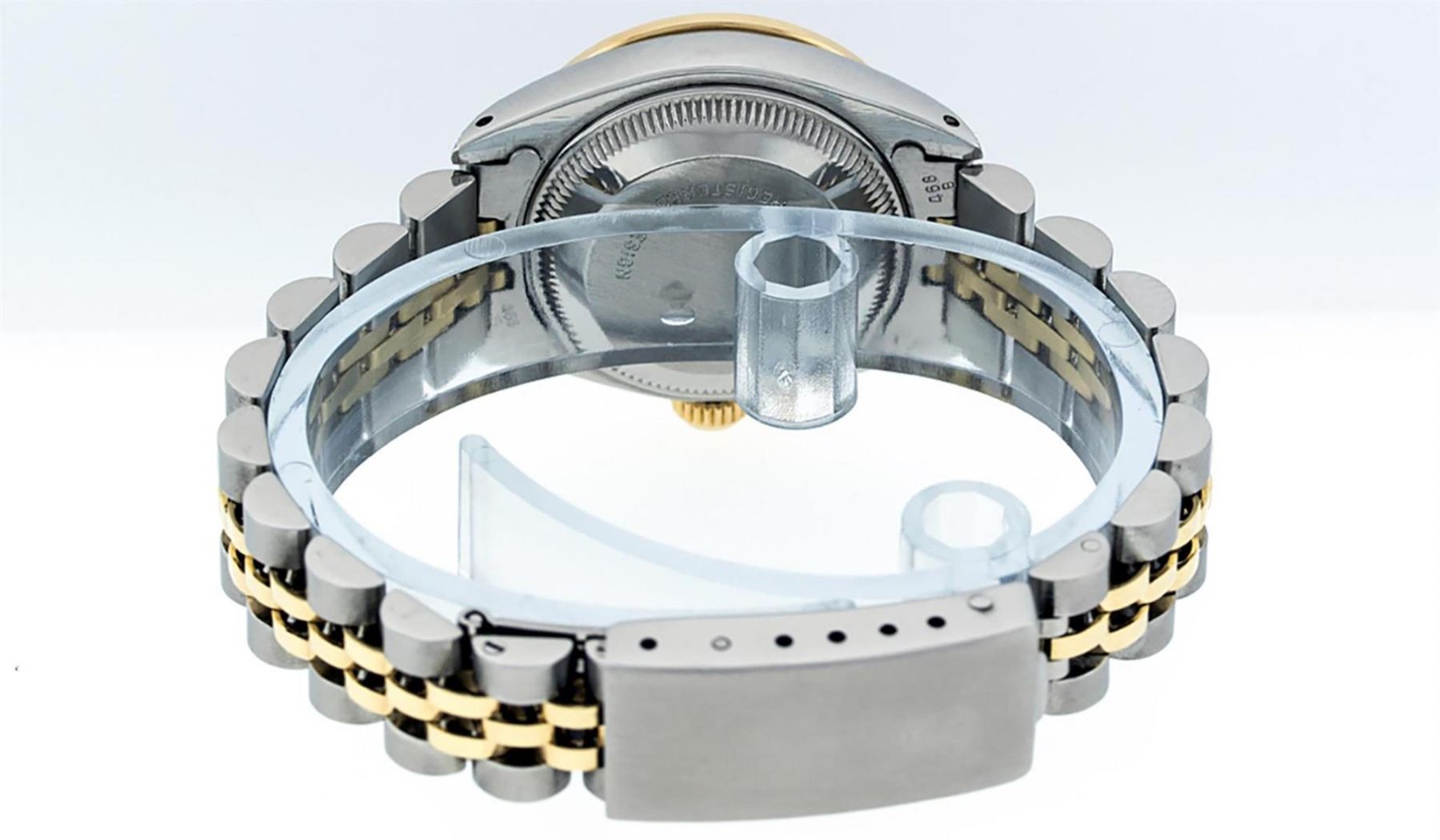 One Ladies Two Tone Rolex Datejust Polished, Serviced & Electronically Tested, Yellow Gold & Stainless Steel Case: 26mm, Yellow Gold Crown, Diamond Lugs: 24 Diamonds On Lugs, Clarity: SI-VS, Color: G to H. Custom Bezel: New 18K Yellow Gold Sapphire Beadset Diamond Bezel, Diamond Count: 28 Diamonds + 4 Sapphires On Bezel, Total Weight .70 Carat, Clarity: SI-VS, Color: G to H. Custom Crystal: New Synthetic Scratch Resistant Sapphire Cyclops Lens. Custom Hands: New Luminescent Hands. Movement: Automatic Winding Movement. Custom Refinished Dial: Mother Of Pearl With String Single Cut Diamond Hour Markers, Diamond Count: 43 Diamonds On Dial, Clarity: SI-VS, Color: G to H. Date Window: 3 O'Clock Position Date Display, Model: Datejust. Condition: G-6 Extra Fine. Bracelet: Two Tone Yellow Gold & Stainless Steel Jubilee Band. Bright Polish. 6.0 Inch Length, Adjustable. Standard Clasp, With Rolex Logo. This Watch Has Been Serviced Time Tested And Is In Excellent Condition It Is Free Of All Scratches And Dents.