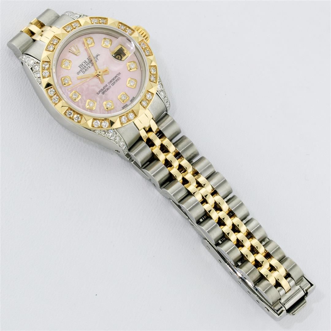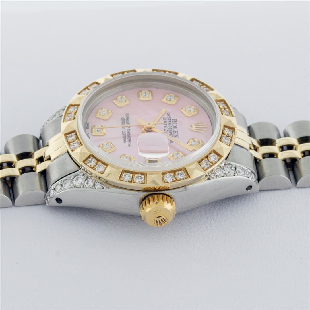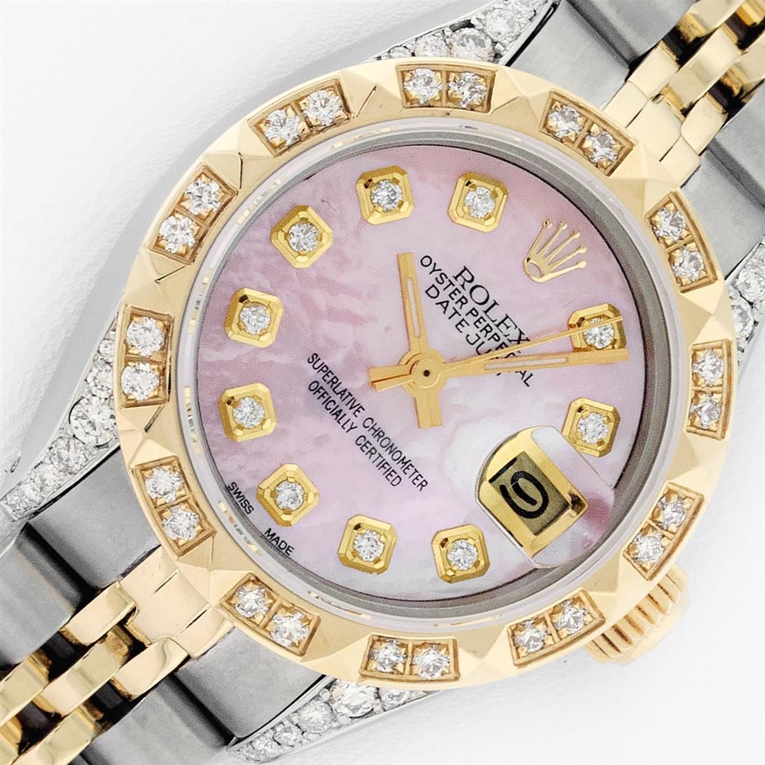 One Ladies Two Tone Rolex Datejust Polished, Serviced & Electronically Tested, Yellow Gold & Stainless Steel Case: 26mm, Yellow Gold Crown, Diamond Lugs: 24 Diamonds On Lugs, Clarity: SI-VS, Color: G to H. Custom Bezel: New 18K Yellow Gold Pyramid Diamond Bezel, Diamond Count: 24 Diamonds, Total Bezel Weight .50 Carat, Clarity: SI-VS, Color: G to H. Custom Crystal: New Scratch Resistant Synthetic Sapphire Cyclops Lens. Custom Hands: New Luminescent Hands. Movement: Automatic Winding Movement. Custom Dial: Pink Mother Of Pearl With Diamond Hour Markers, Diamond Count: 10 Diamonds In Dial, Clarity: SI-VS, Color: G to H. Date Window: 3 O'Clock Position Date Display, Model: Datejust. Condition: G-6 Extra Fine. Bracelet: Two Tone Yellow Gold & Stainless Steel Jubilee Band. Bright Polish. 6.0 Inch Length, Adjustable. Standard Clasp, With Rolex Logo. This Watch Has Been Serviced Time Tested And Is In Excellent Condition It Is Free Of All Scratches And Dents.