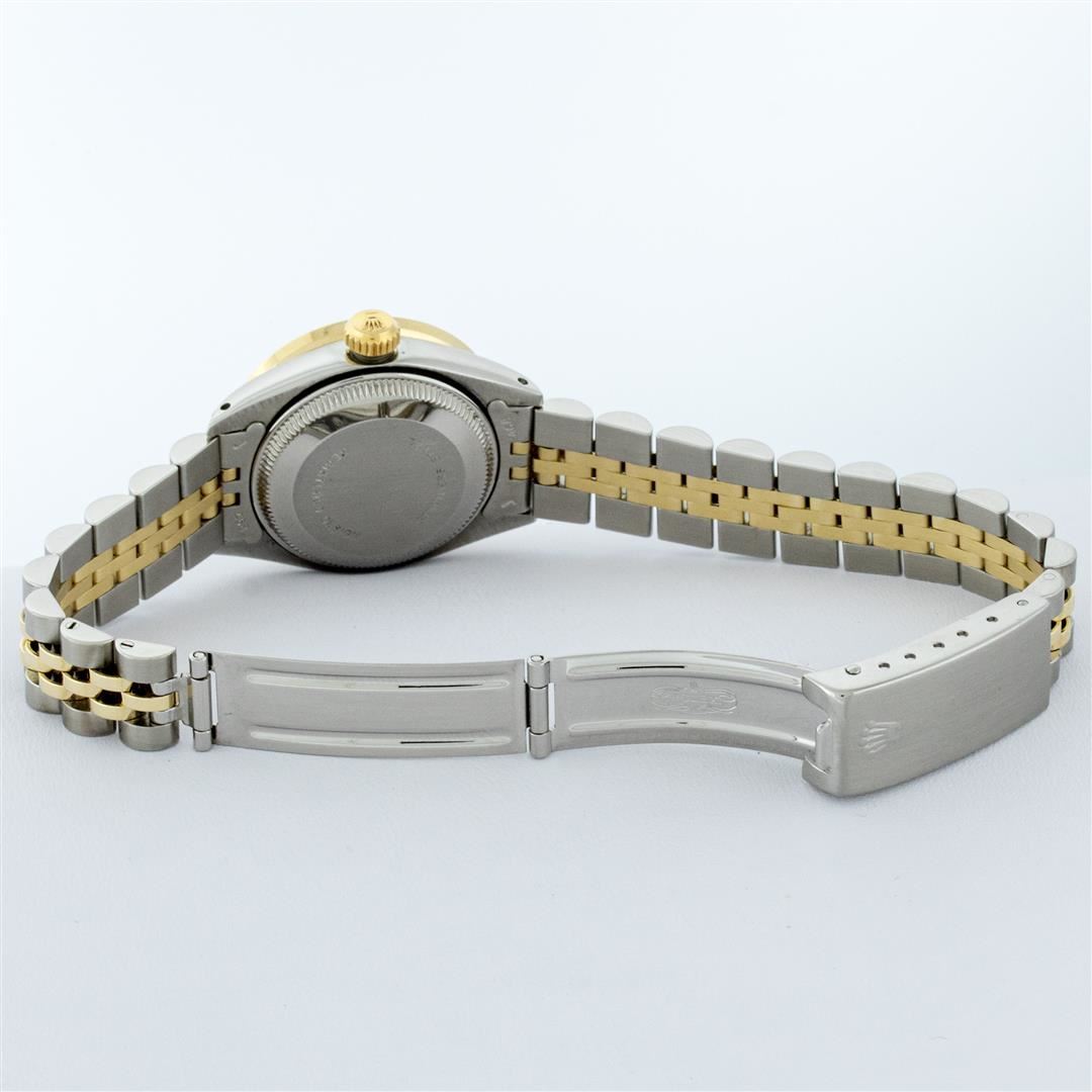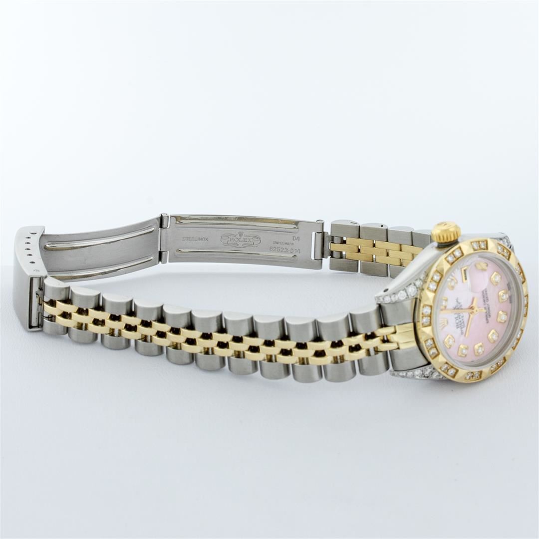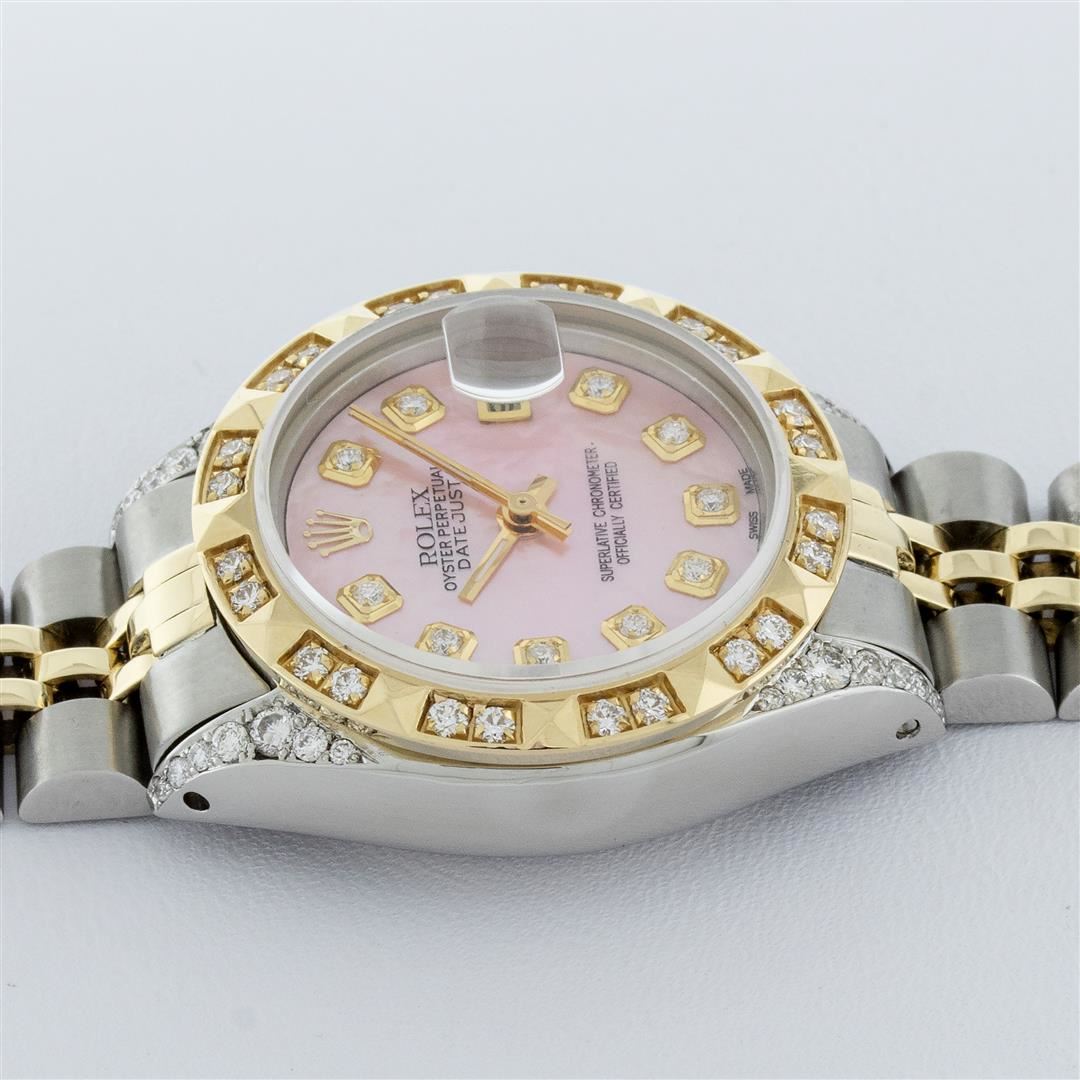 One Ladies Two Tone Rolex Datejust Polished, Serviced & Electronically Tested, Yellow Gold & Stainless Steel Case: 26mm, Yellow Gold Crown, Diamond Lugs: 24 Diamonds On Lugs, Clarity: SI-VS, Color: G to H. Custom Bezel: New 18K Yellow Gold Pyramid Diamond Bezel, Diamond Count: 24 Diamonds, Total Bezel Weight .50 Carat, Clarity: SI-VS, Color: G to H. Custom Crystal: New Scratch Resistant Synthetic Sapphire Cyclops Lens. Custom Hands: New Luminescent Hands. Movement: Automatic Winding Movement. Custom Dial: Pink Mother Of Pearl With Diamond Hour Markers, Diamond Count: 10 Diamonds In Dial, Clarity: SI-VS, Color: G to H. Date Window: 3 O'Clock Position Date Display, Model: Datejust. Condition: G-6 Extra Fine. Bracelet: Two Tone Yellow Gold & Stainless Steel Jubilee Band. Bright Polish. 6.0 Inch Length, Adjustable. Standard Clasp, With Rolex Logo. This Watch Has Been Serviced Time Tested And Is In Excellent Condition It Is Free Of All Scratches And Dents.