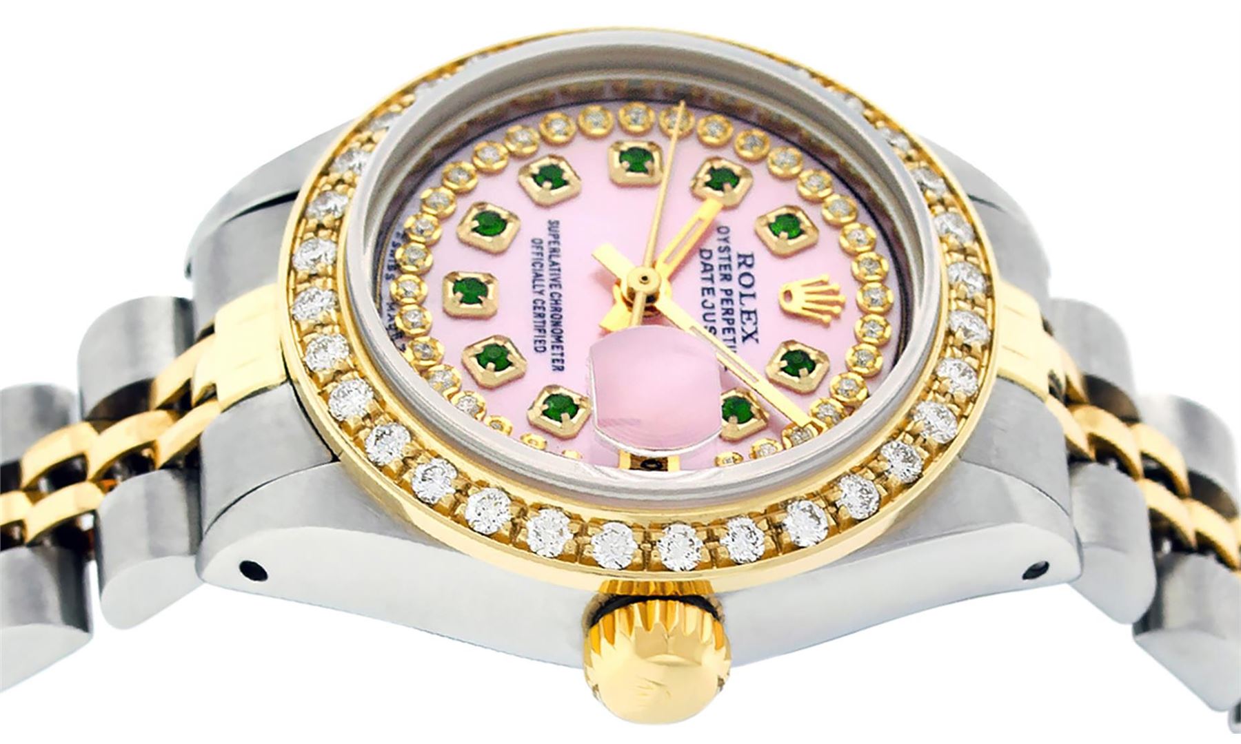 One Ladies Two Tone Rolex Datejust Polished, Serviced & Electronically Tested, Yellow Gold & Stainless Steel Case: 26mm, Yellow Gold Crown, Custom Bezel: New 18K Yellow Gold Beadset Diamond Bezel, Diamond Count: 43 Diamonds in bezel, Total Weight .70 Carat, Clarity: SI-VS, Color: G to H. Custom Crystal: New Synthetic Sapphire Cyclops Lens. Custom Hands: New Luminescent Hands. Movement: Automatic Winding Movement. Custom Dial: Pink Mother Of Pearl String Diamond and Emerald Dial, Stone Count: 33 Diamonds + 10 Emerald, Clarity: SI-VS, Color: G to H. Date Window: 3 O'Clock Position Date Display, Model: Datejust. Condition: G-6 Extra Fine. Bracelet: Two Tone Yellow Gold & Stainless Steel Jubilee Band. Bright Polish. 6.0 Inch Length, Adjustable. Standard Clasp, With Rolex Logo. This Watch Has Been Serviced Time Tested And Is In Excellent Condition It Is Free Of All Scratches And Dents.
