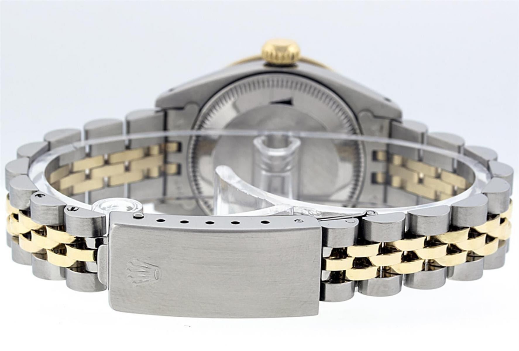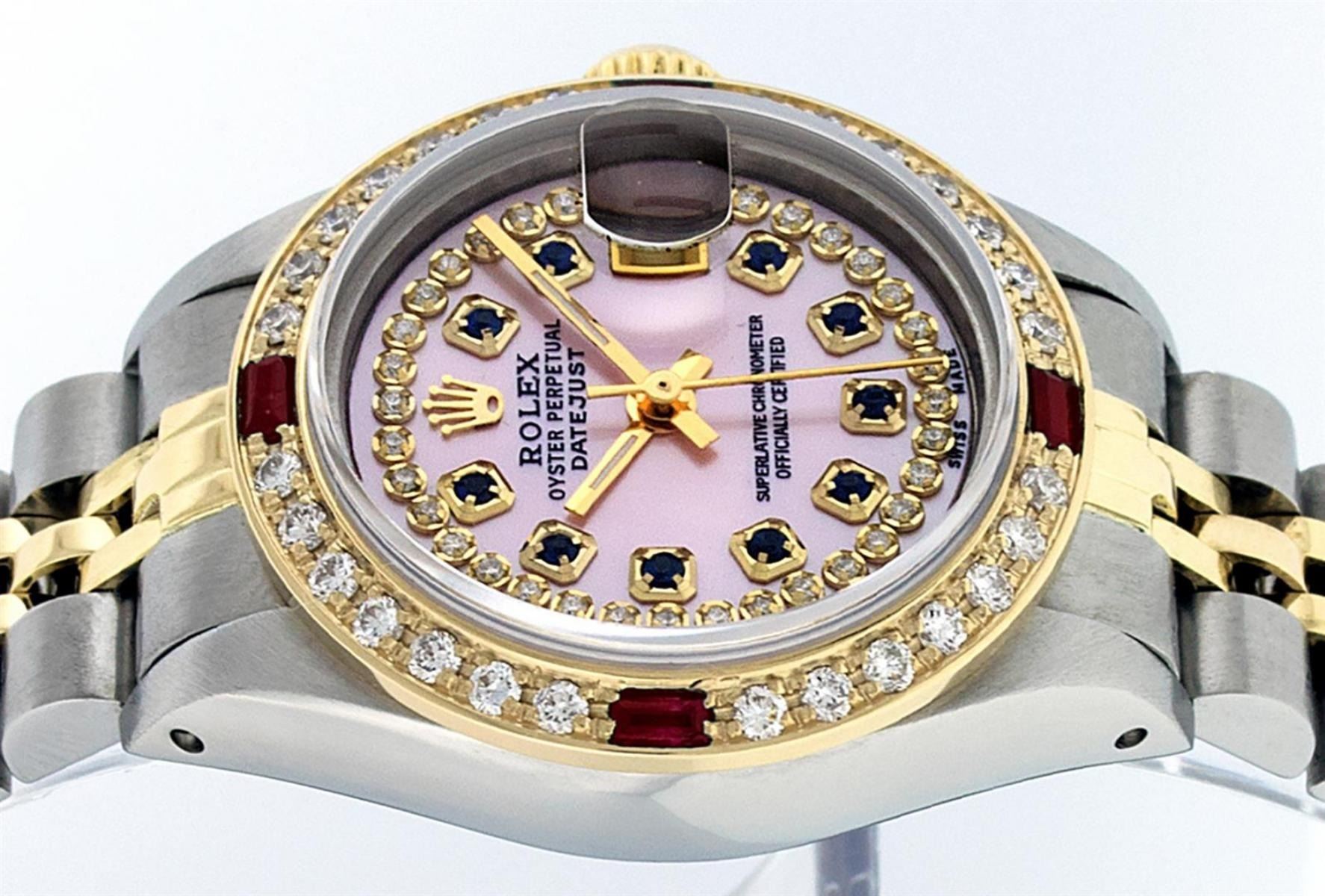 One Ladies Two Tone Rolex Datejust Polished, Serviced & Electronically Tested, Yellow Gold & Stainless Steel Case: 26mm, Yellow Gold Crown, Custom Bezel: New 18K New Yellow Gold Ruby Beadset Diamond Bezel, Diamond Count: 28 Diamonds + 4 Rubies In Dial, Total Weight .70 Carat, Clarity: SI-VS, Color: G to H. Custom Crystal: New Scratch Resistant Synthetic Sapphire Cyclops Lens. Custom Hands: New Luminescent Hands. Movement: Automatic Winding Movement. Custom Dial: Pink Mother Of Pearl Sapphire String Diamond Dial, Diamond Count: 10 Sapphires + 33 Diamonds In Dial, Clarity: SI-VS, Color: G to H. Date Window: 3 O'Clock Position Date Display, Model: Datejust. Condition: G-6 Extra Fine. Bracelet: Two Tone Yellow Gold & Stainless Steel Jubilee Band. Bright Polish. 6.0 Inch Length, Adjustable. Standard Clasp, With Rolex Logo. This Watch Has Been Serviced Time Tested And Is In Excellent Condition It Is Free Of All Scratches And Dents.