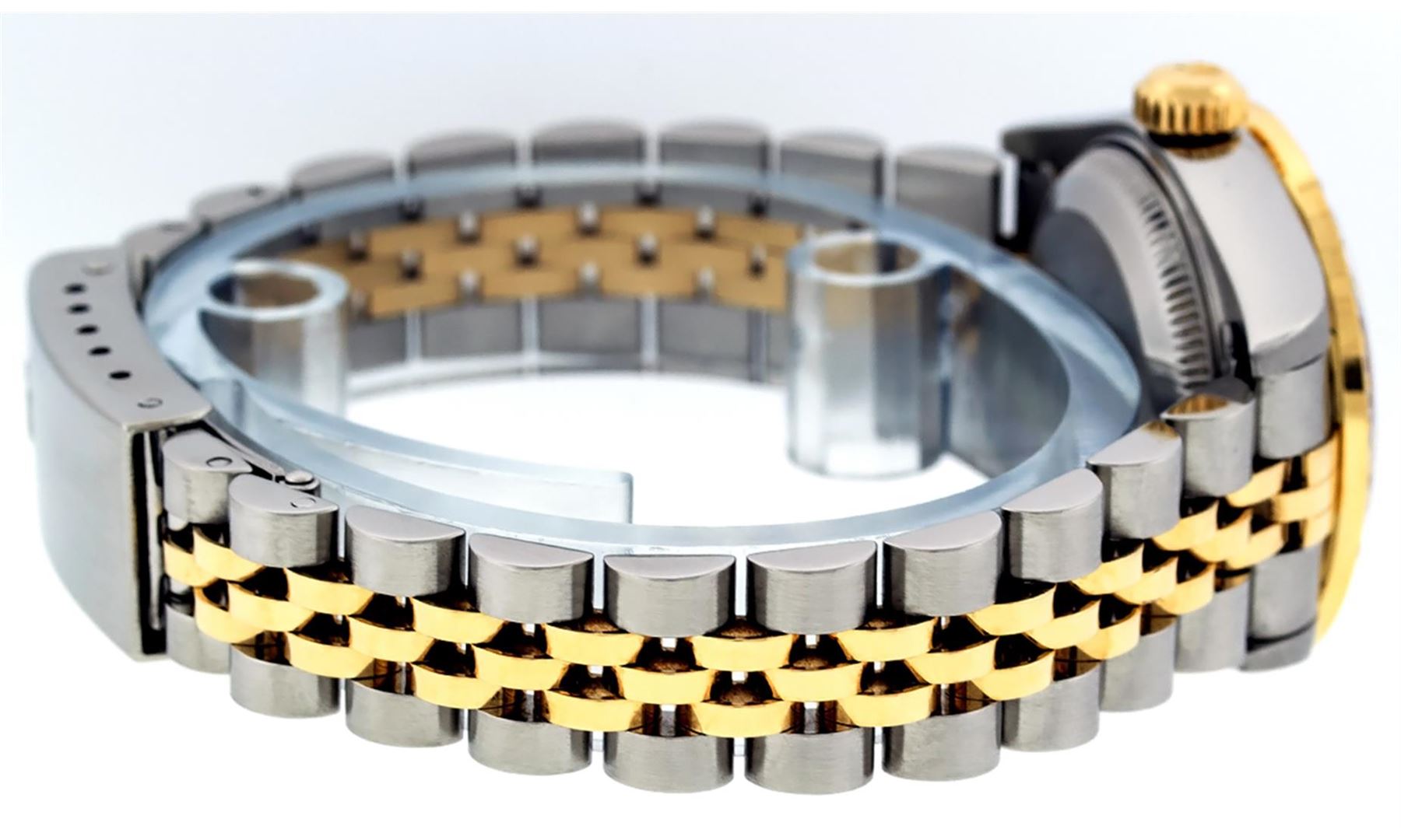 One Ladies Quickset 18K Two Tone Rolex Datejust Polished, Serviced & Electronically Tested, 18K Yellow Gold & Stainless Steel Case: 26mm, 18K Yellow Gold Crown. Custom Bezel: New 18K Yellow Gold Beadset Diamond Bezel, Diamond Count: 32 Diamonds On Bezel, Total Weight .70 Carat, Clarity: SI-VS, Color: G to H. Custom Crystal: New Scratch Resistant Synthetic Sapphire Cyclops Lens. Custom Hands: New Luminescent Hands. Movement: Automatic Winding Movement. Custom Dial: Refinished Mother Of Pearl Emerald String, Stone Count: 10 Emeralds + 33 Diamonds On Dial, Clarity: SI-VS, Color: G to H. Date Window: 3 O'Clock Position Date Display, Model: Quickset Datejust. Condition: G-6 Extra Fine. Bracelet: Two Tone 18K Yellow Gold & Stainless Steel Jubilee. Bright Polish. 6.0 Inch Length, Adjustable. Standard Clasp, With Rolex Logo. This Watch Has Been Serviced Time Tested And Is In Excellent Condition It Is Free Of All Scratches And Dents.
