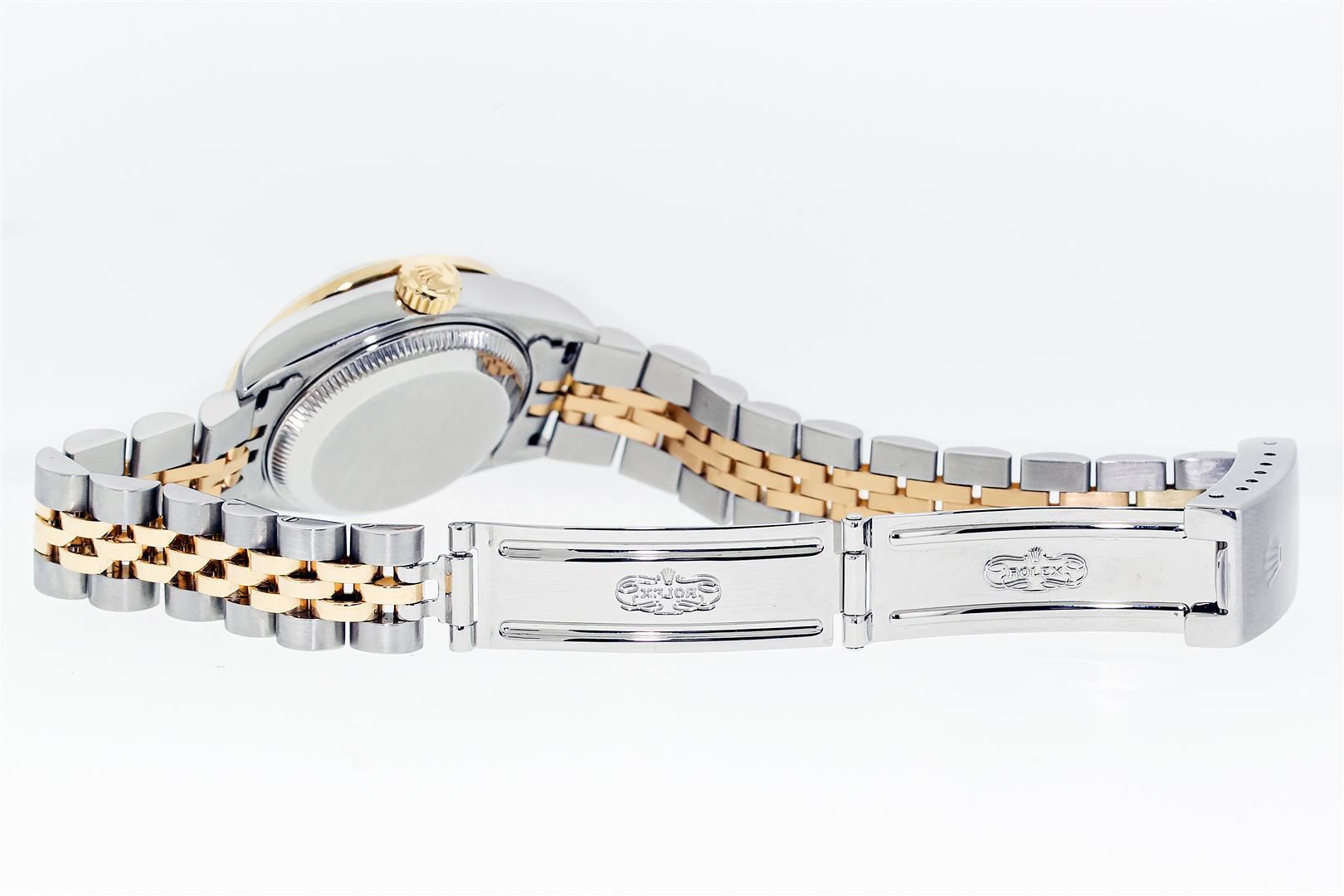 Rolex Ladies Pre Owned Sapphire Quickset 18K Yellow Gold and Stainless Steel Two Tone Datejust Polished Bright with Satin Finish, Serviced & Electronically Tested, Rolex Stainless Steel Case: 26mm, Rolex 18K Yellow Gold Crown, Custom Bezel: New Beadset Diamond Bezel, Diamond Count: 32 Diamonds On Bezel. Custom Crystal: New Sapphire With Magnified Date Window. Custom Hands: New Hands. Rolex Movement: Automatic Winding Movement 2235. Rolex Dial: Champagne With Index Hour Markers And Dash Track. Date Window: 3 O'Clock Position Date Display, Model: Quickset Datejust, Condition: G-6 Extra Fine. Rolex Bracelet: 18K Yellow Gold & Stainless Steel Jubilee Band. Bright Polish & Satin Finish. 6.0 Inch Length, Adjustable. Standard Clasp, With Rolex Logo. This Watch Has Been Serviced Time Tested And Is In Excellent Condition It Is Free Of All Scratches And Dents.