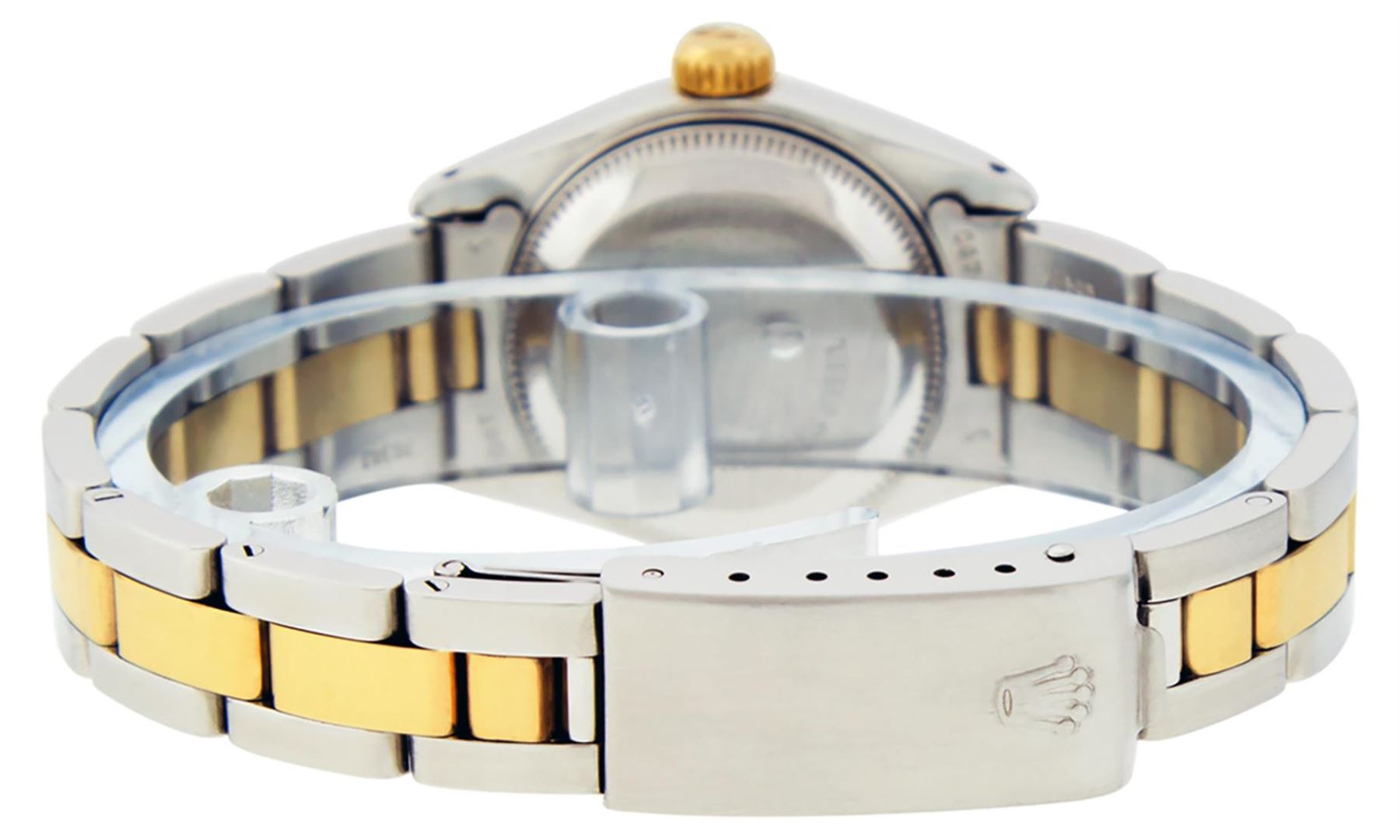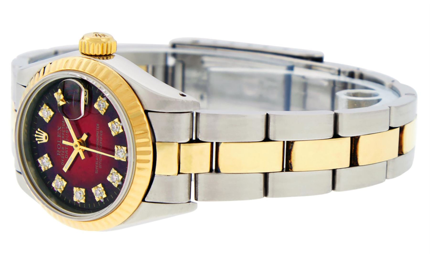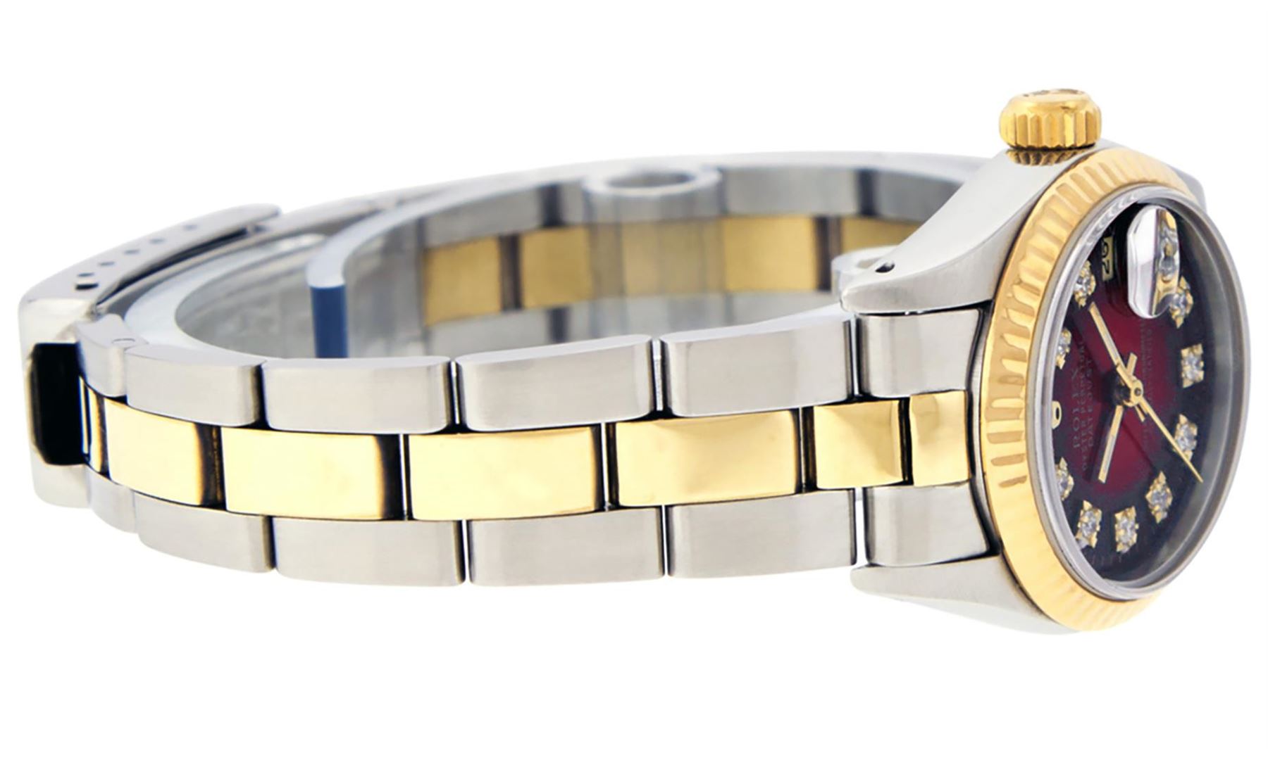 One Ladies Two Tone Rolex Datejust Polished, Serviced & Electronically Tested, Yellow Gold & Stainless Steel Case: 26mm, Yellow Gold Crown, Bezel: Yellow Gold Fluted Bezel. Custom Crystal: New Acrylic Cyclops Lens. Custom Hands: New Luminescent Hands. Movement: Automatic Winding Movement. Custom Dial: Red Vignette With Diamond Hour Markers Dash Track & Lumi Dots, Diamond Count: 10 Single Cut Diamonds, Color: G to H, Clarity: VS. Date Window: 3 O'Clock Position Date Display, Model: Datejust. Condition: G-6 Extra Fine. Bracelet: Two Tone Yellow Gold & Stainless Steel Oyster Band. Bright Polish. 6.0 Inch Length, Adjustable. Standard Clasp, With Rolex Logo. This Watch Has Been Serviced Time Tested And Is In Excellent Condition It Is Free Of All Scratches And Dents.