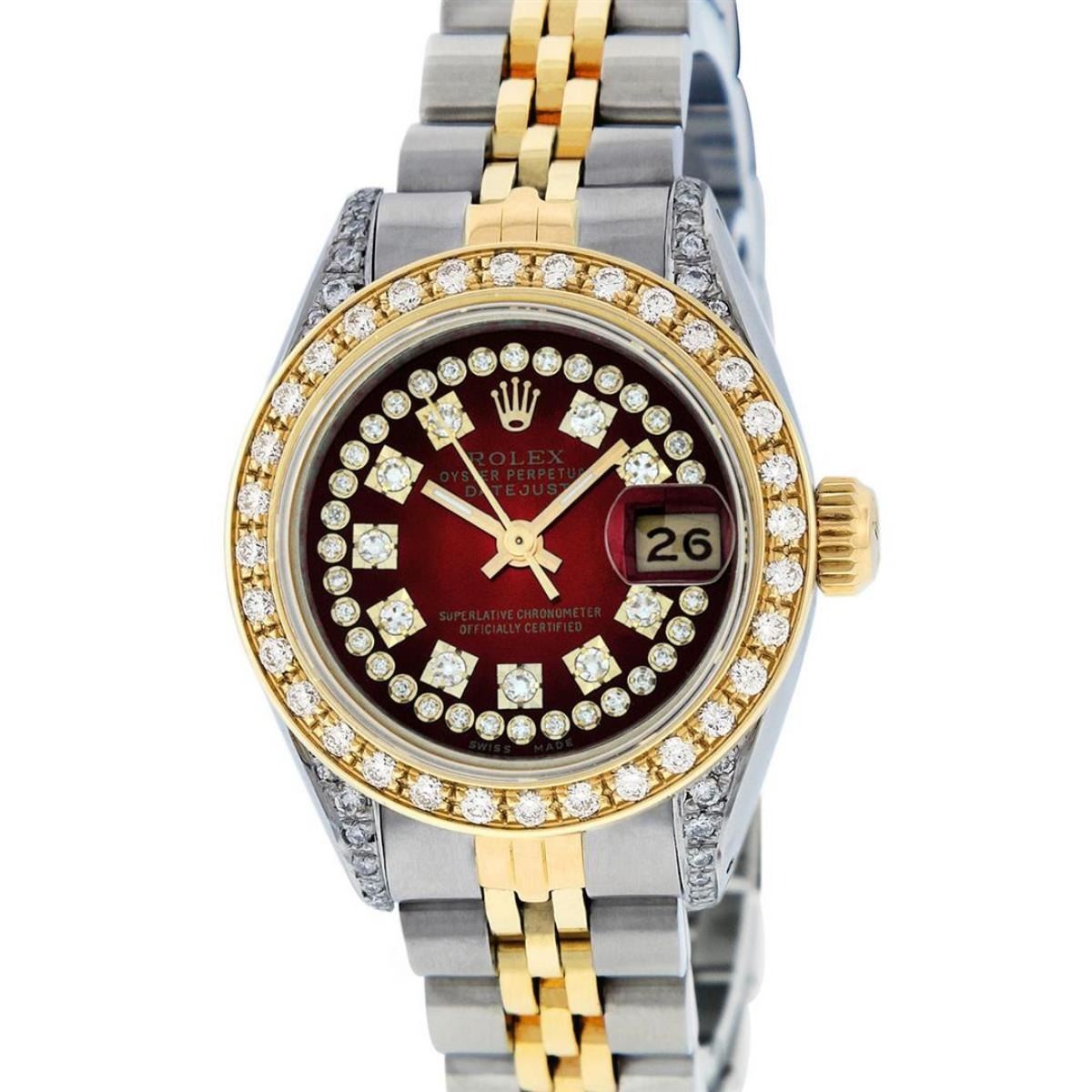 One Ladies Two Tone Yellow Gold And Stainless Steel Rolex Datejust Polished, Serviced & Electronically Tested, Yellow Gold & Stainless Steel Case: 26mm, Yellow Gold Crown, Diamond Lugs: 24 Diamonds On Lugs, Clarity: SI-VS, Color: G to H. Custom Bezel: New 18K Yellow Gold Beadset Diamond Bezel, Diamond Count: 32 Diamonds On Bezel, Total Weight .70 Carat, Clarity: SI-VS, Color: G to H. Custom Crystal: New Synthetic Scratch Resistant Sapphire Cyclops Lens. Custom Hands: New Luminescent Hands. Movement: Automatic Winding Movement. Custom Dial: Refinished Red Vignette With String Single Cut Diamond Hour Markers, Diamond Count: 43 Diamonds On Dial, Clarity: SI-VS, Color: G to H. Date Window: 3 O'Clock Position Date Display, Model: Datejust. Condition: G-6 Extra Fine. Bracelet: Two Tone Yellow Gold & Stainless Steel Jubilee Band. Bright Polish. 6.0 Inch Length, Adjustable. Standard Clasp, With Rolex Logo. This Watch Has Been Serviced Time Tested And Is In Excellent Condition It Is Free Of All Scratches And Dents.