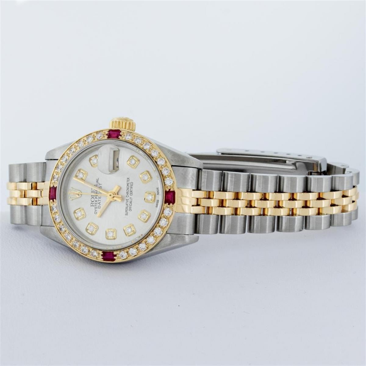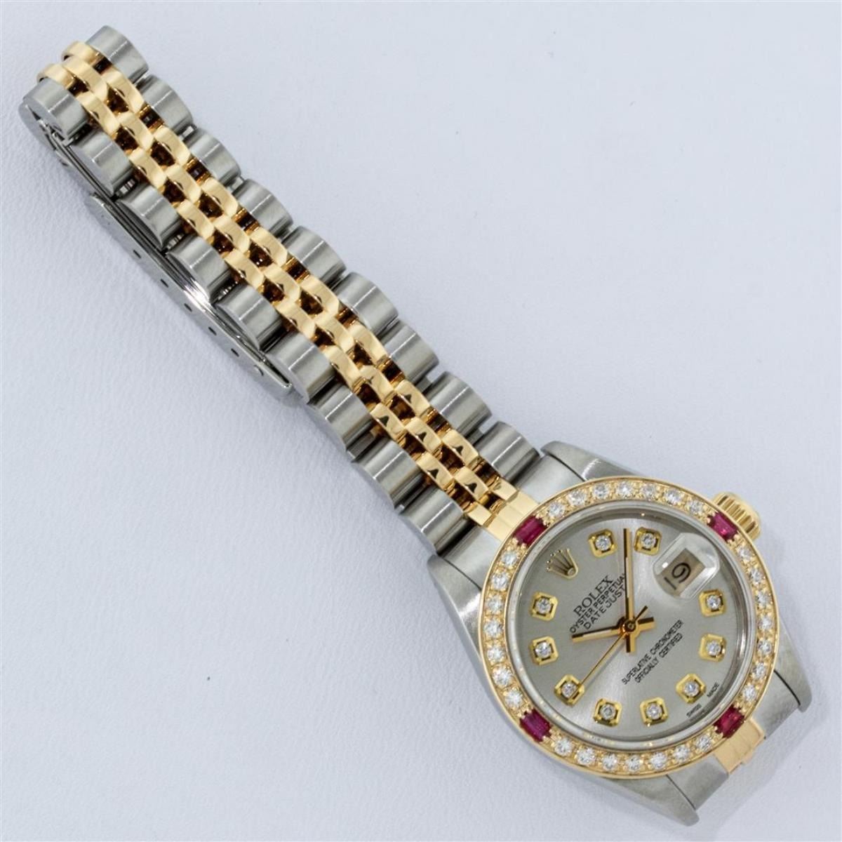 One Ladies Two Tone Rolex Datejust Polished, Serviced & Electronically Tested, Yellow Gold & Stainless Steel Case: 26mm, Yellow Gold Crown, Custom Bezel: New 18K Yellow Gold Ruby Beadset Diamond Bezel, Diamond + Gem Count: 28 Diamonds + 4 Rubies Total Weight .70 Carat, Clarity: Si-VS, Color: G to H. Custom Crystal: New Synthetic Sapphire Cyclops Lens. Custom Hands: New Luminescent Hands. Movement: Automatic Winding Movement. Custom Dial: Silver With Diamond Hour Markers, Diamond Count: 10 Diamonds On Dial, G To H In Color, Si-VS Clarity. Date Window: 3 O'Clock Position Date Display, Model: Datejust, Condition: G-6 Extra Fine. Bracelet: Two Tone Yellow Gold & Stainless Steel Jubilee. Bright Polish. 6.0 Inch Length, Adjustable. Standard Clasp, With Rolex Logo. This Watch Has Been Serviced Time Tested And Is In Excellent Condition It Is Free Of All Scratches And Dents.