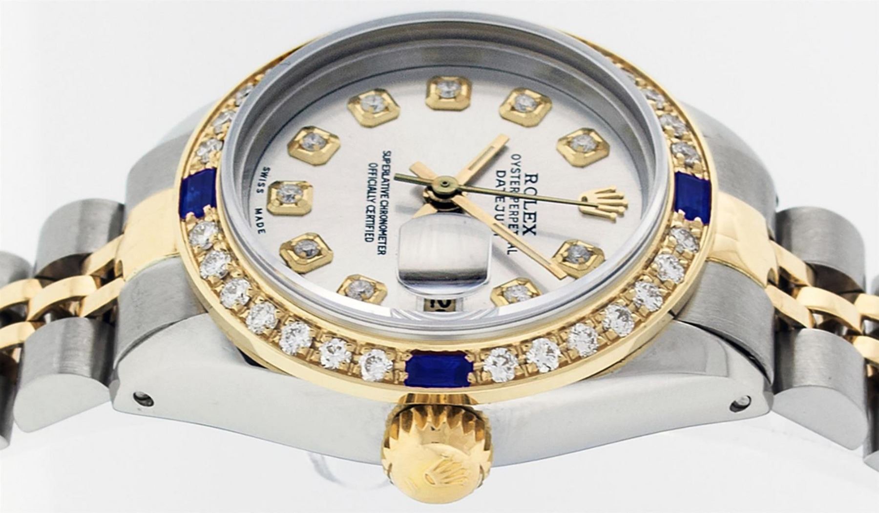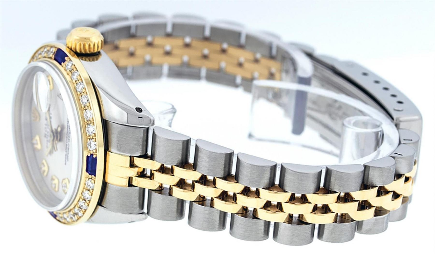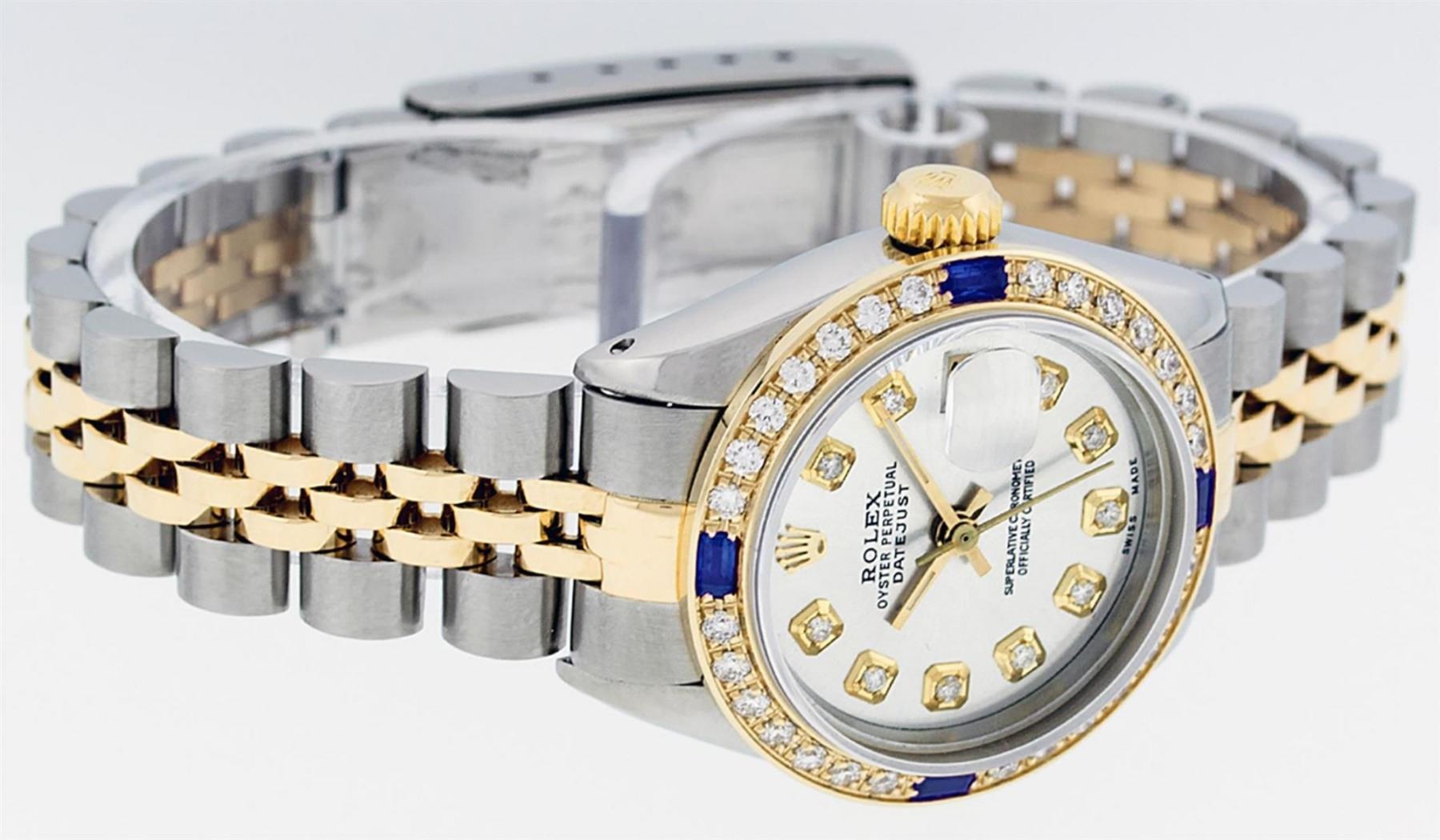 One Ladies 14K Two Tone Rolex Datejust Polished, Serviced & Electronically Tested, 14K Yellow Gold & Stainless Steel Case: 26mm, 14K Yellow Gold Crown, Custom Bezel: New 18K Yellow Gold Sapphire Beadset Diamond Bezel, Diamond + Gem Count: 28 Diamonds + 4 Sapphires, Total Weight .70 Carat, Clarity: SI-VS, Color: G to H. Custom Crystal: New Scratch Resistant Synthetic Sapphire Cyclops Lens. Custom Hands: New Luminescent Hands. Movement: Automatic Winding Movement Caliber 2030. Custom Dial: Silver Set With Diamond Hour Markers, Diamond Count: 10 Diamonds in Dial, G To H In Color, SI-VS Clarity. Date Window: 3 O'Clock Position Date Display, Model: Datejust, Condition: G-6 Extra Fine. Bracelet: Two Tone 14K Yellow Gold & Stainless Steel Jubilee Band. Bright Polish. 6.0 Inch Length, Adjustable. Standard Clasp, With Rolex Logo. This Watch Has Been Serviced Time Tested And Is In Excellent Condition It Is Free Of All Scratches And Dents.