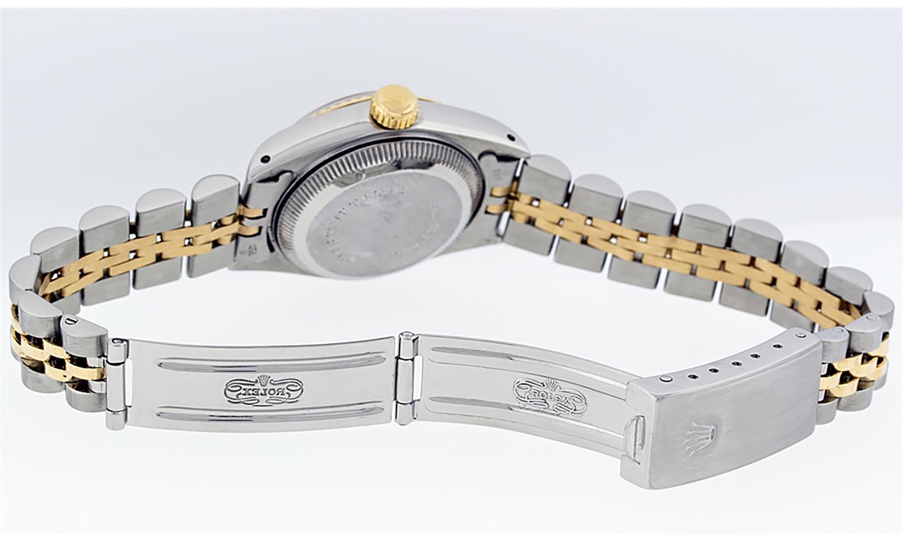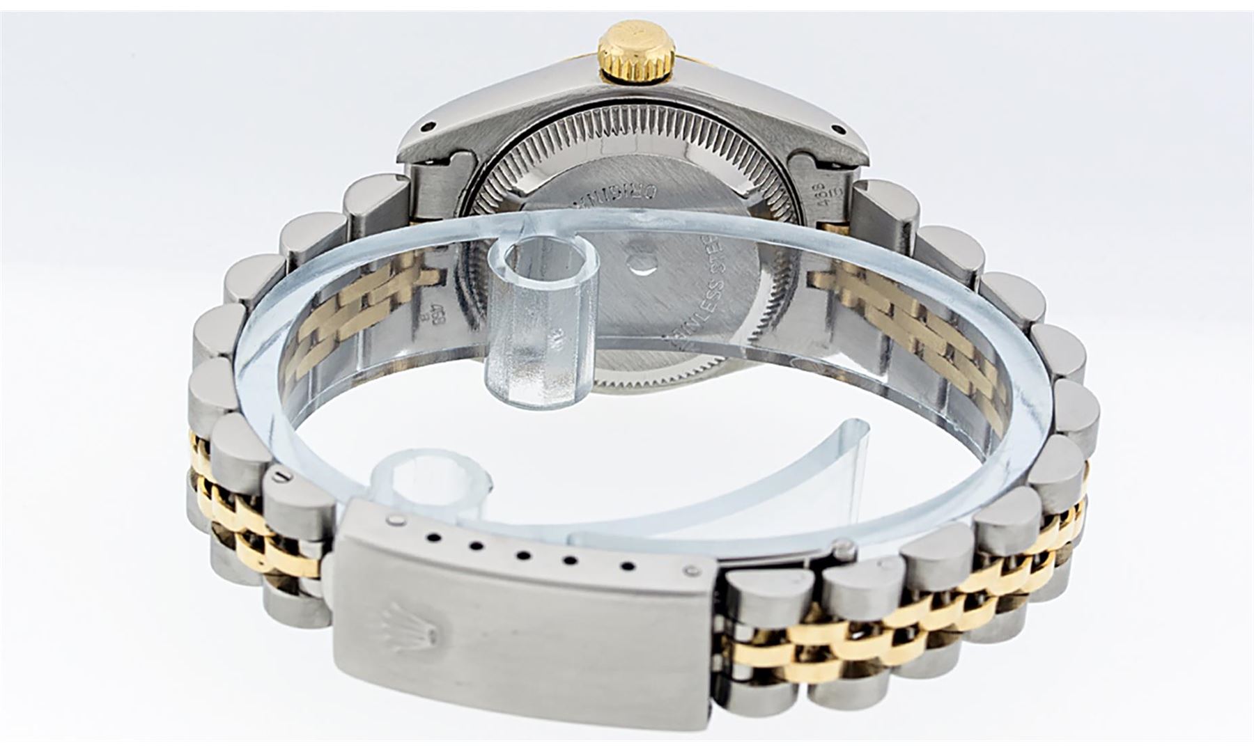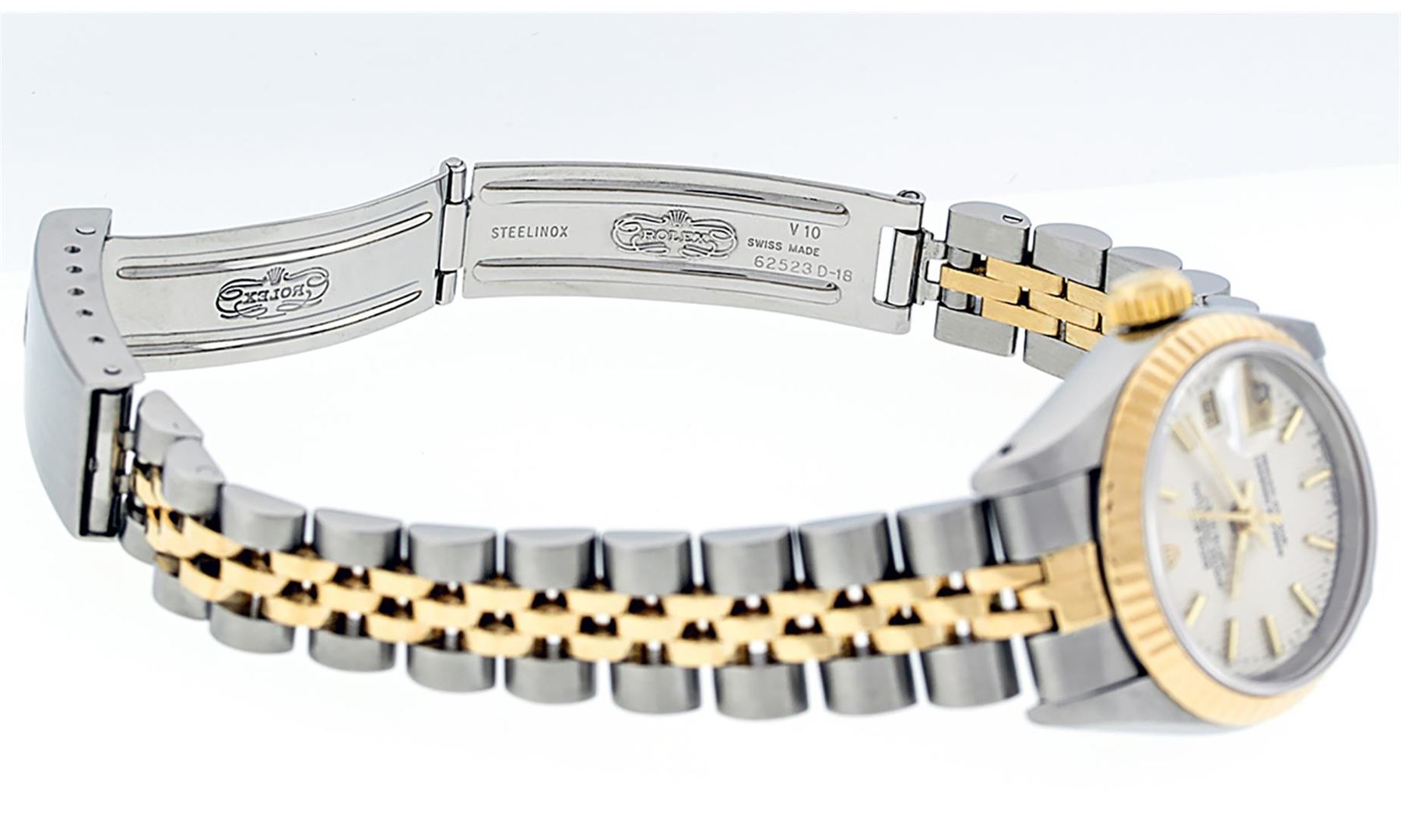 One Ladies Two Tone Rolex Datejust Polished, Serviced & Electronically Tested, Yellow Gold & Stainless Steel Case: 26mm, Yellow Gold Crown, Bezel: Yellow Gold Fluted Bezel. Custom Crystal: New Acrylic Cyclops Lens. Hands: Luminescent Hands. Movement: Automatic Winding Movement. Dial: Silver Index Tapestry With Dash Track & Lumi Dots. Date Window: 3 O'Clock Position Date Display, Model: Datejust. Condition: G-6 Extra Fine. Bracelet: Two Tone Yellow Gold & Stainless Steel Jubilee Band. Bright Polish. 6.0 Inch Length, Adjustable. Standard Clasp, With Rolex Logo. This Watch Has Been Serviced Time Tested And Is In Excellent Condition It Is Free Of All Scratches And Dents.