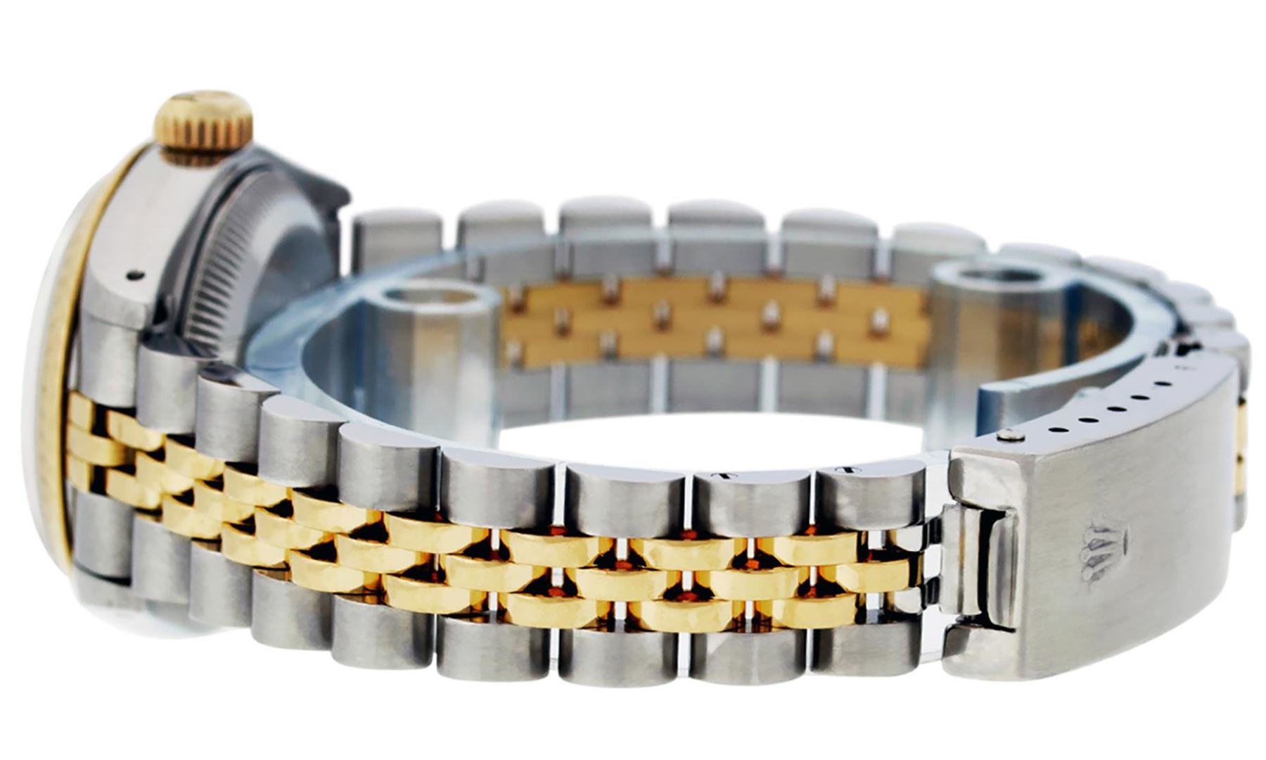 One Ladies Two Tone Rolex Datejust Polished, Serviced & Electronically Tested, Yellow Gold & Stainless Steel Case: 26mm, Yellow Gold Crown, Bezel: Yellow Gold Fluted Bezel. Custom Crystal: New Acrylic Cyclops Lens. Custom Hands: New Luminescent Hands. Movement: Automatic Winding Movement. Custom Dial: Slate Grey Jubilee With Single Cut Diamond Hour Markers, Diamond Count: 10 Diamonds On Dial, Color: G to H, Clarity: VS2-SI1. Date Window: 3 O'Clock Position Date Display, Model: Datejust. Condition: G-6 Extra Fine. Bracelet: Two Tone Yellow Gold & Stainless Steel Jubilee. Bright Polish. 6.0 Inch Length, Adjustable. Standard Clasp, With Rolex Logo. This Watch Has Been Serviced Time Tested And Is In Excellent Condition It Is Free Of All Scratches And Dents.