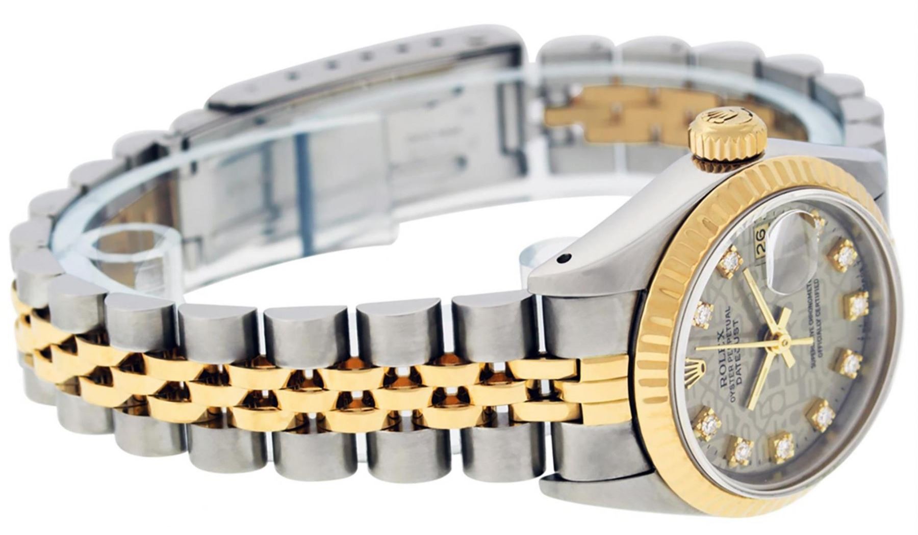 One Ladies Two Tone Rolex Datejust Polished, Serviced & Electronically Tested, Yellow Gold & Stainless Steel Case: 26mm, Yellow Gold Crown, Bezel: Yellow Gold Fluted Bezel. Custom Crystal: New Acrylic Cyclops Lens. Custom Hands: New Luminescent Hands. Movement: Automatic Winding Movement. Custom Dial: Slate Grey Jubilee With Single Cut Diamond Hour Markers, Diamond Count: 10 Diamonds On Dial, Color: G to H, Clarity: VS2-SI1. Date Window: 3 O'Clock Position Date Display, Model: Datejust. Condition: G-6 Extra Fine. Bracelet: Two Tone Yellow Gold & Stainless Steel Jubilee. Bright Polish. 6.0 Inch Length, Adjustable. Standard Clasp, With Rolex Logo. This Watch Has Been Serviced Time Tested And Is In Excellent Condition It Is Free Of All Scratches And Dents.