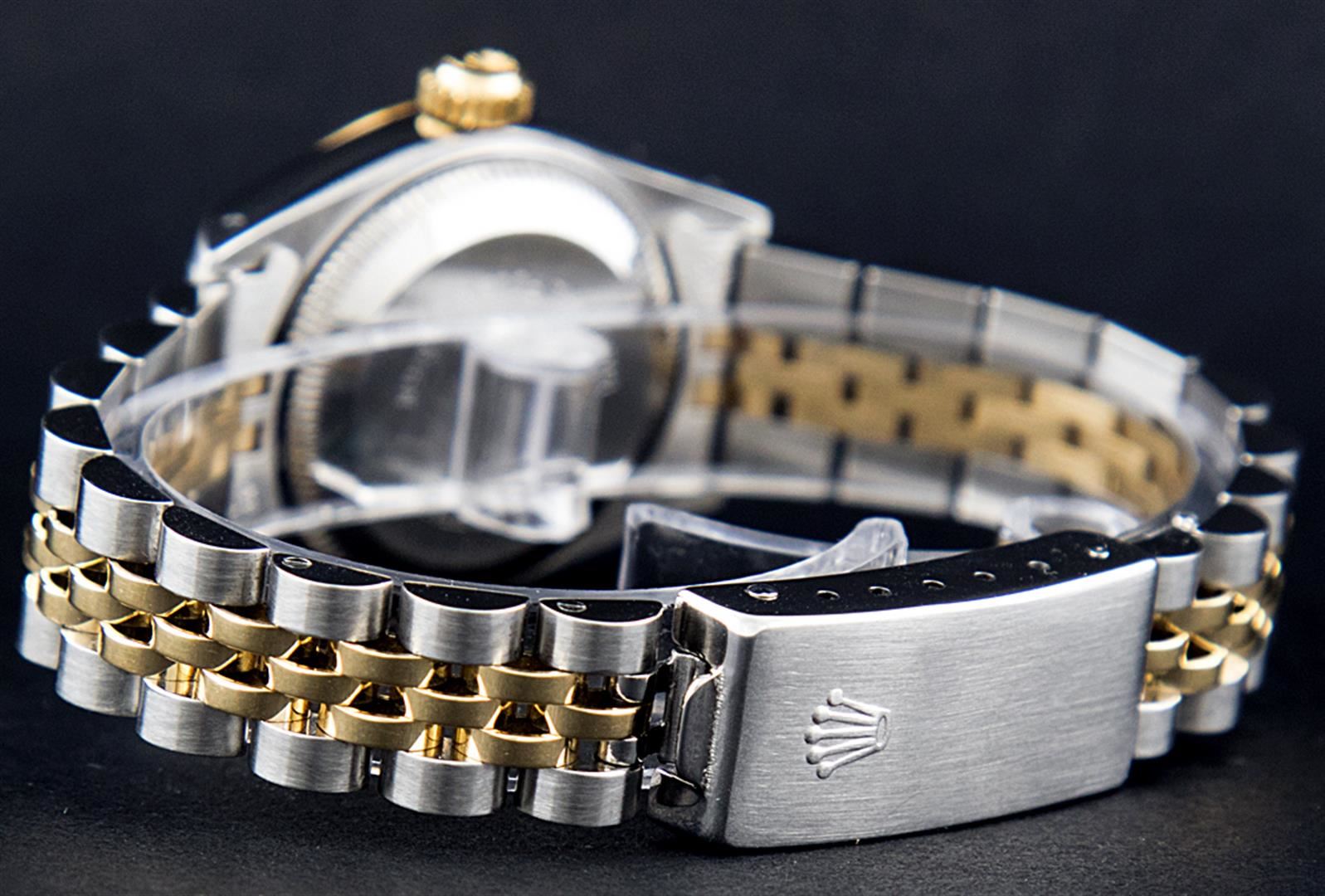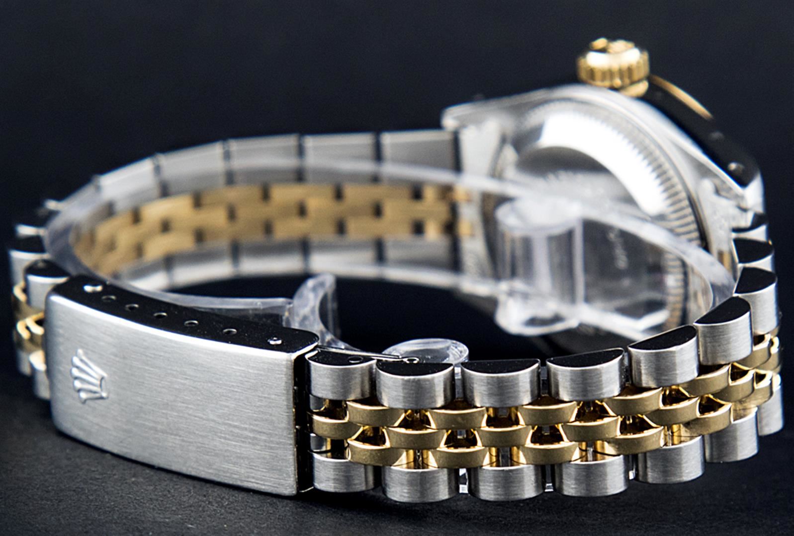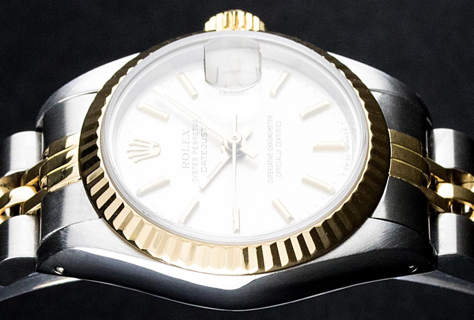One Ladies Two Tone Rolex Datejust Polished, Serviced & Electronically Tested, Yellow Gold & Stainless Steel Case: 26mm, Yellow Gold Crown, Bezel: Yellow Gold Fluted Bezel. Custom Crystal: New Acrylic Cyclops Lens. Custom Hands: New Luminescent Hands. Movement: Automatic Winding Movement. Custom Dial: White Index With Dash Track. Date Window: 3 O'Clock Position Date Display, Model: Datejust. Condition: G-6 Extra Fine. Bracelet: Two Tone Yellow Gold & Stainless Steel Jubilee Band. Bright Polish. 6.0 Inch Length, Adjustable. Standard Clasp, With Rolex Logo. This Watch Has Been Serviced Time Tested And Is In Excellent Condition It Is Free Of All Scratches And Dents.