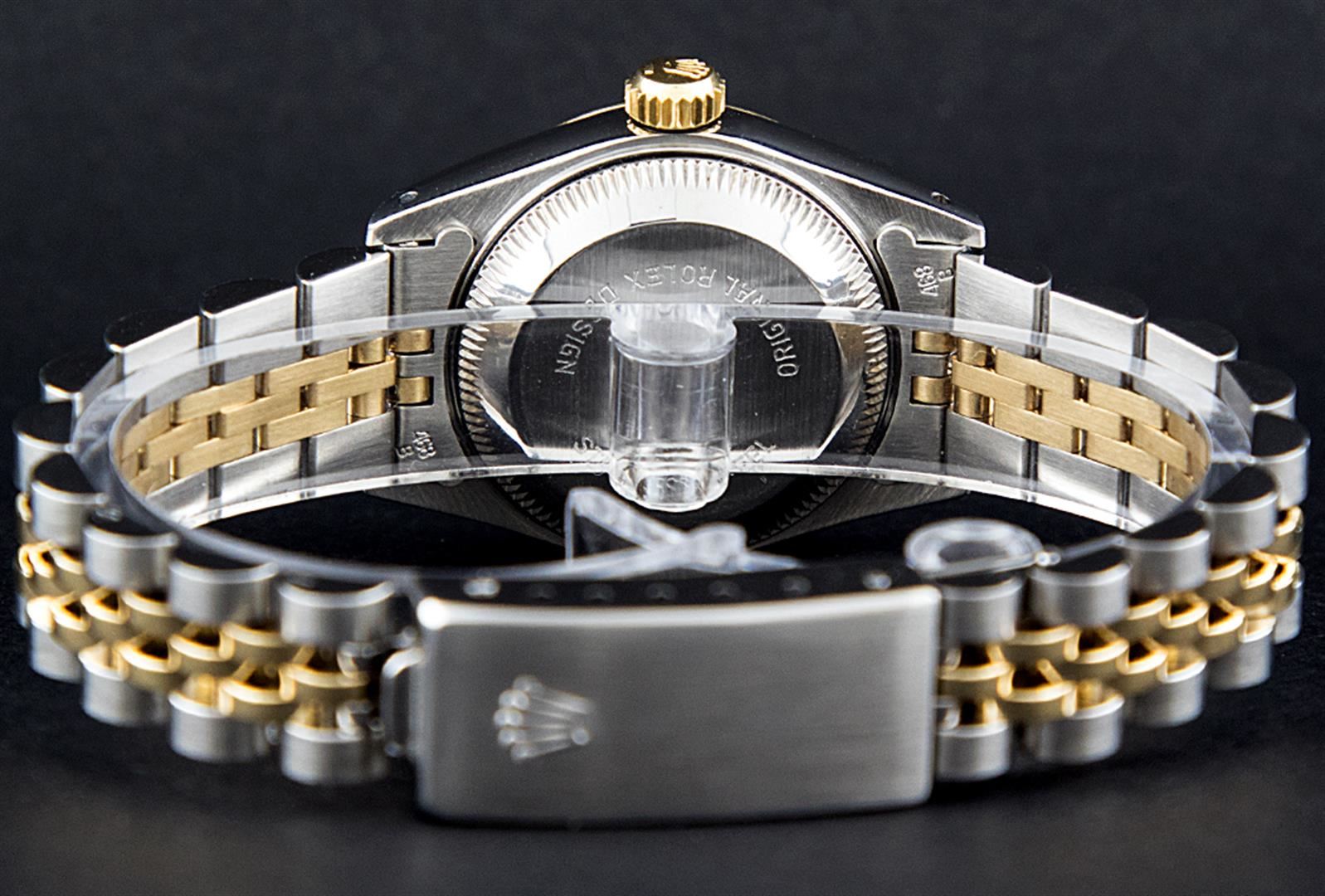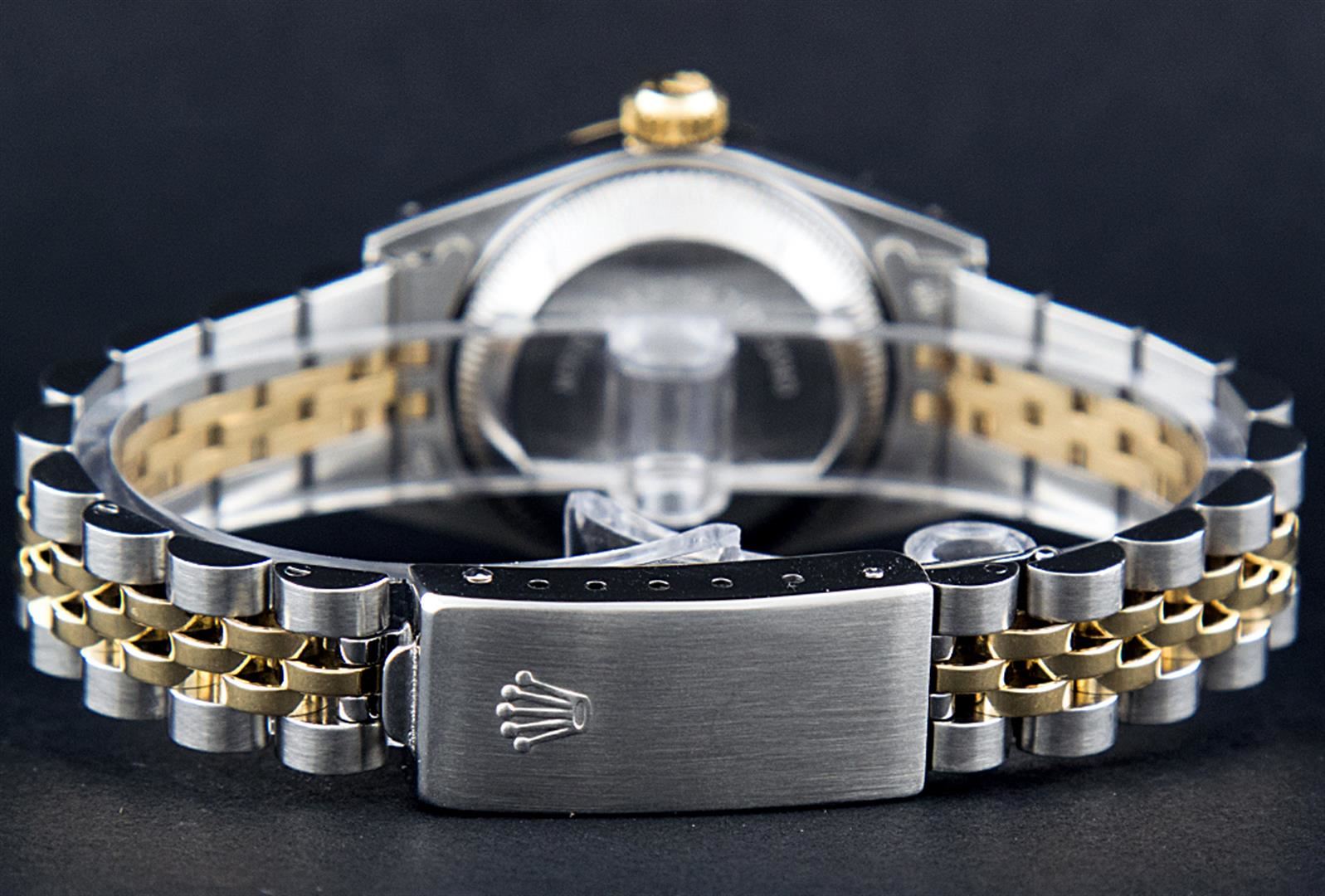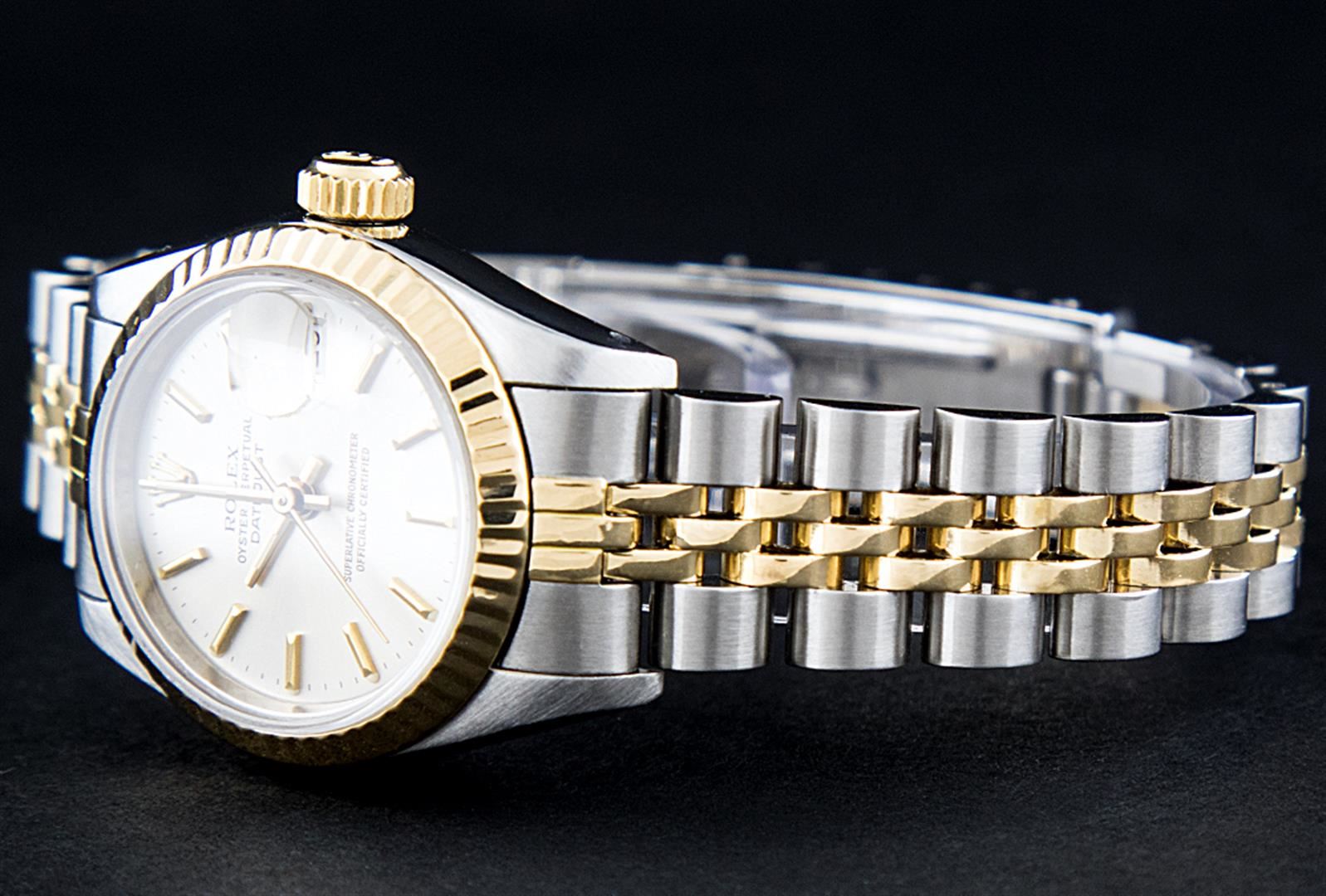 One Ladies Two Tone Rolex Datejust Polished, Serviced & Electronically Tested, Yellow Gold & Stainless Steel Case: 26mm, Yellow Gold Crown, Bezel: Yellow Gold Fluted Bezel. Custom Crystal: New Acrylic Cyclops Lens. Custom Hands: New Luminescent Hands. Movement: Automatic Winding Movement. Custom Dial: White Index With Dash Track. Date Window: 3 O'Clock Position Date Display, Model: Datejust. Condition: G-6 Extra Fine. Bracelet: Two Tone Yellow Gold & Stainless Steel Jubilee Band. Bright Polish. 6.0 Inch Length, Adjustable. Standard Clasp, With Rolex Logo. This Watch Has Been Serviced Time Tested And Is In Excellent Condition It Is Free Of All Scratches And Dents.