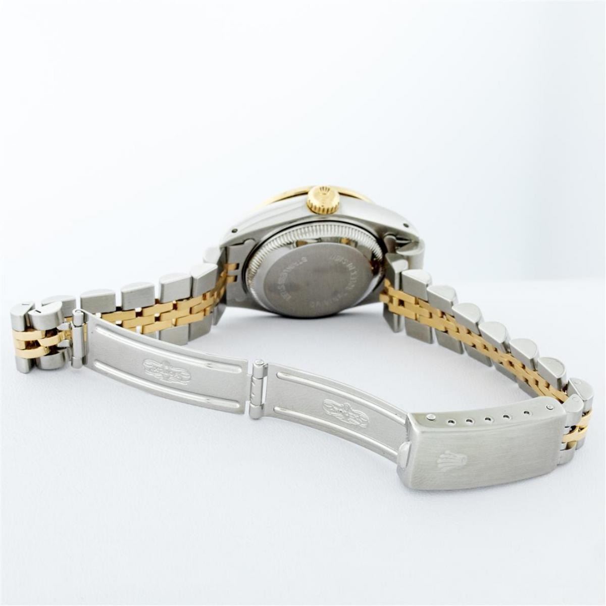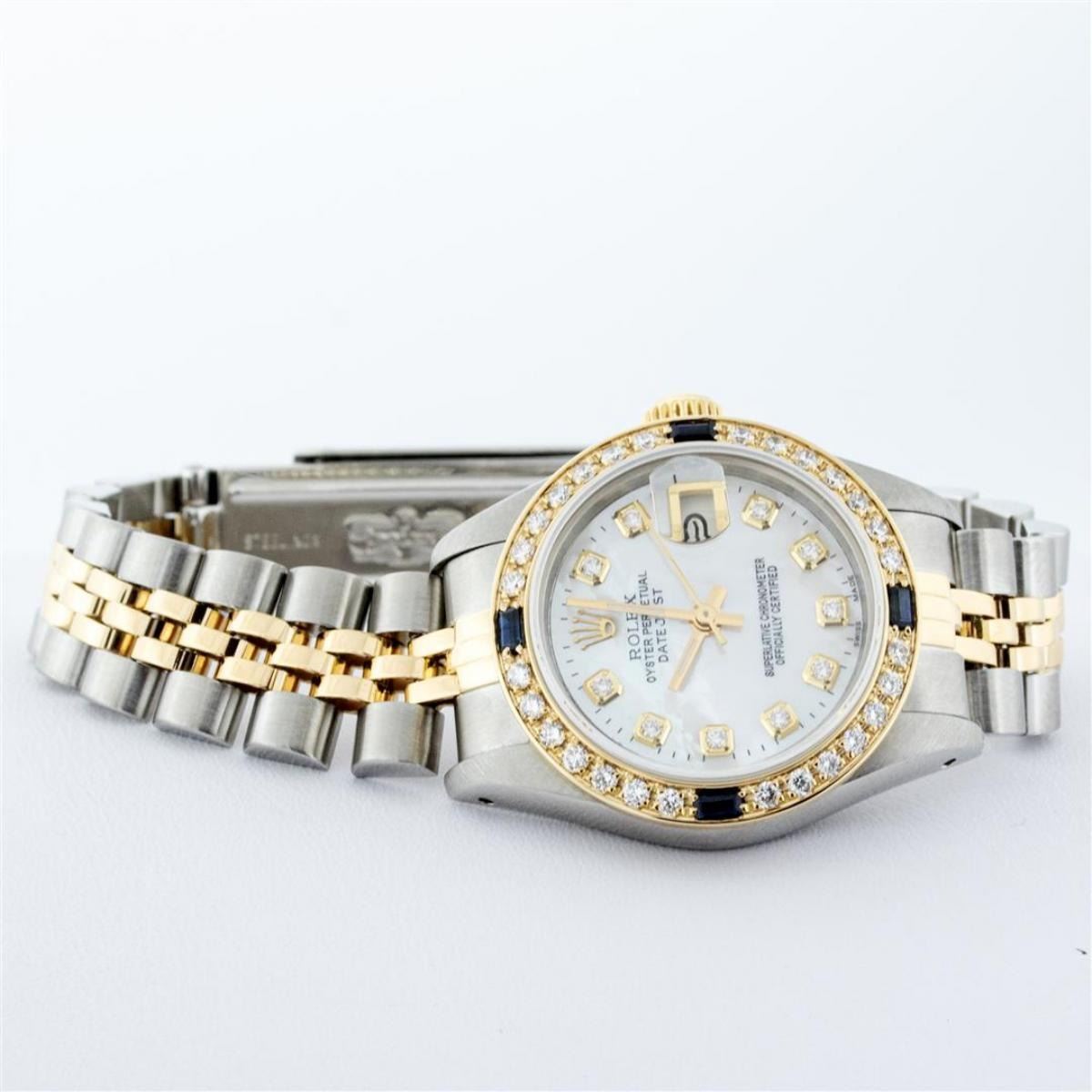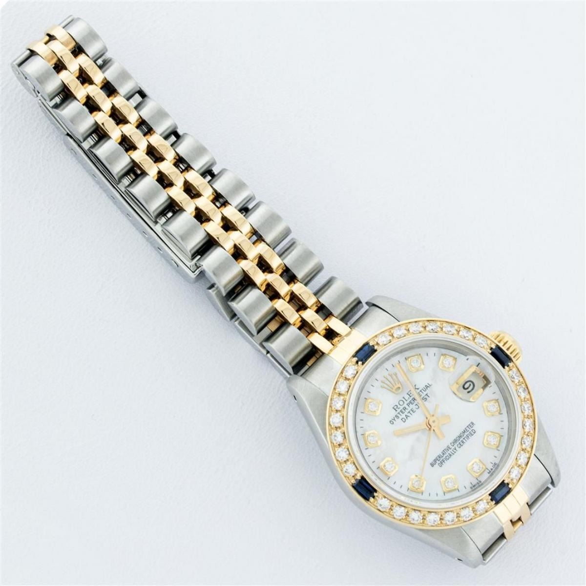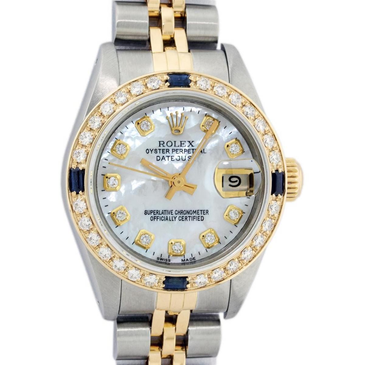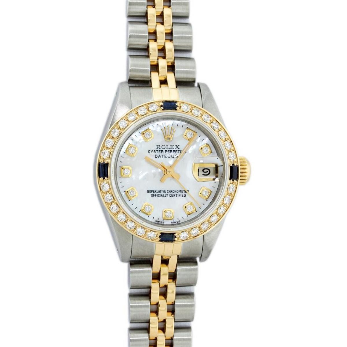 One Ladies Two Tone Yellow Gold Rolex Datejust Polished, Serviced & Electronically Tested, Yellow Gold & Stainless Steel Case: 26mm, Yellow Gold Crown, Custom Bezel: New 18K Yellow Gold Sapphire Beadset Diamond Bezel, Diamond + Gem Count: 28 Diamonds + 4 Sapphires Total Weight.70 Carat, Clarity: SI-VS, Color: G to H. Custom Crystal: New Scratch Resistant Synthetic Sapphire Cyclops Lens. Custom Hands: New Luminescent Hands. Movement: Automatic Winding Movement. Custom Dial: Mother Of Pearl Set With Diamond Hour Markers & Dash Track, Diamond Count: 10 Diamonds On Dial, G To H In Color, SI-VS Clarity. Date Window: 3 O'Clock Position Date Display, Model: Datejust, Condition: G-6 Extra Fine. Bracelet: Two Tone Yellow Gold Yellow Gold & Stainless Steel Jubilee Band. Bright Polish. 6.0 Inch Length, Adjustable. Standard Clasp, With Rolex Logo. This Watch Has Been Serviced Time Tested And Is In Excellent Condition It Is Free Of All Scratches And Dents.