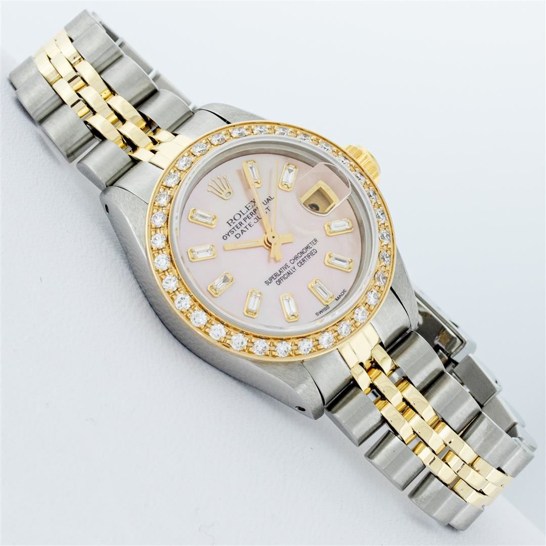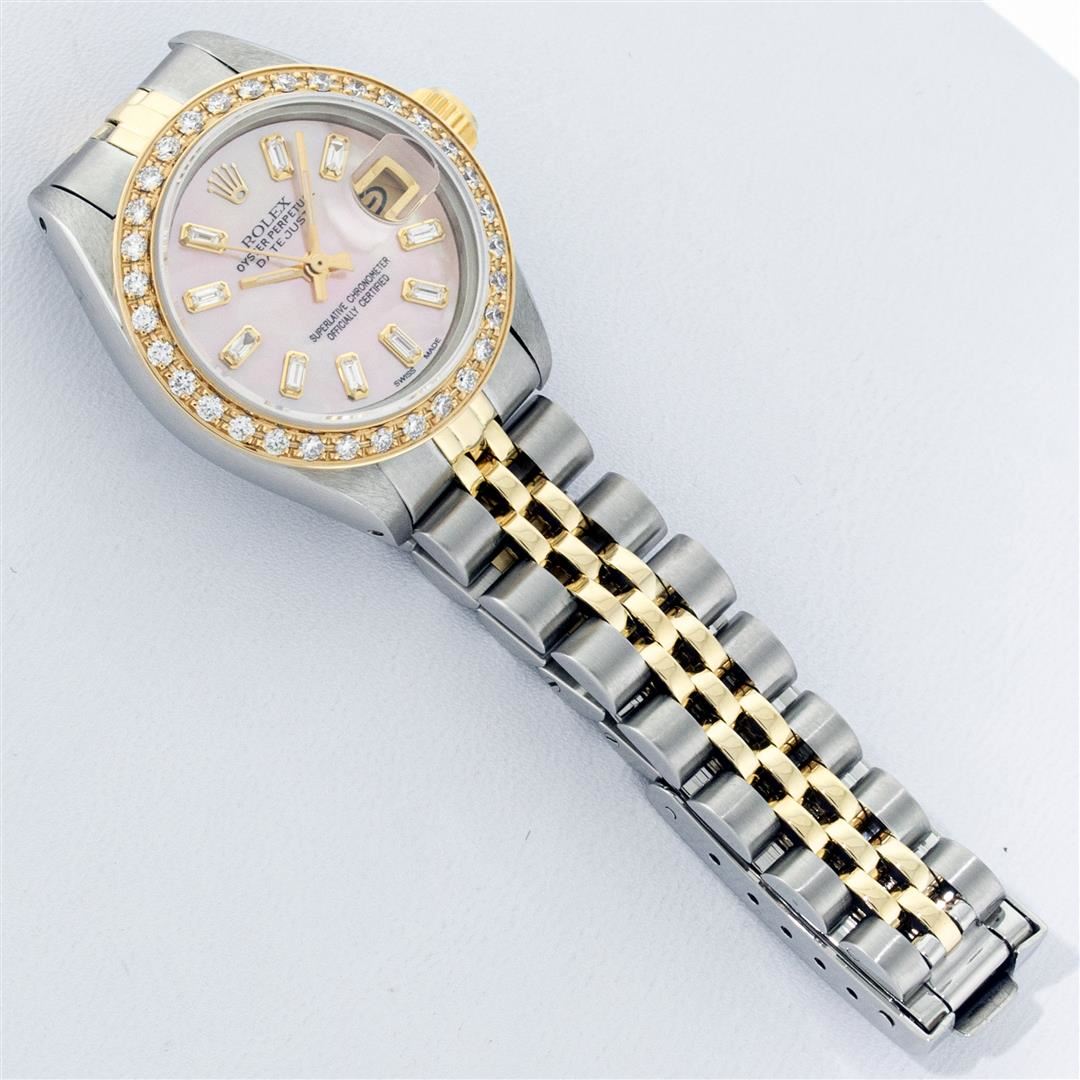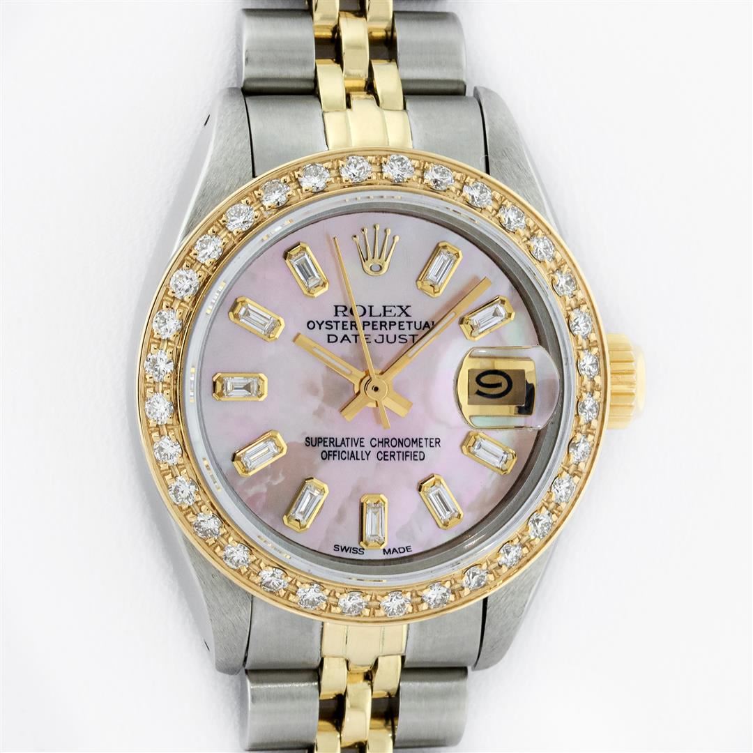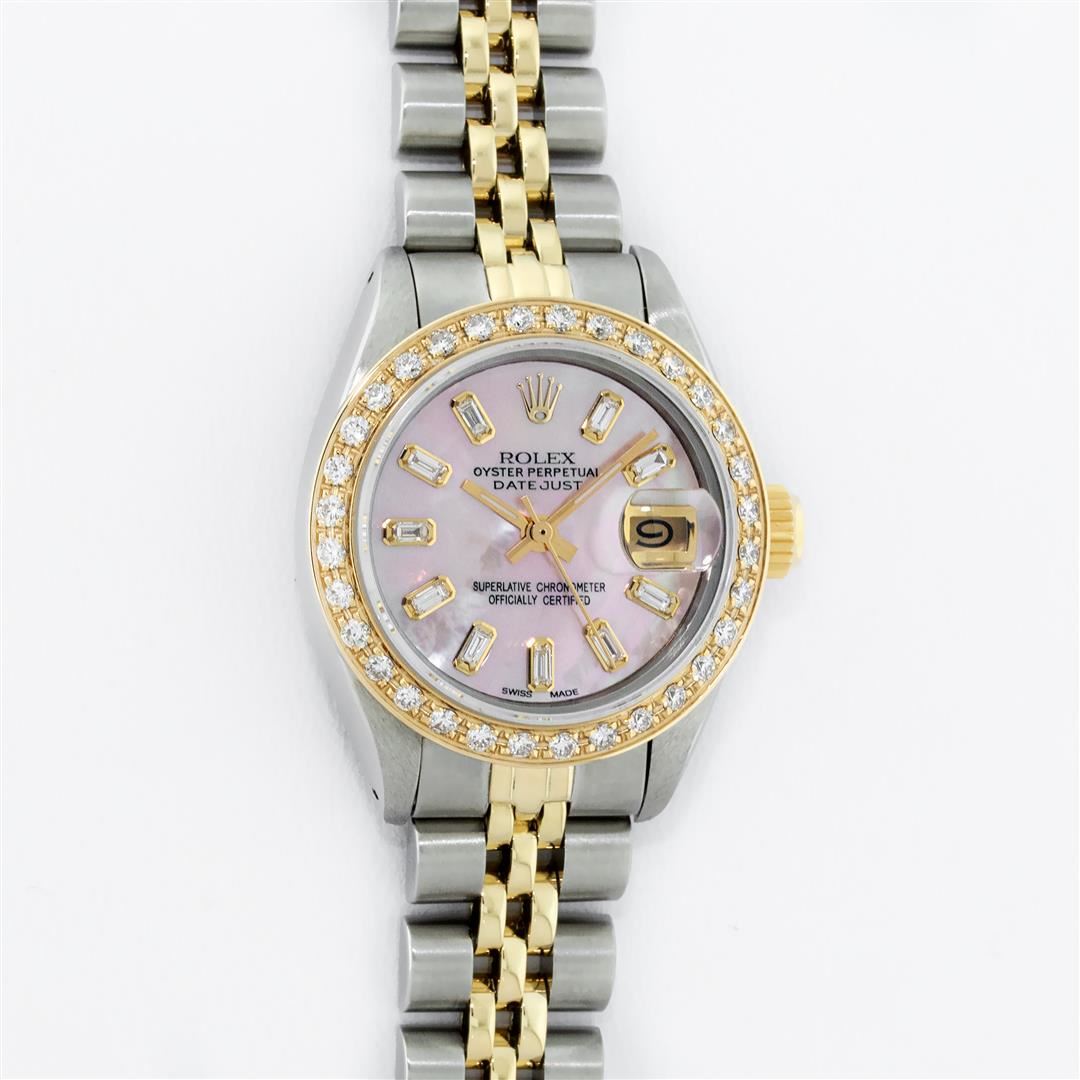 One Ladies Two Tone Yellow Gold Rolex Datejust Polished, Serviced & Electronically Tested, Yellow Gold & Stainless Steel Case: 26mm, Yellow Gold Crown, Custom Bezel: New 18K Yellow Gold Beadset Diamond Bezel, Diamond Count: 32 Diamonds On Bezel, Total Weight.70 Carat, Clarity: SI-VS, Color: G to H. Custom Crystal: New Scratch Resistant Synthetic Sapphire Cyclops Lens. Custom Hands: New Luminescent Hands. Movement: Automatic Winding Movement. Custom Dial: Pink MOP Baguatte Diamond Dial, Diamond Count: 10 Baguette Diamonds On Dial, G To H In Color, SI-VS Clarity. Date Window: 3 O'Clock Position Date Display, Model: Datejust, Condition: G-6 Extra Fine. Bracelet: Two Tone Yellow Gold Yellow Gold & Stainless Steel Jubilee Band. Bright Polish. 6.0 Inch Length, Adjustable. Standard Clasp, With Rolex Logo. This Watch Has Been Serviced Time Tested And Is In Excellent Condition It Is Free Of All Scratches And Dents.
