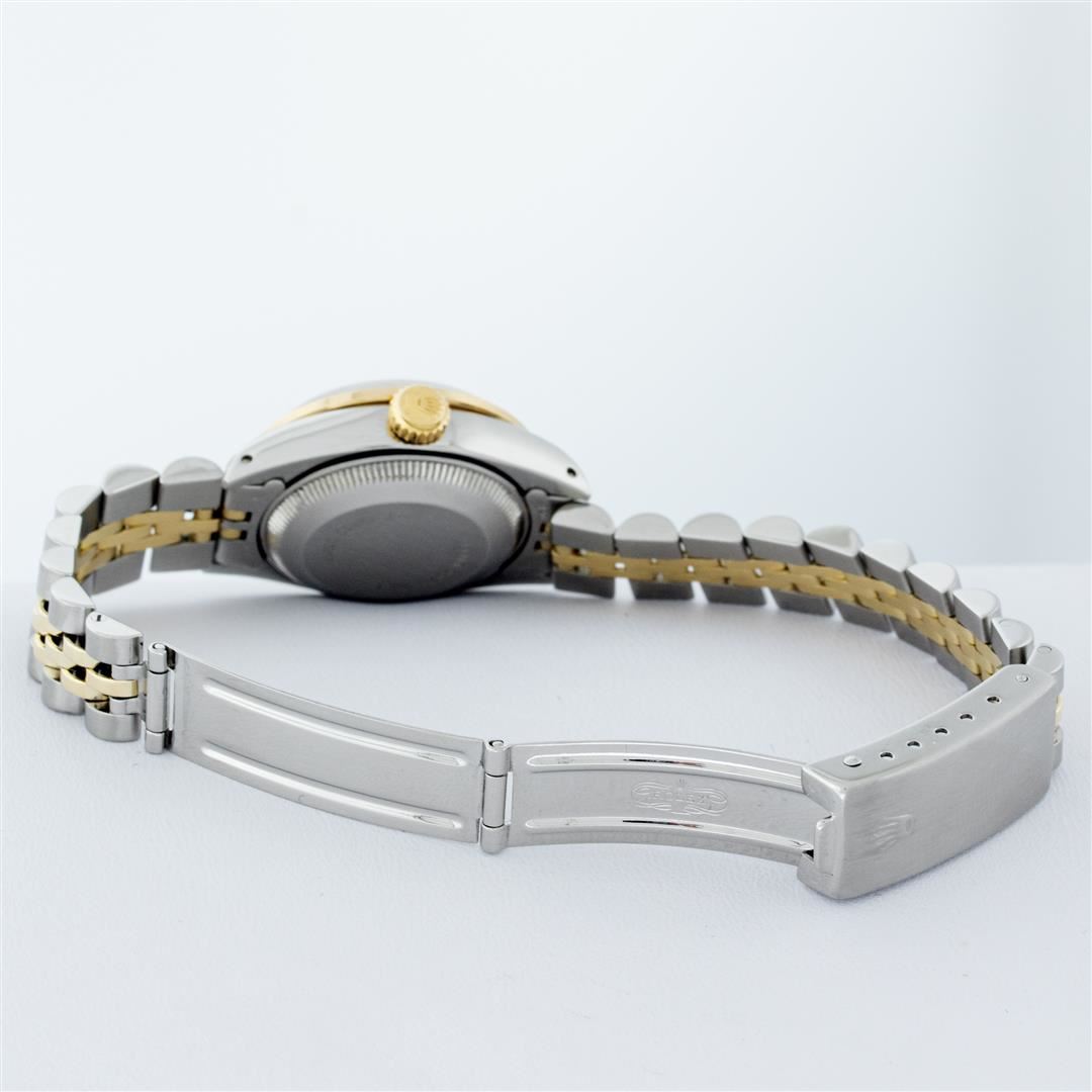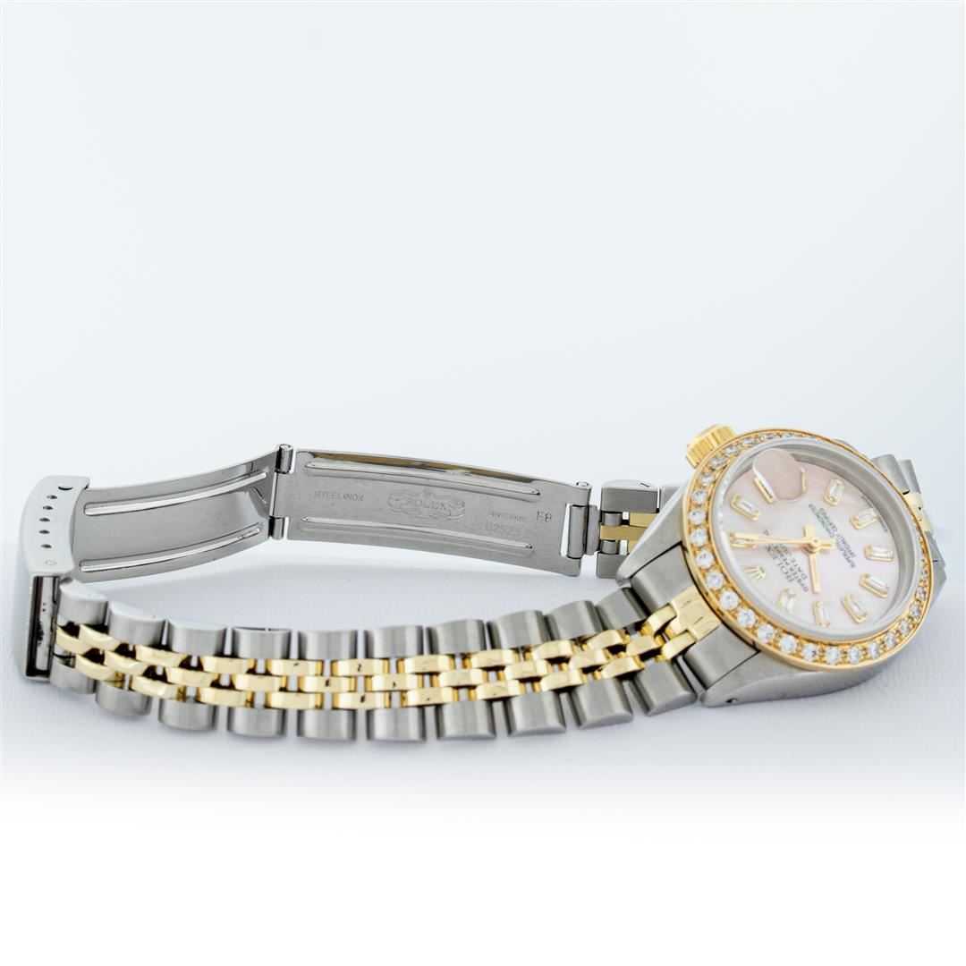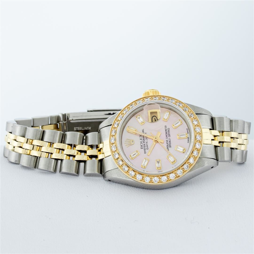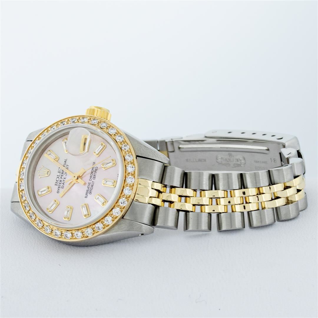 One Ladies Two Tone Yellow Gold Rolex Datejust Polished, Serviced & Electronically Tested, Yellow Gold & Stainless Steel Case: 26mm, Yellow Gold Crown, Custom Bezel: New 18K Yellow Gold Beadset Diamond Bezel, Diamond Count: 32 Diamonds On Bezel, Total Weight.70 Carat, Clarity: SI-VS, Color: G to H. Custom Crystal: New Scratch Resistant Synthetic Sapphire Cyclops Lens. Custom Hands: New Luminescent Hands. Movement: Automatic Winding Movement. Custom Dial: Pink MOP Baguatte Diamond Dial, Diamond Count: 10 Baguette Diamonds On Dial, G To H In Color, SI-VS Clarity. Date Window: 3 O'Clock Position Date Display, Model: Datejust, Condition: G-6 Extra Fine. Bracelet: Two Tone Yellow Gold Yellow Gold & Stainless Steel Jubilee Band. Bright Polish. 6.0 Inch Length, Adjustable. Standard Clasp, With Rolex Logo. This Watch Has Been Serviced Time Tested And Is In Excellent Condition It Is Free Of All Scratches And Dents.