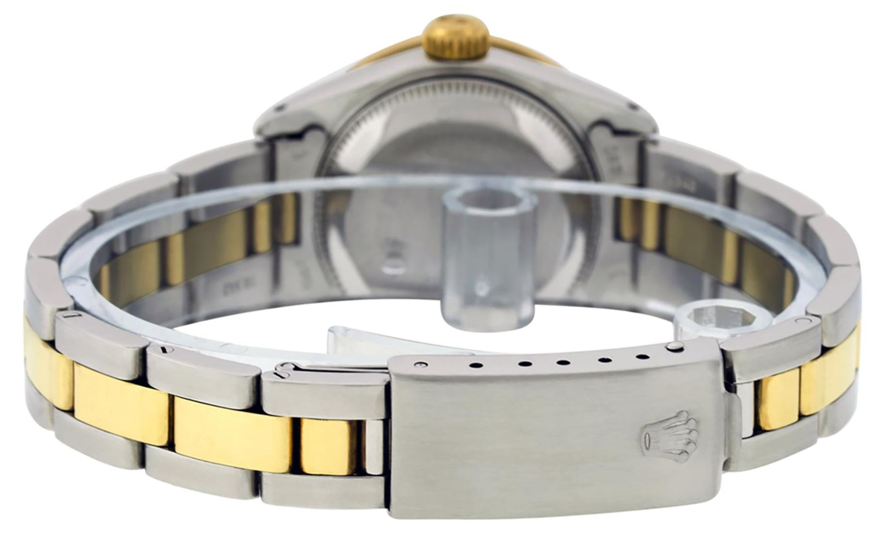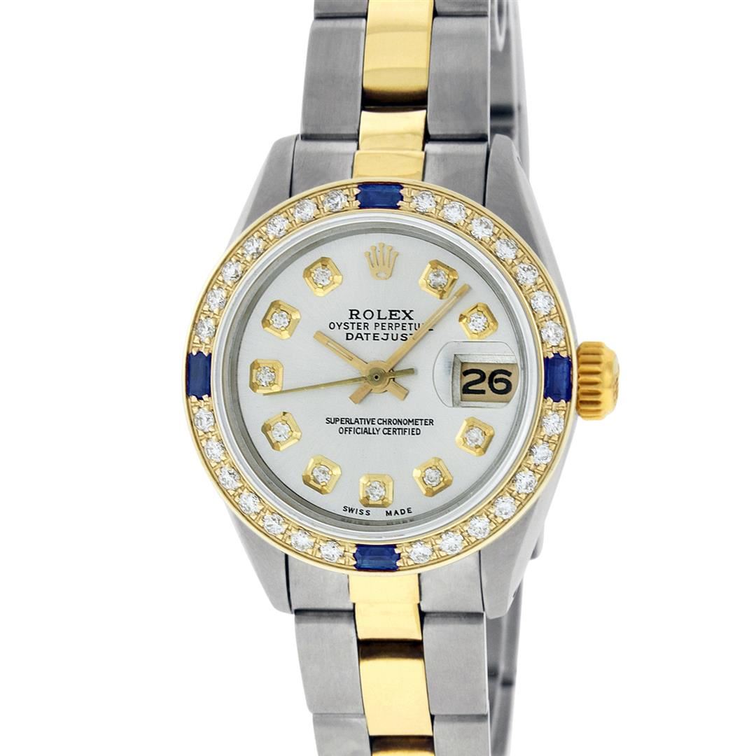 One Ladies Two Tone Yellow Gold Rolex Datejust Polished, Serviced & Electronically Tested, Yellow Gold & Stainless Steel Case: 26mm, Yellow Gold Crown, Custom Bezel: New 18K New Yellow Gold Beadset + Sapphire Diamond Bezel, STone Yellow Gold Count: 28 Diamonds + 4 Sapphires In Bezel, Total Weight.70 Carat, Clarity: SI-VS, Color: G to H. Custom Crystal: New Scratch Resistant Synthetic Sapphire Cyclops Lens. Custom Hands: New Luminescent Hands. Movement: Automatic Winding Movement. Custom Dial: Silver With Diamond Hour Markers, Diamond Count: 10 Diamonds On Dial, Clarity: SI-VS, Color: VS2. Date Window: 3 O'Clock Position Date Display, Model: Datejust. Condition: G-6 Extra Fine. Bracelet: Two Tone Yellow Gold Yellow Gold & Stainless Steel Oyster Band. Bright Polish. 6.0 Inch Length, Adjustable. Standard Clasp, With Rolex Logo. This Watch Has Been Serviced Time Tested And Is In Excellent Condition It Is Free Of All Scratches And Dents.