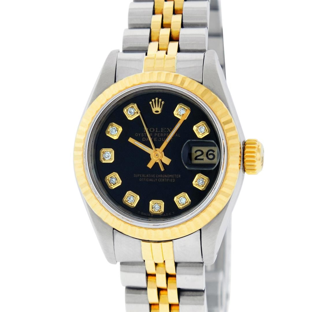 One Ladies Two Tone Yellow Gold Rolex Datejust Polished, Serviced & Electronically Tested, Yellow Gold & Stainless Steel Case: 26mm, Yellow Gold Crown, Bezel: Yellow Gold Fluted Bezel. Custom Crystal: New Acrylic Cyclops Lens. Custom Hands: New Luminescent Hands. Movement: Automatic Winding Movement. Custom Dial: Black With Diamond Hour Markers, Diamond Count: 10 Diamonds, Color: G to H, Clarity: VS2-SI1. Date Window: 3 O'Clock Position Date Display, Model: Datejust. Condition: G-6 Extra Fine. Bracelet: Two Tone Yellow Gold Yellow Gold & Stainless Steel Jubilee Band. Bright Polish. 6.0 Inch Length, Adjustable. Standard Clasp, With Rolex Logo. This Watch Has Been Serviced Time Tested And Is In Excellent Condition It Is Free Of All Scratches And Dents.
