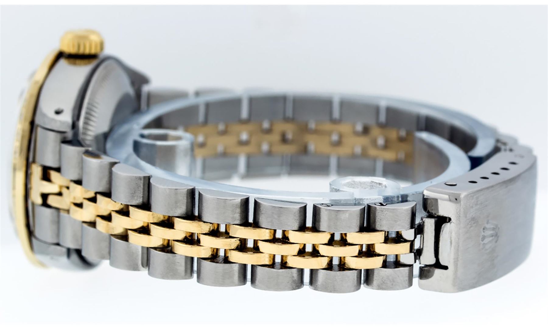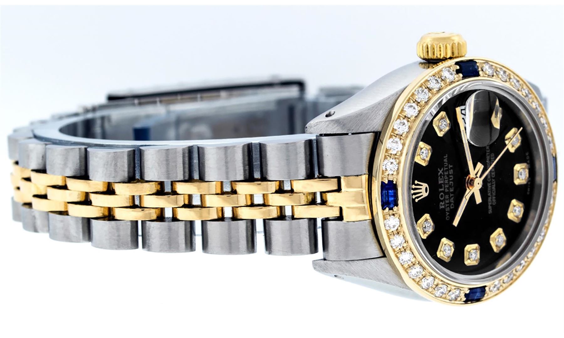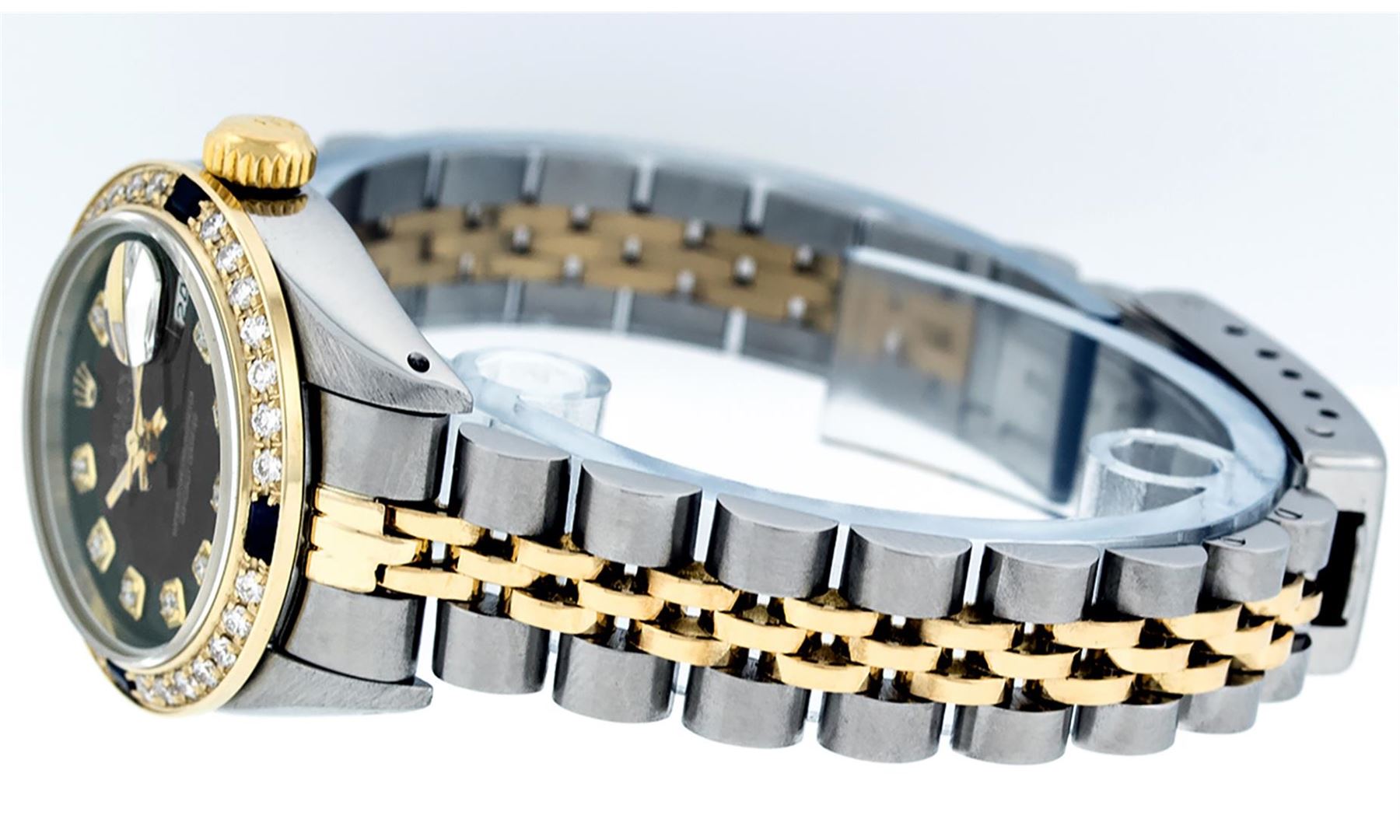 One Ladies Two Tone Yellow Gold Rolex Datejust Polished, Serviced & Electronically Tested, Yellow Gold & Stainless Steel Case: 26mm, Yellow Gold Crown, Custom Bezel: New 18K Yellow Gold Sapphire Beadset Diamond Bezel, Diamond + Gem Count: 28 Diamonds + 4 Sapphires, Total Weight.70 Carat, Clarity: SI-VS, Color: G to H. Custom Crystal: New Scratch Resistant Synthetic Sapphire Cyclops Lens. Custom Hands: New Luminescent Hands. Movement: Automatic Winding Movement. Custom Dial: Black Diamond Dial. Date Window: 3 O'Clock Position Date Display, Model: Datejust, Condition: G-6 Extra Fine. Bracelet: Two Tone Yellow Gold Yellow Gold & Stainless Steel Jubilee Band. Bright Polish. 6.0 Inch Length, Adjustable. Standard Clasp, With Rolex Logo. This Watch Has Been Serviced Time Tested And Is In Excellent Condition It Is Free Of All Scratches And Dents.