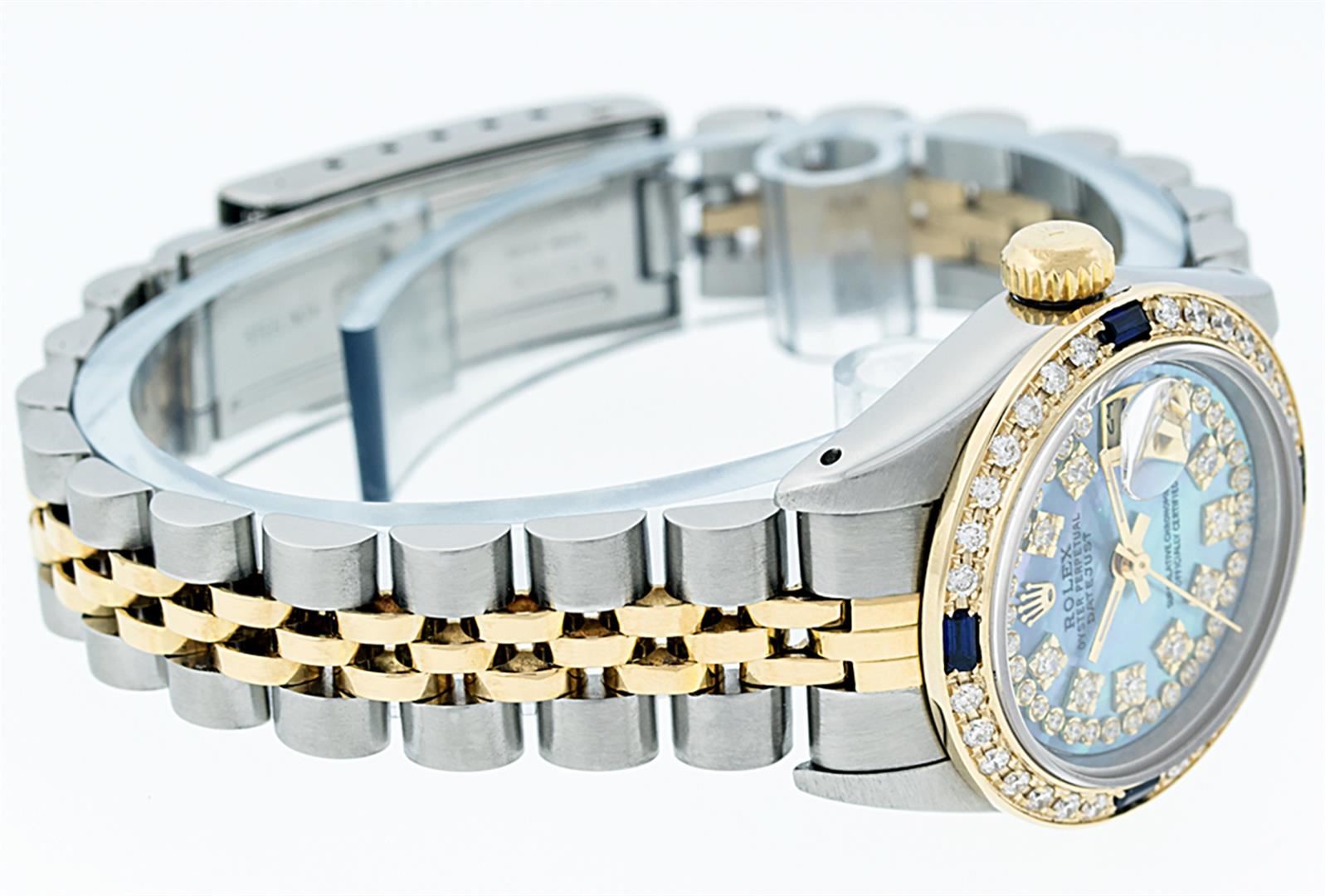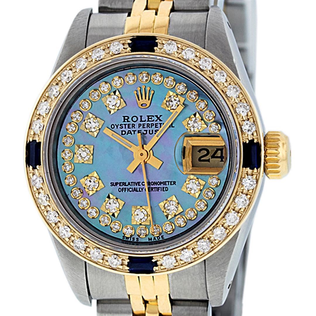One Ladies Two Tone Yellow Gold Rolex Datejust Polished, Serviced & Electronically Tested, Yellow Gold & Stainless Steel Case: 26mm, Yellow Gold Crown, Custom Bezel: New 18K New Yellow Gold Beadset + Sapphire Diamond Bezel, STone Yellow Gold Count: 28 Diamonds + 4 Sapphires In Bezel, Total Weight.70 Carat, Clarity: SI-VS, Color: G to H. Custom Crystal: New Scratch Resistant Synthetic Sapphire Cyclops Lens. Custom Hands: New Luminescent Hands. Movement: Automatic Winding Movement. Custom Dial: Blue Mother Of Pearl With String Single Cut Diamond Hour Markers, Diamond Count: 43 Diamonds In Dial, Clarity: SI-VS, Color: VS2. Date Window: 3 O'Clock Position Date Display, Model: Datejust. Condition: G-6 Extra Fine. Bracelet: Two Tone Yellow Gold Yellow Gold & Stainless Steel Jubilee Band. Bright Polish. 6.0 Inch Length, Adjustable. Standard Clasp, With Rolex Logo. This Watch Has Been Serviced Time Tested And Is In Excellent Condition It Is Free Of All Scratches And Dents.