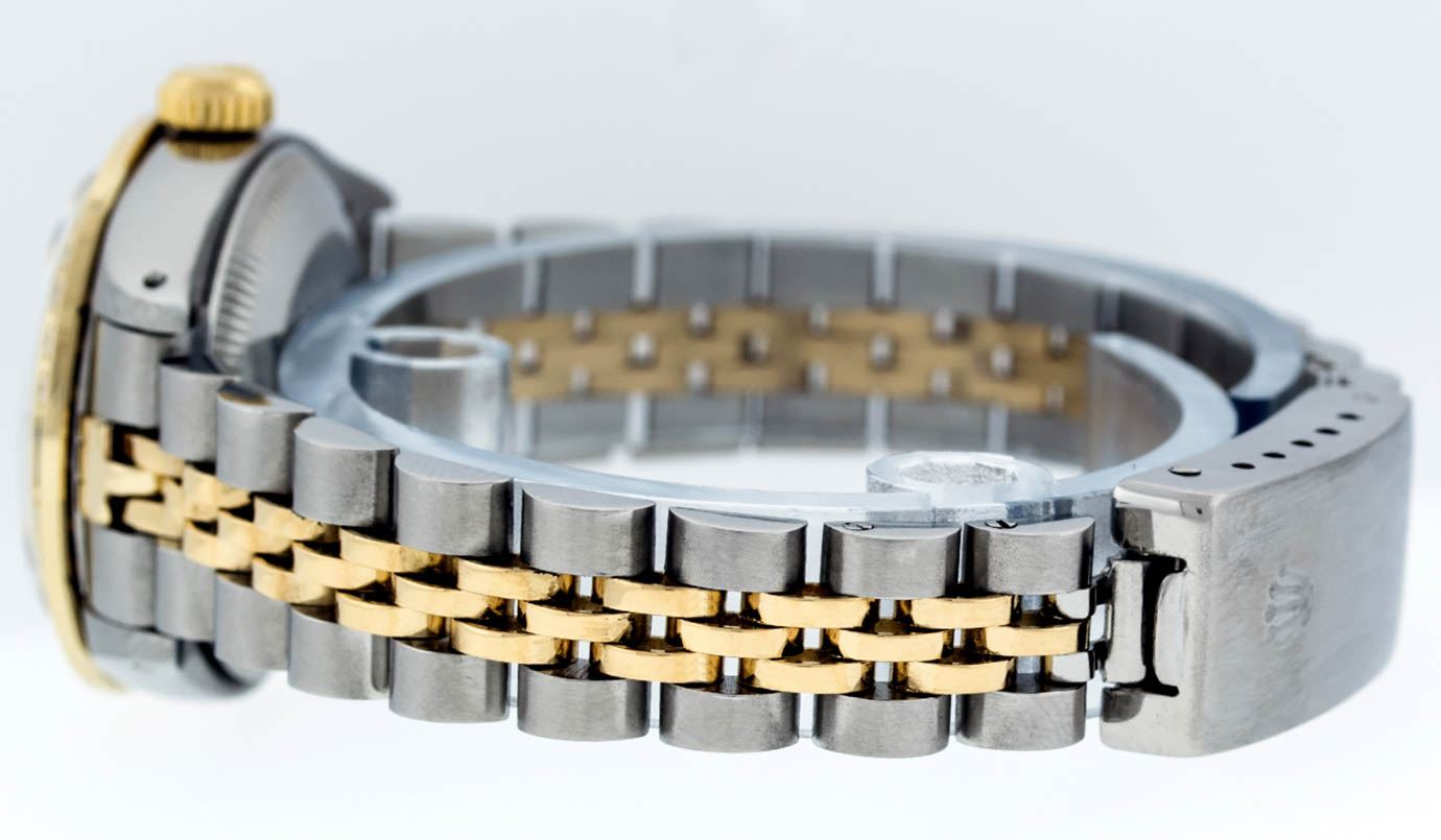 One Ladies Two Tone Yellow Gold Rolex Datejust Polished, Serviced & Electronically Tested, Yellow Gold & Stainless Steel Case: 26mm, Yellow Gold Crown, Custom Bezel: 18K Yellow Gold Sapphire Beadset Diamond Bezel, Diamond Count: 28 Diamonds + 4 Sapphires. Total Weight.70 Carat, Clarity: Si-VS, Color: G to H. Custom Crystal: New Synthetic Sapphire Cyclops Lens. Custom Hands: New Luminescent Hands. Movement: Automatic Winding Movement. Custom Dial: Blue Mother Of Pearl With String Diamond Hour Markers. Diamond Count: 43 Diamonds In Dial, Clarity: Si-VS, Color: G to H. Date Window: 3 O'Clock Position Date Display, Non Quickset, Model: Datejust. Condition: G-6 Extra Fine. Bracelet: Two Tone Yellow Gold Yellow Gold & Stainless Steel Jubilee. Bright Polish. 6.0 Inch Length, Adjustable. Standard Clasp, With Rolex Logo.