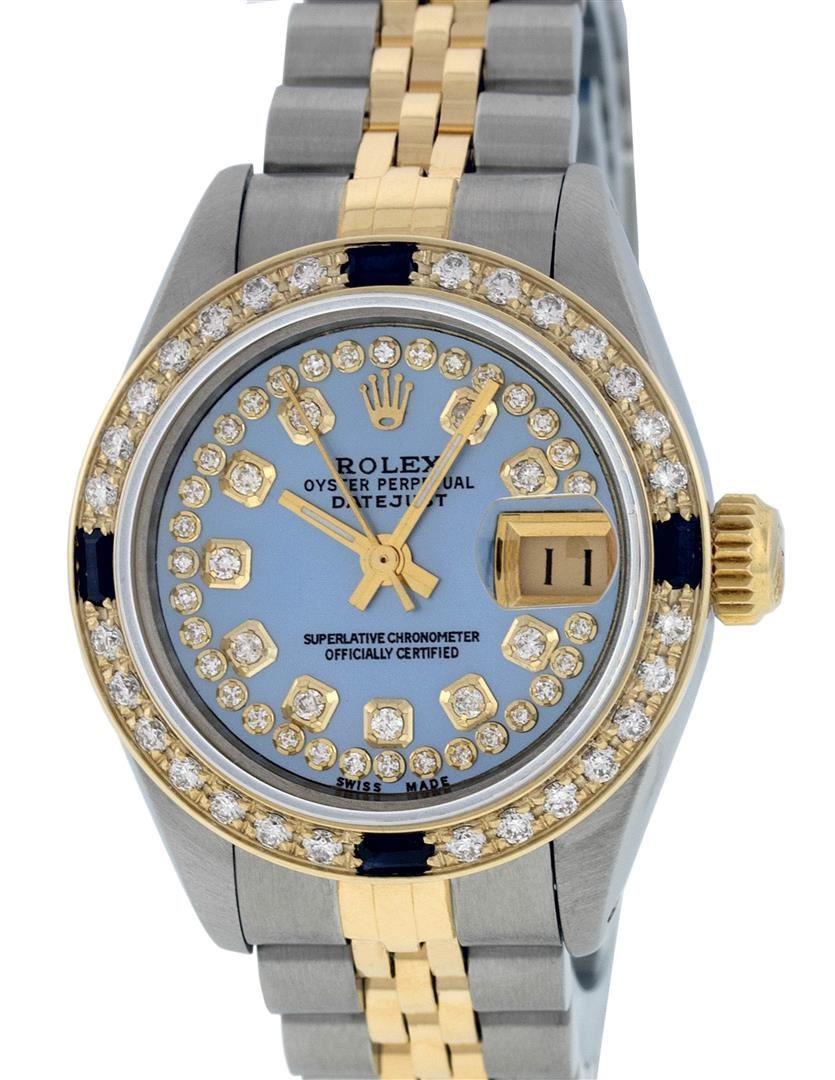 One Ladies Two Tone Yellow Gold Rolex Datejust Polished, Serviced & Electronically Tested, Yellow Gold & Stainless Steel Case: 26mm, Yellow Gold Crown, Custom Bezel: 18K Yellow Gold Sapphire Beadset Diamond Bezel, Diamond Count: 28 Diamonds + 4 Sapphires. Total Weight.70 Carat, Clarity: Si-VS, Color: G to H. Custom Crystal: New Synthetic Sapphire Cyclops Lens. Custom Hands: New Luminescent Hands. Movement: Automatic Winding Movement. Custom Dial: Blue Mother Of Pearl With String Diamond Hour Markers. Diamond Count: 43 Diamonds In Dial, Clarity: Si-VS, Color: G to H. Date Window: 3 O'Clock Position Date Display, Non Quickset, Model: Datejust. Condition: G-6 Extra Fine. Bracelet: Two Tone Yellow Gold Yellow Gold & Stainless Steel Jubilee. Bright Polish. 6.0 Inch Length, Adjustable. Standard Clasp, With Rolex Logo.
