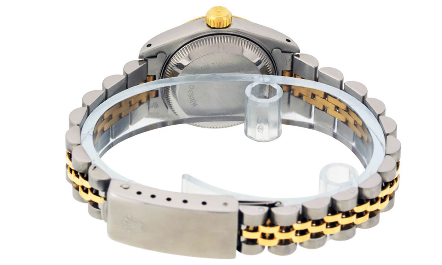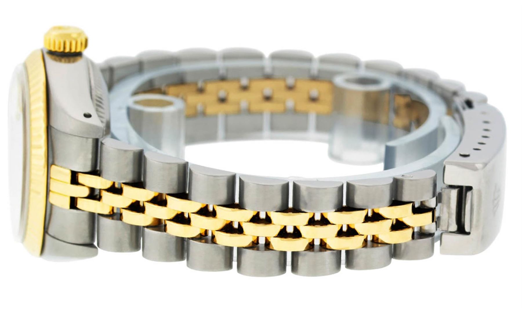 One Ladies Two Tone Yellow Gold Rolex Datejust Polished, Serviced & Electronically Tested, Yellow Gold & Stainless Steel Case: 26mm, Yellow Gold Crown, Bezel: Yellow Gold Fluted Bezel. Custom Crystal: Acrylic Cyclops Lens. Custom Hands: New Luminescent Hands. Movement: Automatic Winding Movement. Dial: Champagne Index With Luminecent Dots. Date Window: 3 O'Clock Position Date Display, Model: Datejust. Condition: G-6 Extra Fine. Bracelet: Two Tone Yellow Gold Yellow Gold & Stainless Steel Jubilee. Bright Polish. 6.0 Inch Length, Adjustable. Standard Clasp, With Rolex Logo. This Watch Has Been Serviced Time Tested And Is In Excellent Condition It Is Free Of All Scratches And Dents.