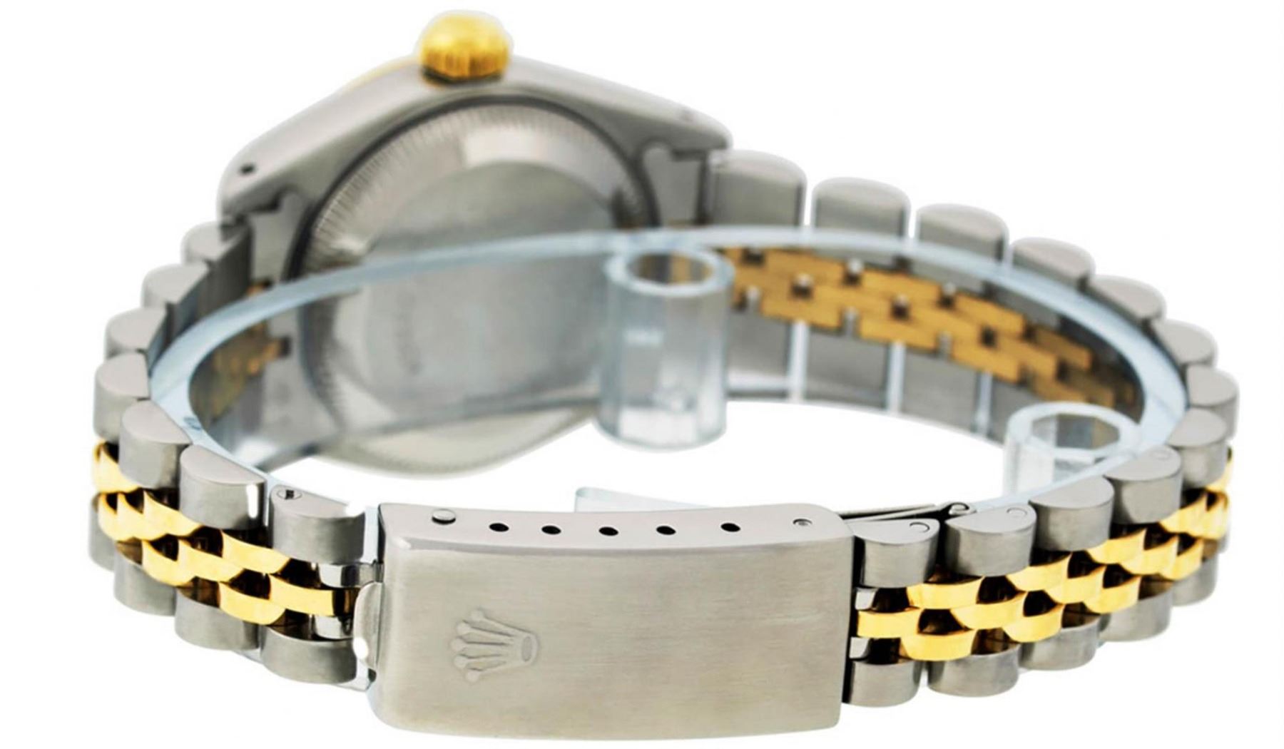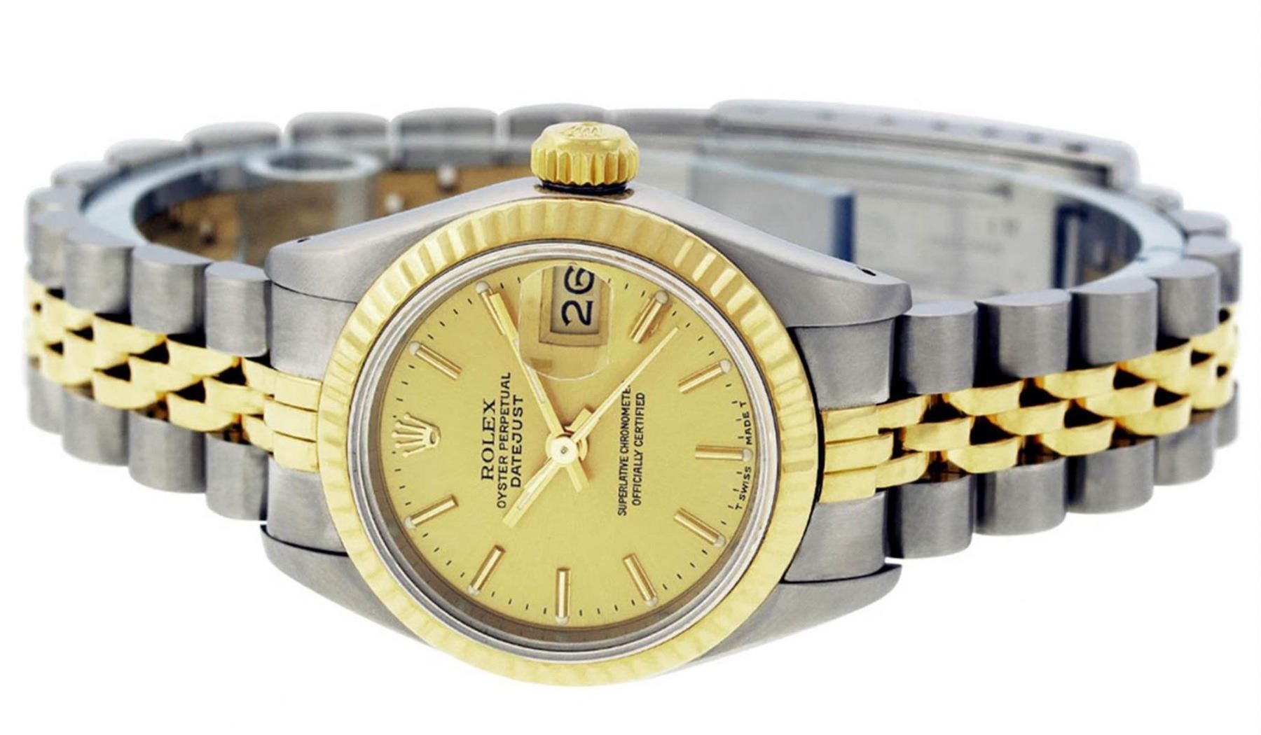 One Ladies Two Tone Yellow Gold Rolex Datejust Polished, Serviced & Electronically Tested, Yellow Gold & Stainless Steel Case: 26mm, Yellow Gold Crown, Bezel: Yellow Gold Fluted Bezel. Custom Crystal: Acrylic Cyclops Lens. Custom Hands: New Luminescent Hands. Movement: Automatic Winding Movement. Dial: Champagne Index With Luminecent Dots. Date Window: 3 O'Clock Position Date Display, Model: Datejust. Condition: G-6 Extra Fine. Bracelet: Two Tone Yellow Gold Yellow Gold & Stainless Steel Jubilee. Bright Polish. 6.0 Inch Length, Adjustable. Standard Clasp, With Rolex Logo. This Watch Has Been Serviced Time Tested And Is In Excellent Condition It Is Free Of All Scratches And Dents.