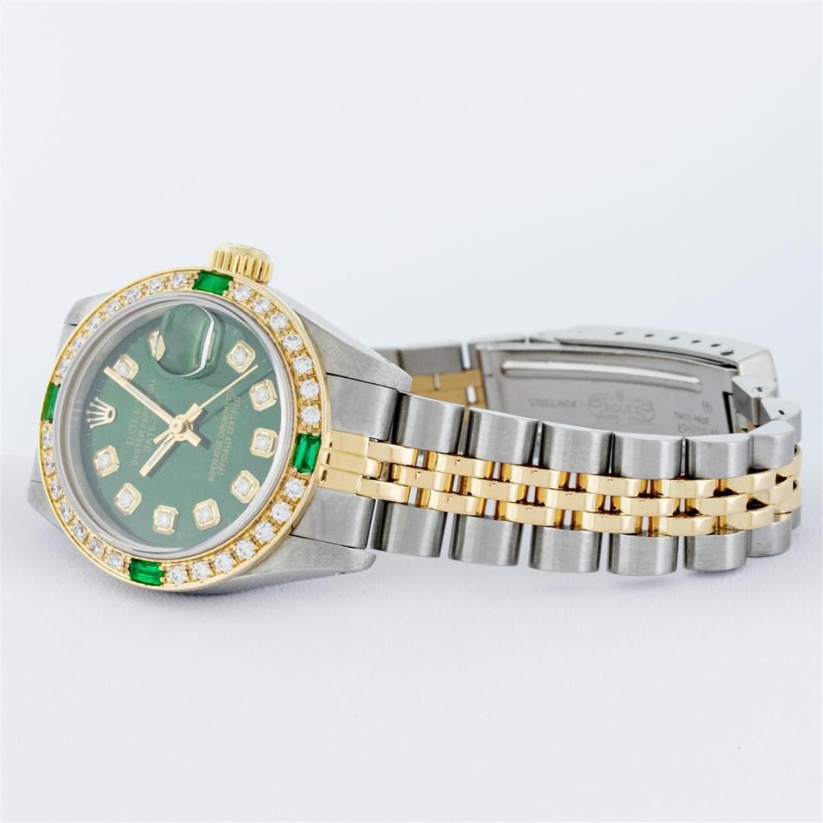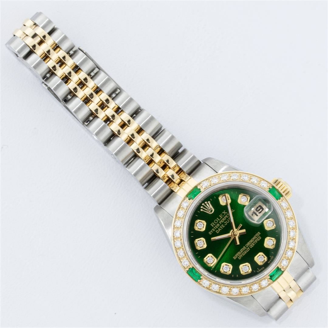 One Ladies Two Tone Yellow Gold Rolex Datejust Polished, Serviced & Electronically Tested, Yellow Gold & Stainless Steel Case: 26mm, Yellow Gold Crown, Custom Bezel: New 18K Yellow Gold Emerald Beadset Diamond Bezel, Diamond + Gem Count: 28 Diamonds + 4 Emeralds Total Weight.70 Carat, Clarity: SI-VS, Color: G to H. Custom Crystal: New Scratch Resistant Synthetic Sapphire Cyclops Lens. Custom Hands: New Luminescent Hands. Movement: Automatic Winding Movement. Custom Dial: Green Dial Set With Diamond Hour Markers & Dash Track, Diamond Count: 10 Diamonds in Dial, G To H In Color, SI-VS Clarity. Date Window: 3 O'Clock Position Date Display, Model: Datejust, Condition: G-6 Extra Fine. Bracelet: Two Tone Yellow Gold Yellow Gold & Stainless Steel Jubilee. Bright Polish. 6.0 Inch Length, Adjustable. Standard Clasp, With Rolex Logo. This Watch Has Been Serviced Time Tested And Is In Excellent Condition It Is Free Of All Scratches And Dents.