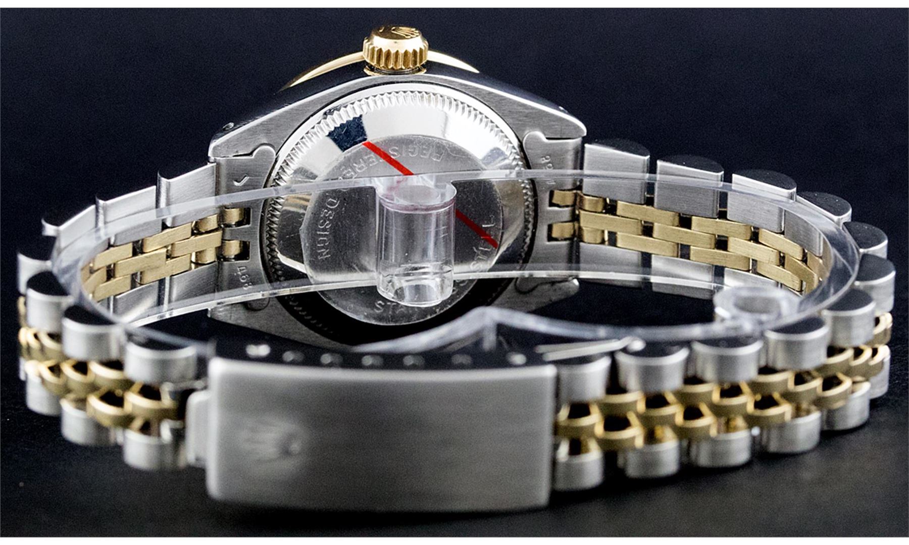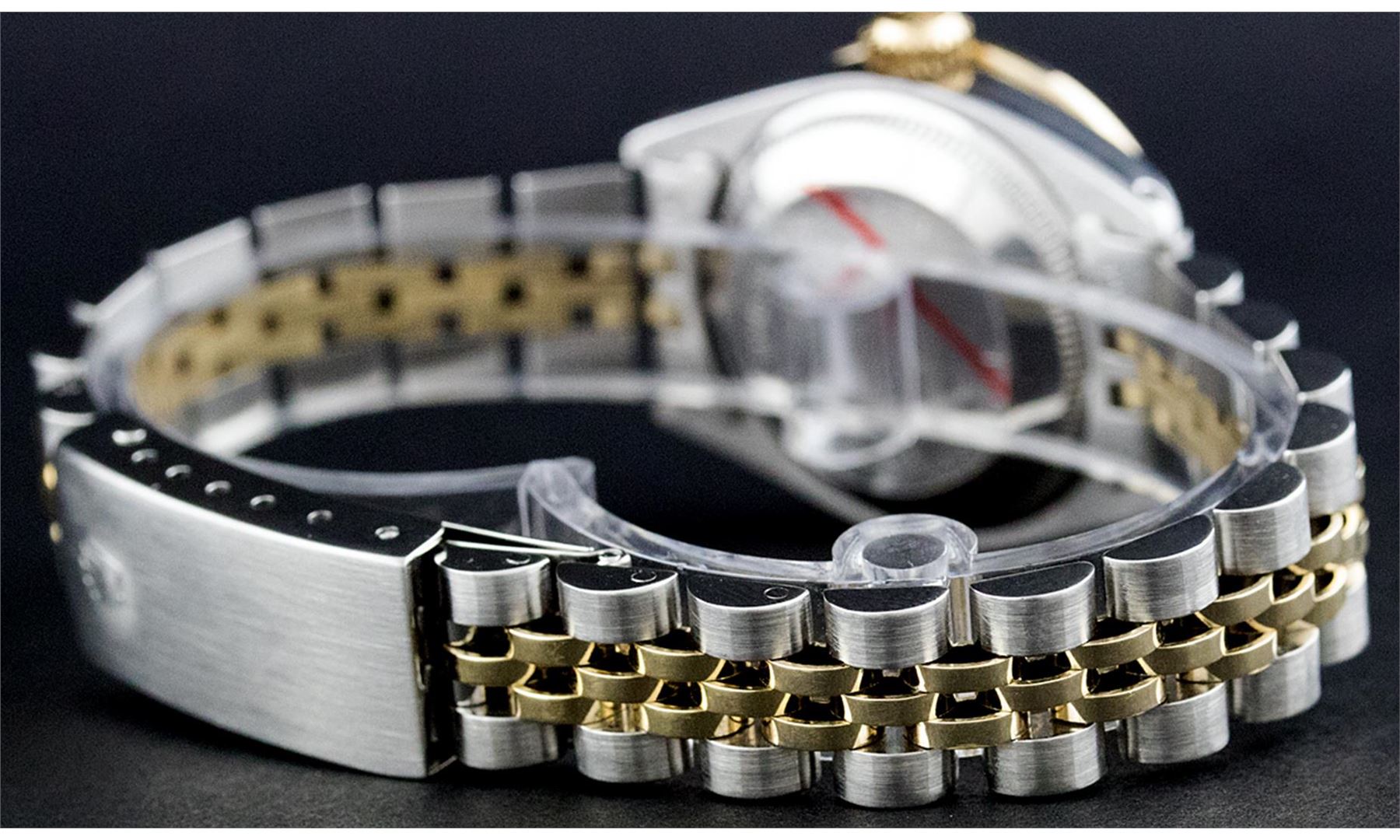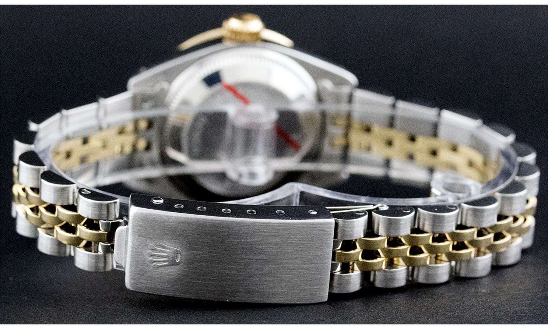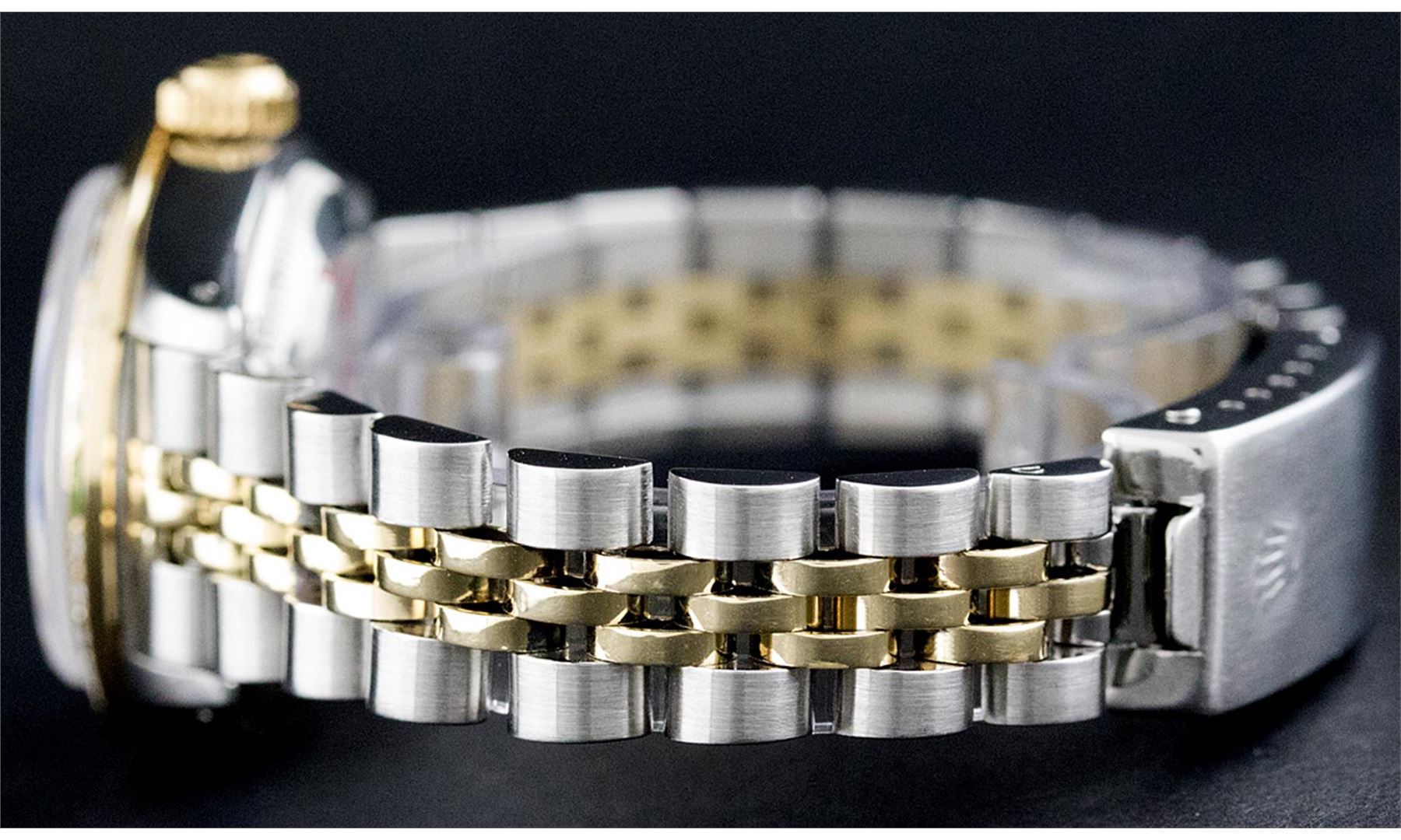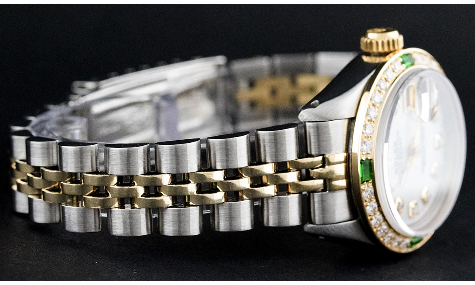 One Ladies Two Tone Yellow Gold Rolex Datejust Polished, Serviced & Electronically Tested, Yellow Gold & Stainless Steel Case: 26mm, Yellow Gold Crown, Custom Bezel: New 18K Yellow Gold Emerald Beadset Diamond Bezel, Diamond + Gem Count: 28 Diamonds + 4 Emeralds, Total Weight.70 Carat, Clarity: SI-VS, Color: G to H. Custom Crystal: New Scratch Resistant Synthetic Sapphire Cyclops Lens. Custom Hands: New Luminescent Hands. Movement: Automatic Winding Movement. Custom Dial: Mother Of Pearl Set With Diamond Hour Markers & Dash Track, Diamond Count: 10 Diamonds On Dial, G To H In Color, SI-VS Clarity. Date Window: 3 O'Clock Position Date Display, Model: Datejust, Condition: G-6 Extra Fine. Bracelet: Two Tone Yellow Gold Yellow Gold & Stainless Steel Jubilee Band. Bright Polish. 6.0 Inch Length, Adjustable. Standard Clasp, With Rolex Logo. This Watch Has Been Serviced Time Tested And Is In Excellent Condition It Is Free Of All Scratches And Dents.
